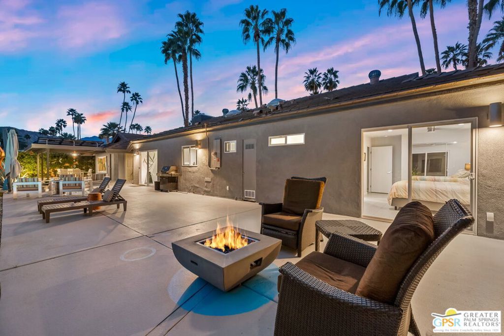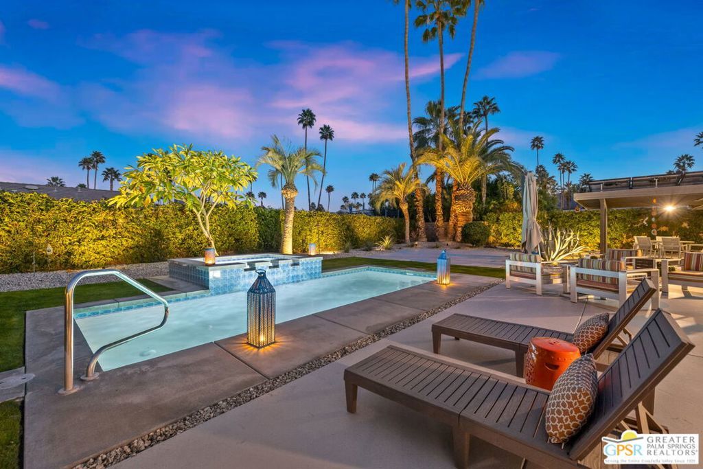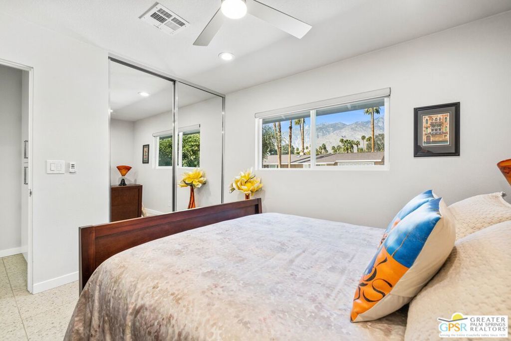 Welcome to this meticulously renovated modern home in one of South Palm Springs' most sought-after neighborhoods, Los Compadres. Situated on land you own, this home features a comprehensive floor-to-ceiling transformation, delivering high-end finishes and remarkable outdoor living spaces with breathtaking mountain views to the East, South, and West. It truly shows like a model! Step inside to discover an airy, open-concept floor plan bathed in natural light. The home boasts sleek modern cabinetry, Cambria quartz countertops, and terrazzo tile flooring throughout. The resort-style backyard is an entertainer's dream, featuring a sparkling pool, a separate in-ground spa, multiple outdoor living and dining areas, lush landscaping, and panoramic, wire-free mountain views. Additional highlights include brand-new dual-pane windows with custom window treatments (installed in 2022), updated electrical wiring and plumbing, as well as new interior and exterior doors. The home also features a newly installed HVAC system and paid-off solar panels for energy efficiency. There's no HOA, and the property qualifies for a Vacation Rental Certificate, making it an excellent opportunity for short-term rentals! The chef-inspired kitchen seamlessly opens to the living and dining areas, both of which offer sweeping views and easy access to the outdoor space. The backyard is beautifully framed by colorful, low-maintenance landscaping, creating a serene environment for relaxation. The primary ensuite retreat offers stunning views, direct access to the private backyard, and a spa-inspired bathroom with modern cabinetry, Cambria quartz countertops, dual sinks, and a large walk-in shower with a clerestory window, frameless glass, and dual showerheads. The two west-facing guest bedrooms are equally impressive, with mountain views, terrazzo tile flooring, and convenient access to the beautifully appointed hallway bathroom, featuring modern cabinetry, Cambria quartz countertops, dual sinks, and a shower/tub combination with dual showerheads. Additional features include an indoor laundry area, making this home as practical as it is stylish.