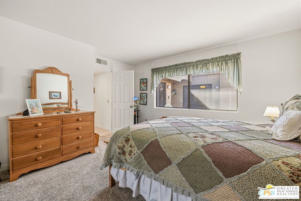 Wow! Framed by mountain views and set along a wide par 5 fairway, this fabulous opportunity at the West Gate of Cathedral Canyon Country Club in South Palm Springs captures the relaxed elegance of desert living with over 1800 square feet of comfort and style. Two large patios take full advantage of sweeping golf course and mountain views, creating a stunning backdrop for outdoor entertaining and everyday enjoyment. Inside, the main living areas feature vaulted and beamed ceilings, a fireplace, and a wet bar that enhance the open, light-filled design. The spacious kitchen with breakfast area opens to the courtyard and offers generous workspace for everyday living and entertaining. The primary suite includes an added walk-in closet and a beautifully updated bath. The guest suite offers comfort and privacy, while the den or office also opens to the courtyard for added light and inspiration. Skylights in both bathrooms enhance the bright, open feel. Direct two-car garage access. Thoughtful upgrades and pride of ownership are evident throughout. Community pool and spa are just a short hop away. Enjoy country club living in a highly desirable South Palm Springs location with reasonable HOA fees and a land lease that keeps ownership simple. Take the Matterport Virtual Tour for a better sense of flow.