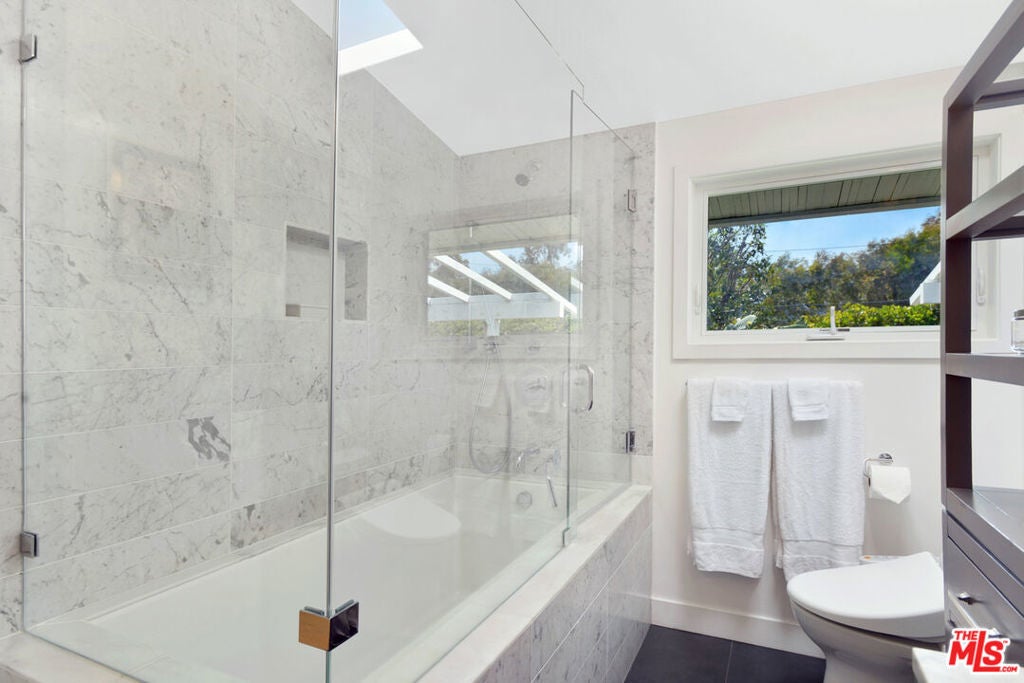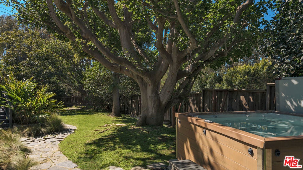 The perfect house for entertaining, this gated, updated, immaculate single-level Point Dume lease has high ceilings, hardwood floors, great flow, attractive contemporary furnishings, and loads of light, plus lots of decks, patio, and garden space for dining and entertaining. Spacious great room includes family room with FP, skylights, built-in bookshelves, flat-screen TV, dining area, island kitchen, and windows onto the backyard. Other side of two-way FP is a formal seating area, with windows and doors onto large wood deck, and guest suite off kitchen with doors to backyard. Other end of the house, two steps lead up to three add'l bedrooms, each with a deck, including master, with large wood deck, flat-screen TV, spa-like bath. Verdant, peaceful, manicured grounds with large trees, grassy lawn, new pool, flagstone patio with bbq, fire pit sitting area, trampoline, & hot tub. Two-car garage & ample guest parking space. Riviera II beach key to Little Dume included. Available summer 2026; June-August 20th.