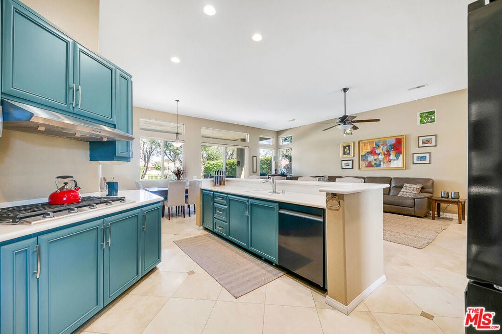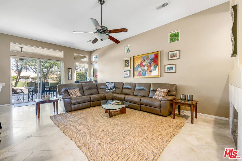 Major Price Reduction! Don't miss this incredible opportunity - now priced to sell and ready for its next owner. Live behind the gates of the prestigious La Quinta Fairways. This beautifully upgraded 3-bedroom, 2.5-bath home offers approximately 2,424 sq. ft. of refined desert living overlooking the 6th fairway of the Dunes Course. Enjoy sweeping golf course views framed by mature landscaping and trees that provide the perfect blend of beauty and privacy. Step inside to an elegant, open floor plan featuring high ceilings, Travertine flooring, plantation shutters, and a dual-sided fireplace connecting the living and family rooms creating a warm and inviting atmosphere. The chef's kitchen is highlighted by Corian countertops and opens to a spacious dining area with sliding glass doors leading to the backyard retreat. The primary suite showcases a double-door entry, large wardrobe closet, and a spa-like en-suite bath with dual sinks. A rare and desirable feature, the office currently used as a fourth bedroom offers ideal guest accommodations or a flexible space for work or relaxation. The low-maintenance backyard is a true desert oasis, featuring a sparkling Pebble Tec pool and spa, new pool heater, covered patio, misting system, and cool deck perfect for entertaining or unwinding on warm desert evenings. Additional highlights include dual A/C units with Nest thermostats, ceiling fans throughout, a laundry room with sink, and a two-car garage with built-in cabinetry and space for a golf cart or workshop. La Quinta Fairways is a small, guard-gated community offering low HOA dues that include cable, internet, front yard landscaping, and 24-hour security.