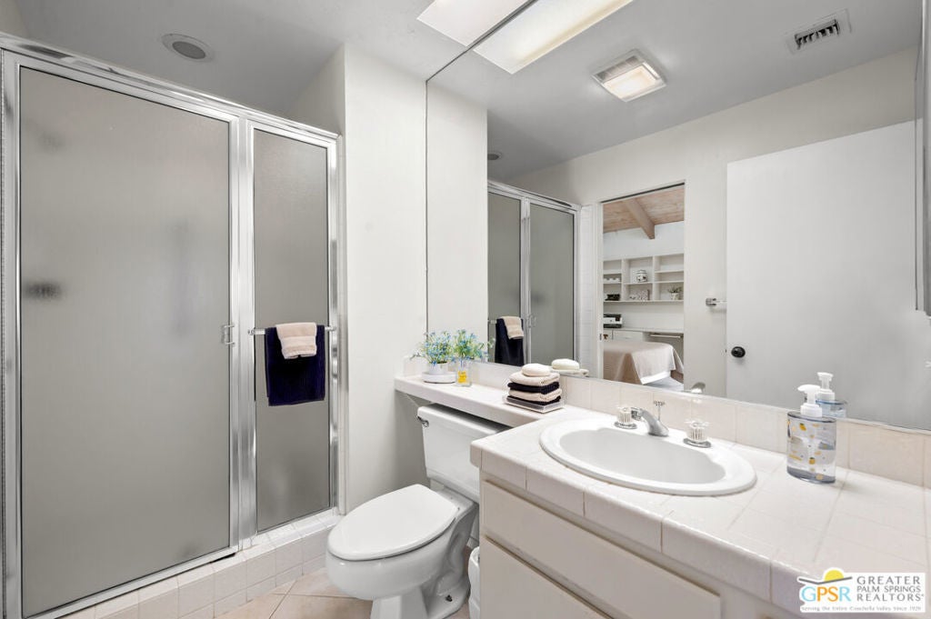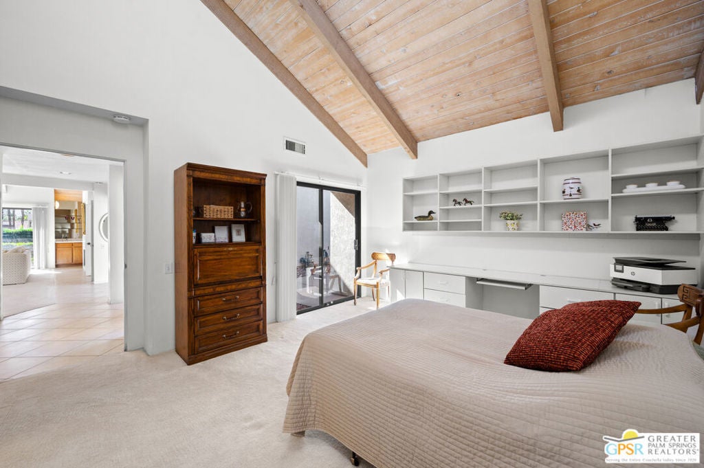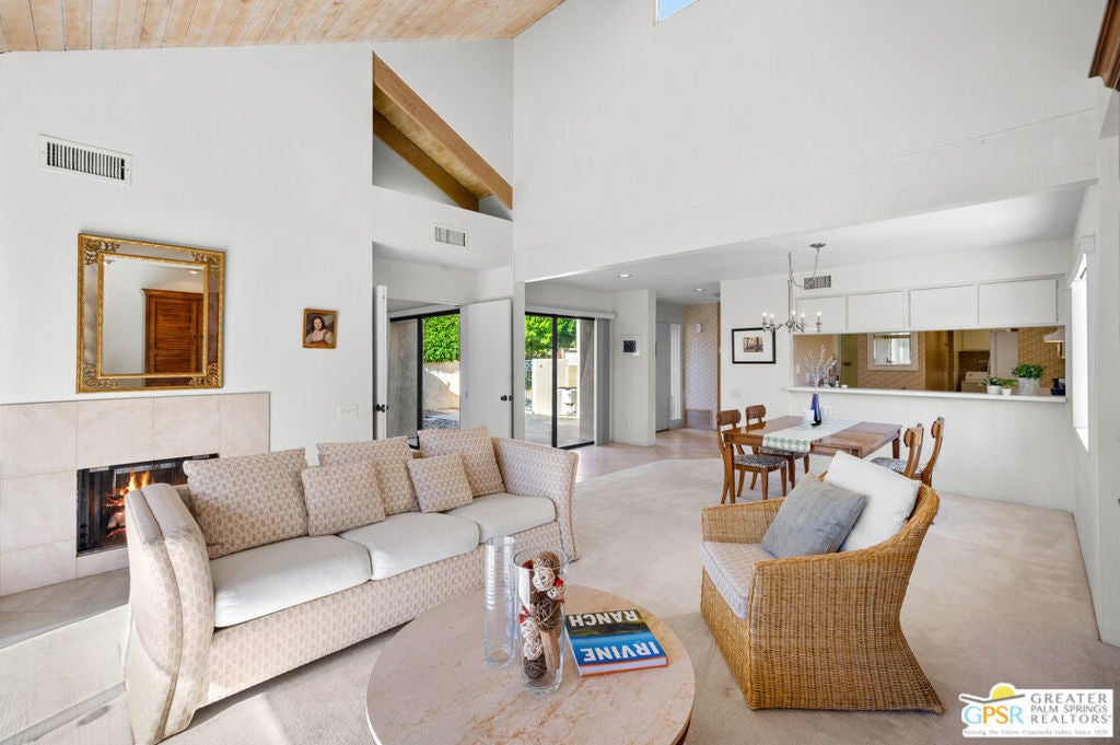 Desirable Mission Hills condo located in the "Racquet Club Estates HOA" perfectly situated for mountain and greenbelt views. The single-story residence, with vaulted and beamed ceilings, allows an abundance of natural light throughout and lends a spacious open feel. Two bedrooms, on opposite sides of each other, both feature vaulted ceilings and en-suite bathrooms; The primary suite offers dual separate vanities, bathtub and a gas fireplace. This model has a private gated courtyard and a rear southwest facing patio that opens onto a green belt. Mission Hills Fitness Center, tennis and pickle ball courts are a stone's throw away. Mission Hills Country Club offers many variations of membership levels to enjoy all the amenities the community has to offer. Welcome to Rancho Mirage! Why aren't you living here yet?