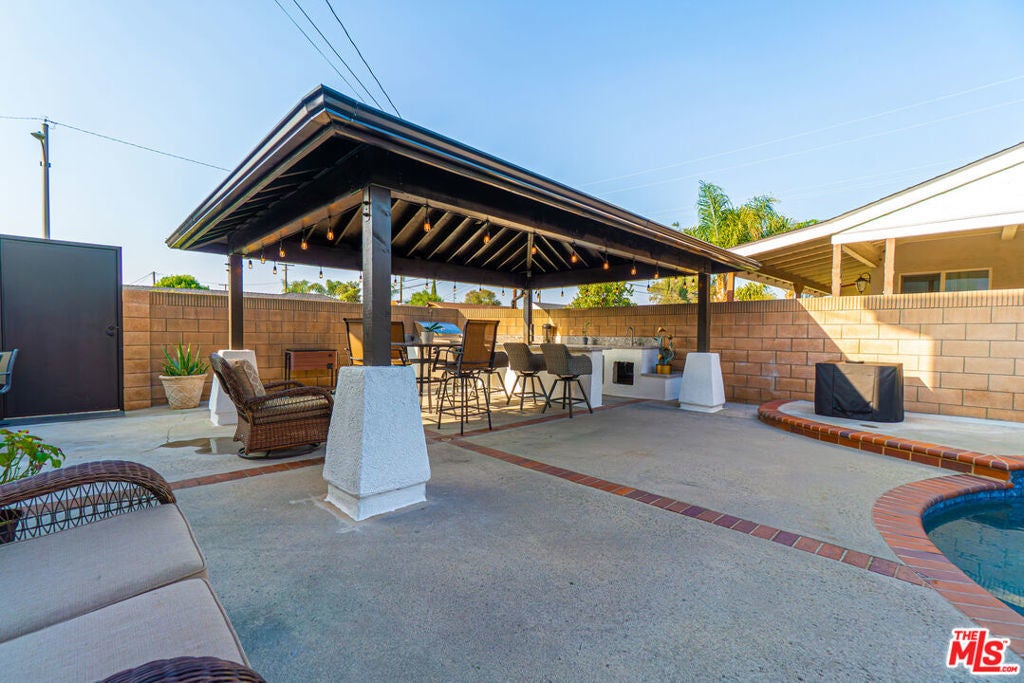 Welcome to your dream home in the heart of Downey! This impressive two-story residence offers over 3,400 sq. ft. of living space with 4 bedrooms and 3 bathrooms, perfectly designed for multigenerational living and everyday comfort. Nestled in a quiet, well-established neighborhood, this home strikes the perfect balance between privacy and convenience. Step into the foyer where soaring high ceilings and natural light create a warm, inviting atmosphere. The grand living room is ideal for entertaining and hosting, just adjacent is an at home office ideal for those working from home. The spacious family room overlooks the sparkling pool and features a cozy fireplace, perfect for relaxing on cool fall and winter evenings. The chef's kitchen is both beautiful and functional, boasting abundant cabinetry, a large center island, and a breakfast bar ideal for casual dining or entertaining. Adjacent to the family room is a wet bar and sliding doors that lead directly to your private backyard oasis. Outdoors, enjoy year-round gatherings under the pergola with a built-in propane barbecue grill & refrigerator, overlooking the pool and Jacuzzi perfect for entertaining family and friends. One bedroom is conveniently located on the first floor, ideal for guests or extended family, while 3 additional bedrooms are upstairs including the primary suite, which features an en-suite bathroom with a spa-like soaking tub, dual sinks, and a walk-in closet. Additional highlights include central air and heating, a separate laundry room, recently refinished pool, new flooring throughout with direct access to the three-car garage, and thoughtful design elements throughout that make this home both elegant and practical. Located near top-rated schools, parks, and shopping, this Downey gem offers the space, amenities, and warmth every family deserves.