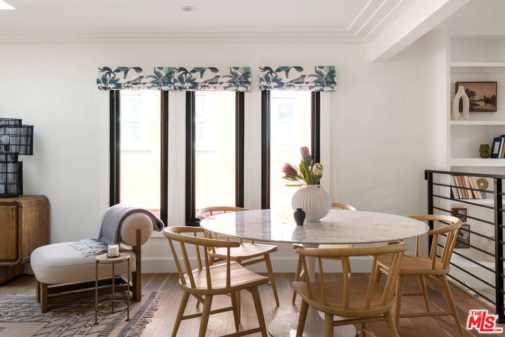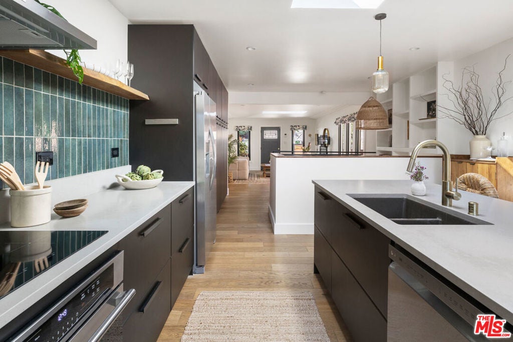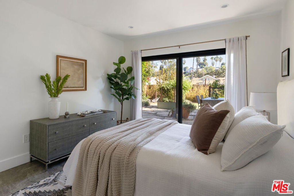 Settle into an effortless lifestyle with this updated Bungalow enjoying scenic palm and hillside views. A beautifully landscaped front yard with native California plantings welcomes your arrival. The open-plan living space is awash in natural light streaming in through the skylights, and flow is easy to the backyard; the open kitchen has stainless appliances, beautiful tilework, and a center island for meal prep and casual meals. Four bedrooms include a primary suite with double sinks, walk-in closets, and access to the breezy porch; smart built-in shelves line the staircase leading to two lower-level bedrooms. The outdoor space is organically composed with a covered dining area and a private backyard, a magical setting for entertaining with thriving vegetation, a fire-pit zone, and gorgeous vistas. Amenities include central AC, dedicated storage, laundry, and gated parking with EV charger. The prime location puts you close to everything great along Sunset, plus Silver Lake and Echo Park favorites including L&E Oyster, the Reservoir, Bar Bandini, and Van Leeuwen.