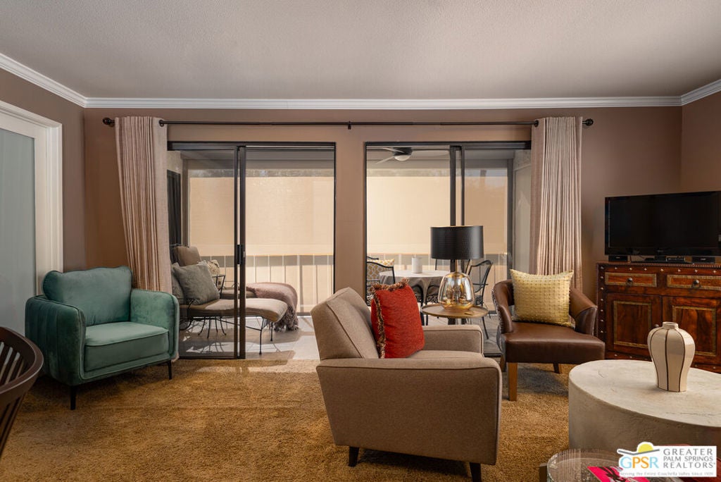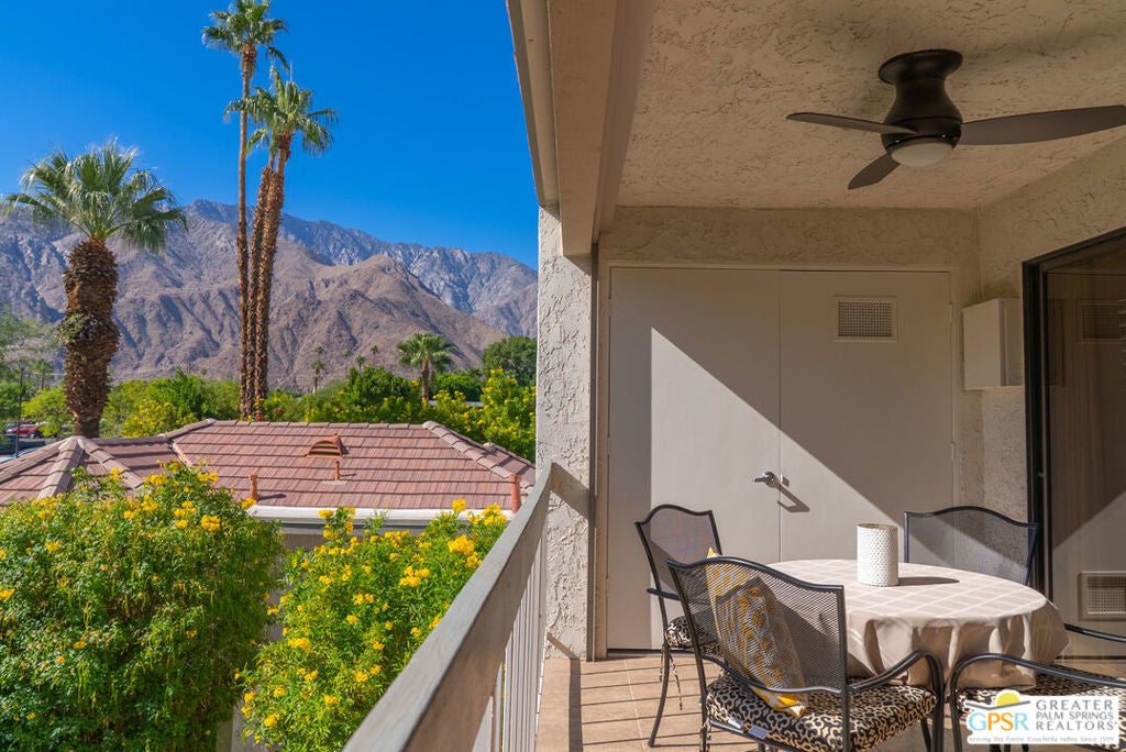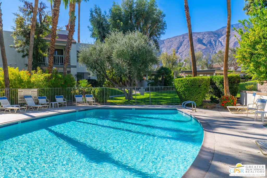 Set behind the gates of Riviera Gardens, a lush and well-kept community, this large south-facing 1-bedroom, 1-bathroom condo offers you access to the easy-going Palm Springs lifestyle at an incredibly accessible price. Set on fee simple land you own, the community is known for its mature landscaping, multiple pools and spas, and a location that keeps you close to downtown Palm Springs without being in the thick of it. Inside, the floor plan is spacious, efficient and inviting - perfect as a weekend escape, full-time home, or rental-friendly investment. The kitchen and living area are flooded with soft natural light and tremendous mountain views from nearly anywhere you sit. A south facing patio creates additional living space with built in motorized rolldown shades and mountain views. Bright, clean, and move-in ready this home is being sold turnkey furnished as well. With laundry in unit, assigned parking, and gated secure community access, the essentials are covered. It's the kind of place that lets you live simply, quietly, and just a few minutes from all the fun.