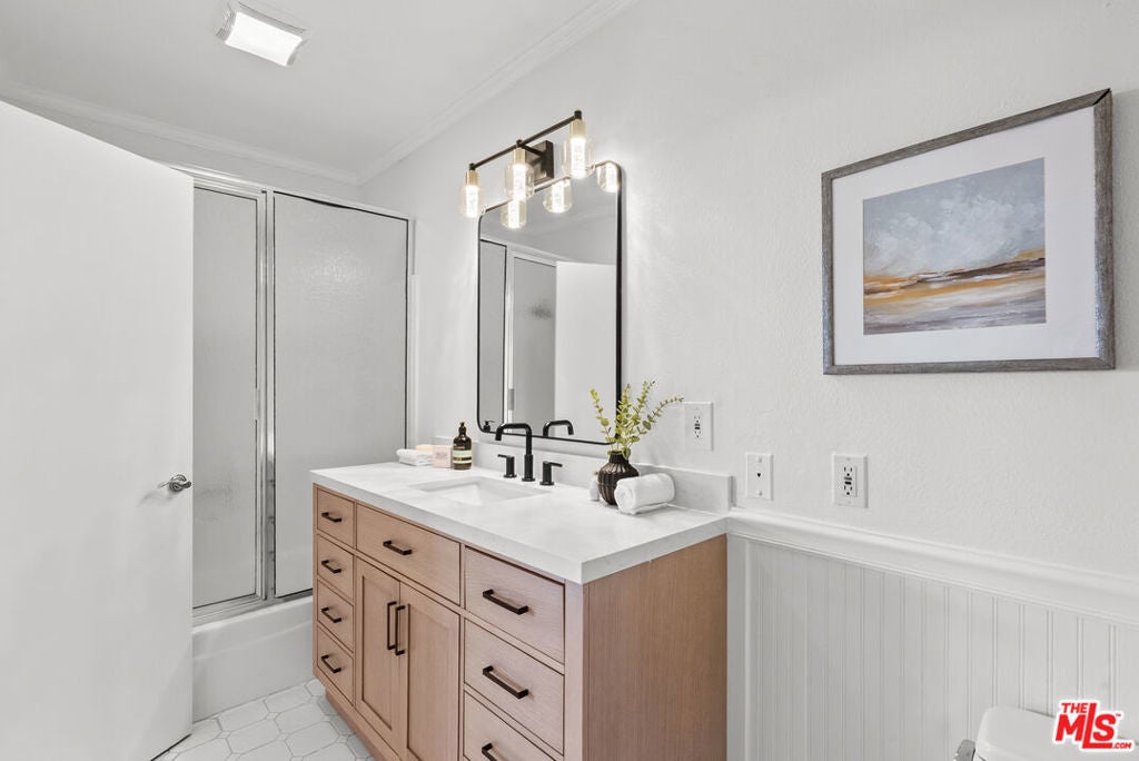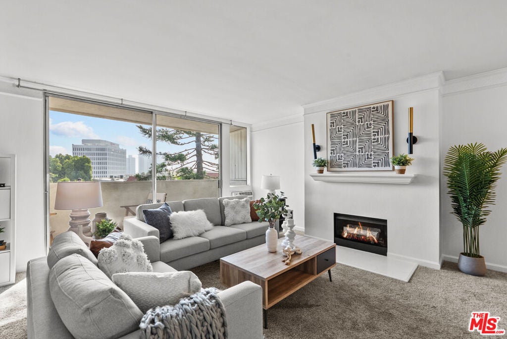 Located in one of Brentwood's premier residential pockets, this beautifully refreshed top-floor, one-bedroom home offers 852 square feet of bright, welcoming living space with treetop and city views. An open layout introduces a spacious living room with a sleek gas fireplace, crown molding, and oversized windows that fill the home with natural light. The dining area transitions into a newly updated kitchen featuring white shaker-style cabinetry, quartz-style countertops, a deep single-basin undermount sink, a new range, and a raised bar ideal for casual seating or entertaining. A private balcony extends from the main living area and provides a relaxing outdoor space framed by lush greenery with views of the Brentwood skyline. The generous bedroom offers a peaceful retreat with plush carpeting, a floor-to-ceiling window, and a large walk-in closet. The updated bathroom features a warm wood vanity, matte black fixtures, a full bath, and contemporary lighting. Community amenities include an on-site pool, a spa, outdoor lounge areas, and controlled access. The unit also offers two tandem covered parking spaces. This highly sought-after neighborhood is known for its refined lifestyle, with proximity to upscale shopping at the Brentwood Country Mart. Nearby cafes, boutiques along San Vicente, and cultural attractions such as the Getty Center further enhance the appeal. Brentwood's blend of luxury amenities, elegant surroundings, and everyday convenience continues to make it one of Los Angeles' most desirable places to call home.