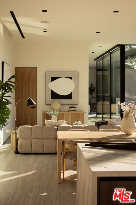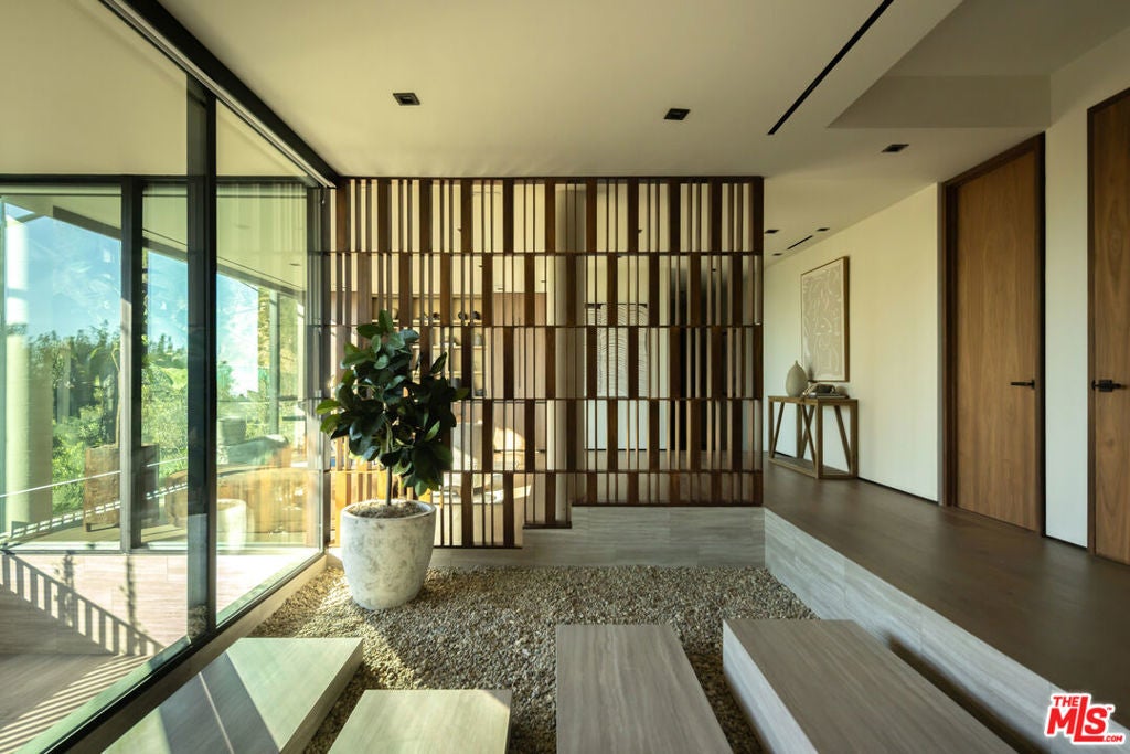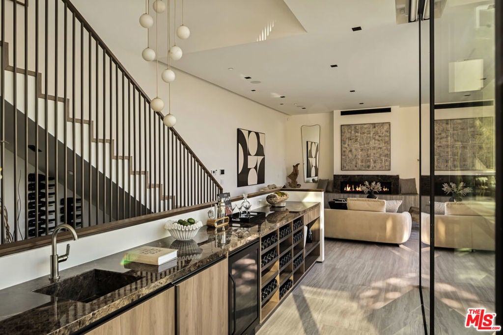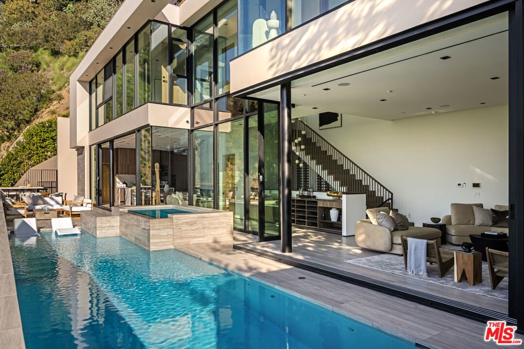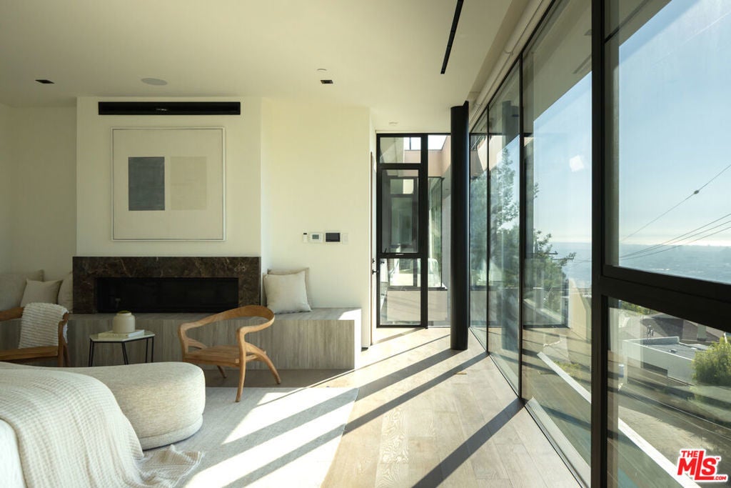 This newly constructed Classic Modern Hollywood Hills residence spans approximately 6,000 square feet and reflects a level of quality, design, and execution rarely found in new construction. Conceived and built by well known, experienced, design-driven team, the home emphasizes thoughtful architecture, refined materials, and seamless livability throughout. The floor plan offers four bedrooms plus a dedicated office, anchored by wide-plank walnut floors and travertine stone that bring warmth and cohesion to the interiors. The kitchen is outfitted with a full suite of Miele appliances. Floor-to-ceiling Fleetwood doors and windows frame sweeping ocean and city views while creating effortless indoor-outdoor flow. Every element of the home was carefully considered, from the proportions of the living spaces to the precision of the finishes. Amenities include an elevator, full smart-home integration, generous storage, wet bar, and wine refrigeration. A three-car garage with additional driveway parking an uncommon luxury in the Hills adds both convenience and functionality. Outdoor spaces are equally well executed, featuring a pool and spa, outdoor kitchen, full bar, fire pit, and a private pickleball court, all designed to maximize privacy, views, and year-round entertaining. This is a highly refined, turnkey offering that blends architectural integrity with modern luxury living in one of Los Angeles' most sought-after settings.