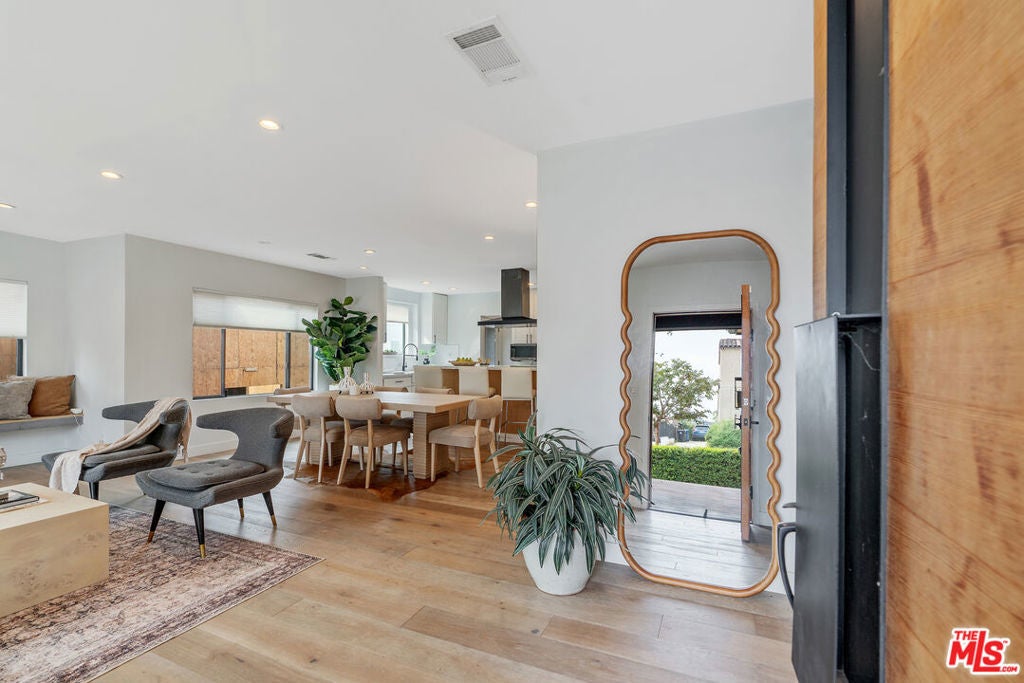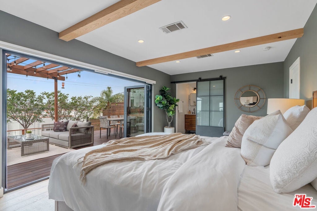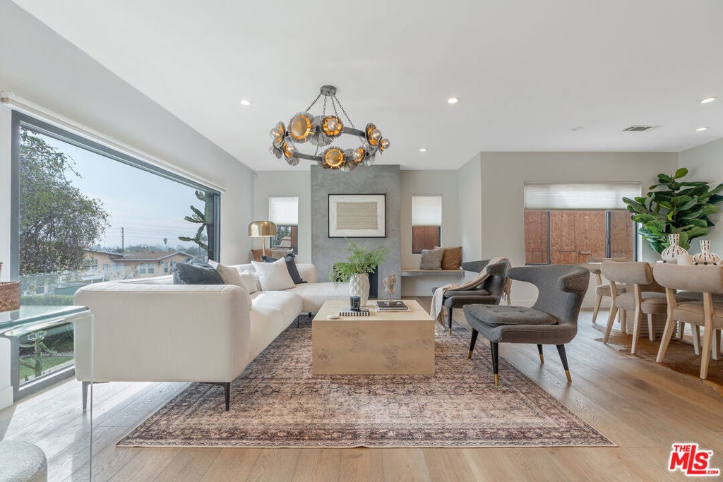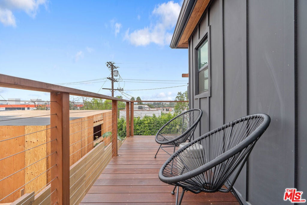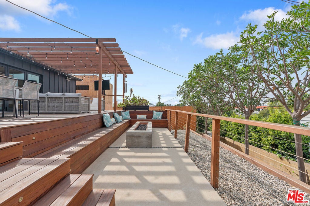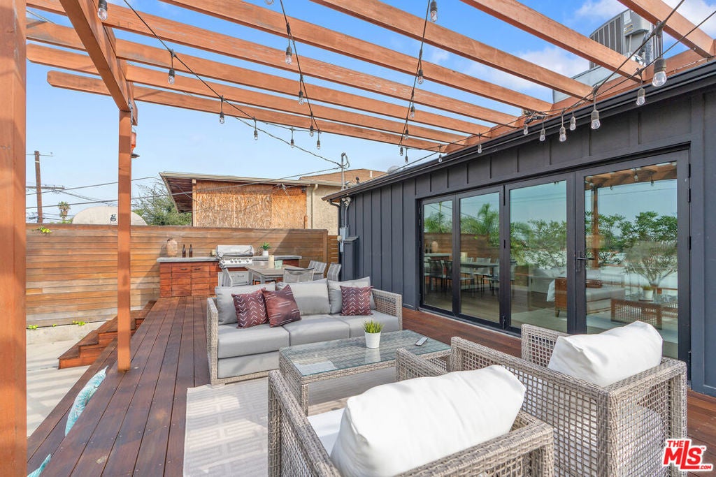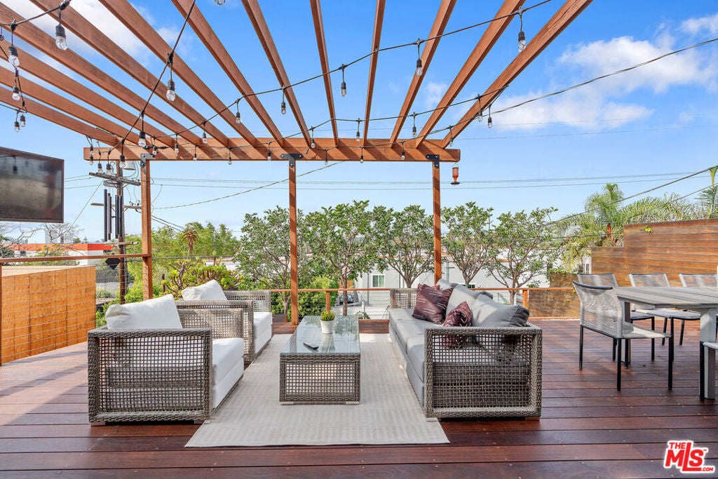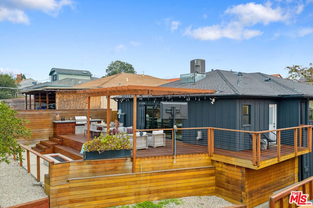 Modern farmhouse in highly desired Pickfair Village. The gorgeous Ipe Brazilian Walnut entry deck seamlessly flows into the open-concept floor plan, with the living room, dining room, and kitchen merging into a spacious great room. The large picture window, controlled by Hunter Douglas automatic window coverings, allows an abundance of natural light to flood the space with a glow. The high-end surface materials, such as the wide plank European Oak floors throughout, the white classic tiles, and Carrara marble countertops, are modern with a timeless flair. The kitchen, equipped with upscale appliances, is a cook's dream. The spacious owner's retreat, featuring a spa bathroom and a walk-in closet, opens seamlessly to the back Ipe deck and terraced yard. This expanded living space features separate areas for lounging and dining, along with a grill, gas fire pit, and outdoor TV, making it perfect for all your alfresco entertaining. The views from the decks are west toward Santa Monica and the gorgeous sunsets, and North to the Hollywood Hills. The home's systems have been upgraded to include a tankless water heater, a 200-amp electrical panel, a roof, and energy-efficient windows. The attached 2-car garage has built-in storage and epoxy floors. The property is zoned LAR2. Drought-tolerant artificial grass and landscape rock make for a low-maintenance yard. It is time to enjoy this prime location near the Westside, Beverly Hills, Hancock Park, and West Hollywood.