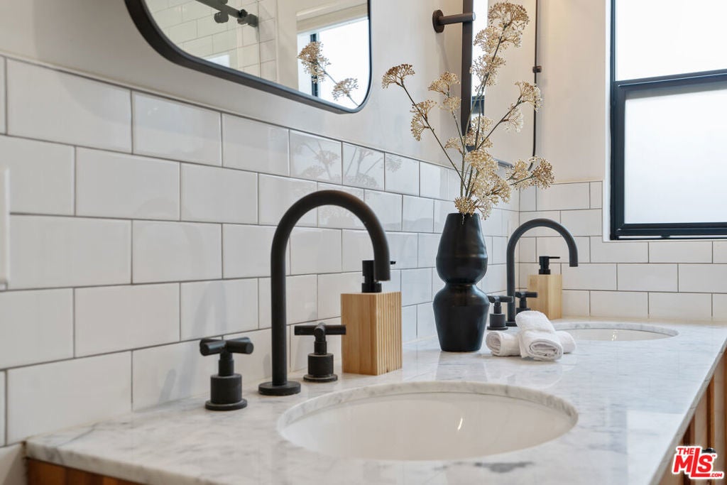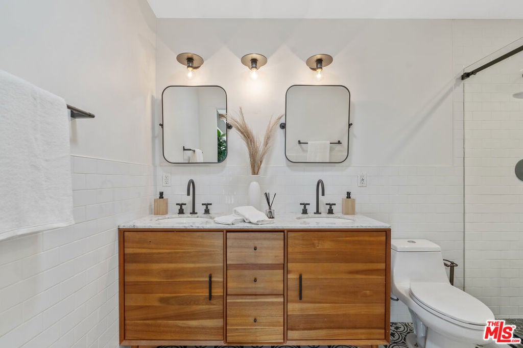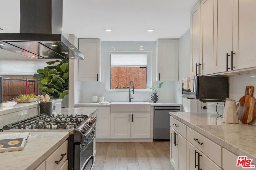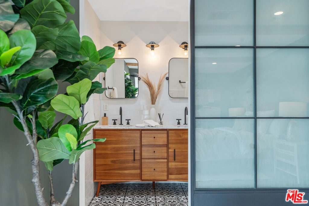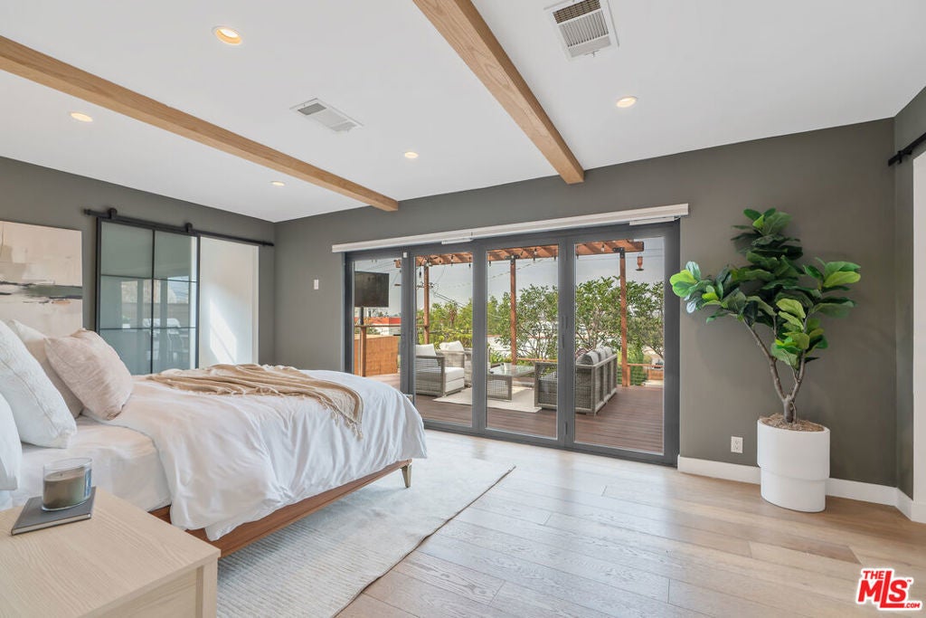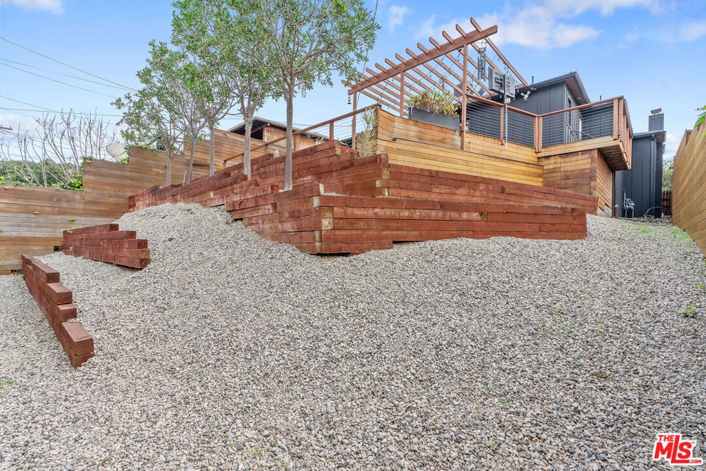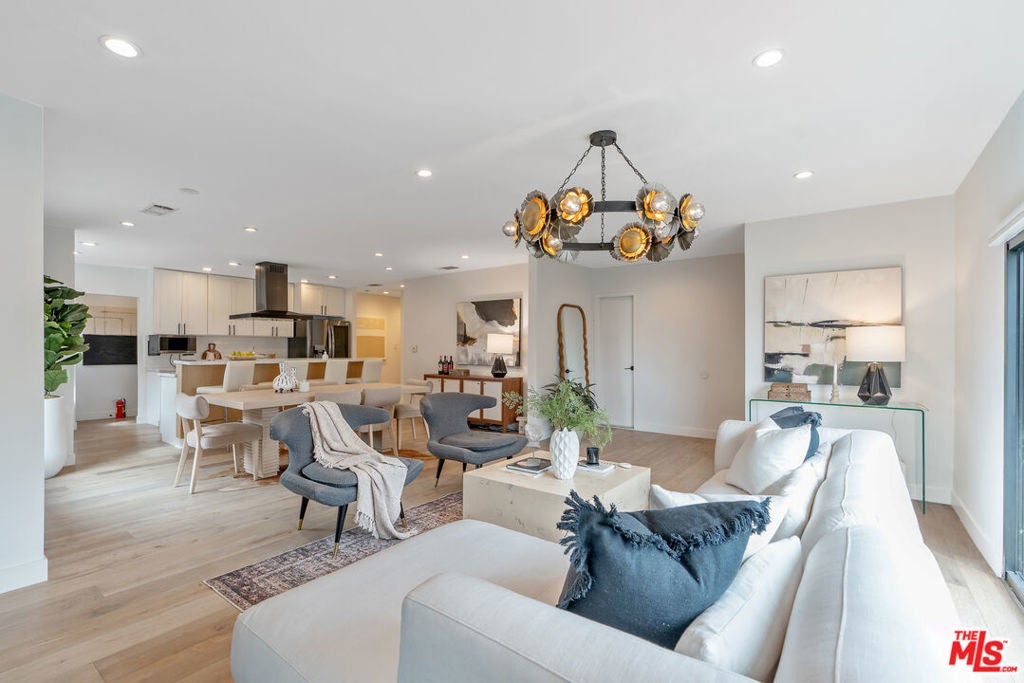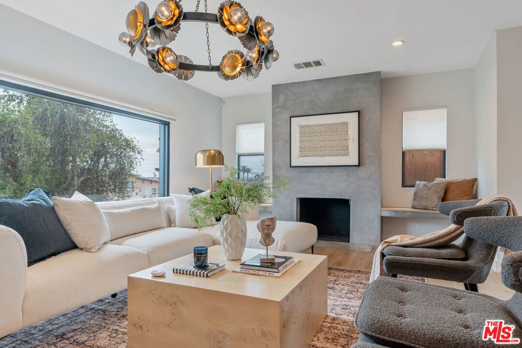 Modern farmhouse in highly desired Pickfair Village. The gorgeous Ipe Brazilian Walnut entry deck seamlessly flows into the open-concept floor plan, with the living room, dining room, and kitchen merging into a spacious great room. The large picture window, controlled by Hunter Douglas automatic window coverings, allows an abundance of natural light to flood the space with a glow. The high-end surface materials, such as the wide plank European Oak floors throughout, the white classic tiles, and Carrara marble countertops, are modern with a timeless flair. The kitchen, equipped with upscale appliances, is a cook's dream. The spacious owner's retreat, featuring a spa bathroom and a walk-in closet, opens seamlessly to the back Ipe deck and terraced yard. This expanded living space features separate areas for lounging and dining, along with a grill, gas fire pit, and outdoor TV, making it perfect for all your alfresco entertaining. The views from the decks are west toward Santa Monica and the gorgeous sunsets, and North to the Hollywood Hills. The home's systems have been upgraded to include a tankless water heater, a 200-amp electrical panel, a roof, and energy-efficient windows. The attached 2-car garage has built-in storage and epoxy floors. The property is zoned LAR2. Drought-tolerant artificial grass and landscape rock make for a low-maintenance yard. It is time to enjoy this prime location near the Westside, Beverly Hills, Hancock Park, and West Hollywood.