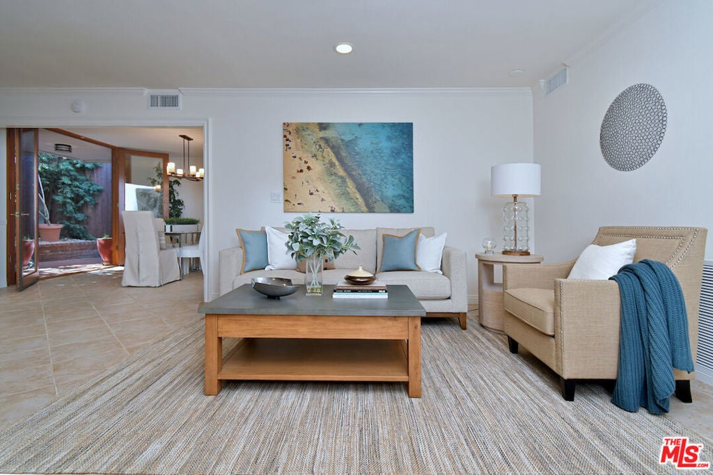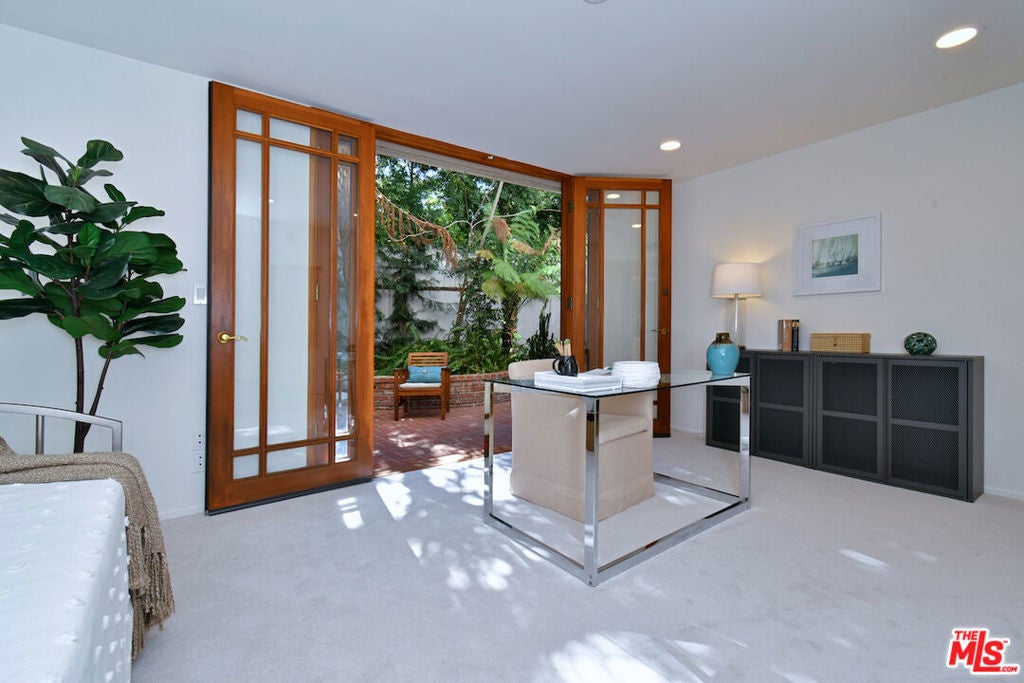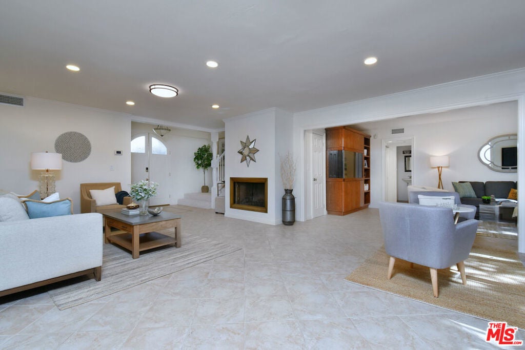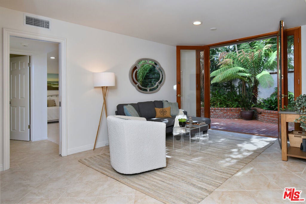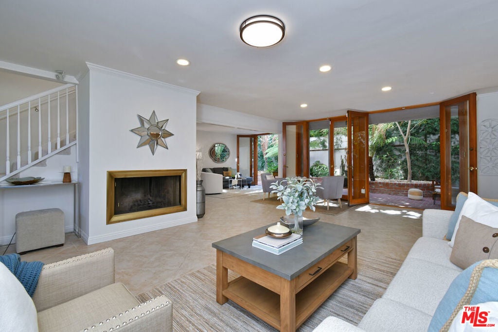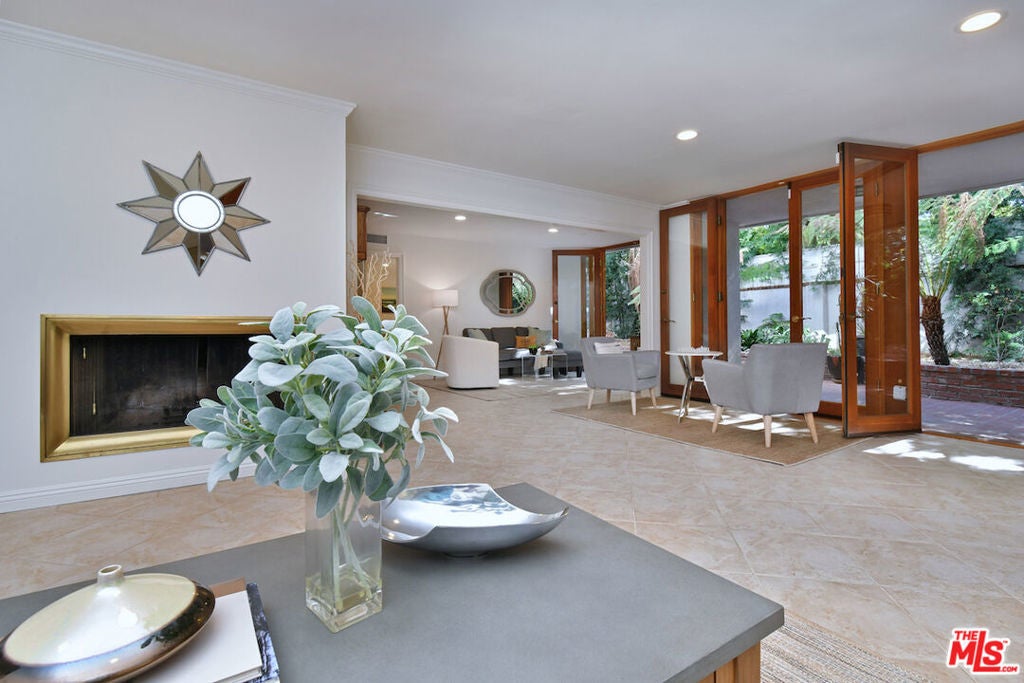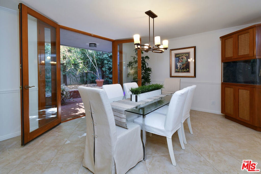 This SFR is located in a 5 unit development. Welcome to 14128 Dickens Street in Sherman Oaks, CA a rare townhouse-style single family residence tucked away in the picturesque Stansbury Estates. Part of an intimate, well-maintained complex of just five homes, this is truly the crown jewel: a private retreat that lives like a single-family home, moments from Whole Foods, top restaurants, and upscale shopping. Step inside to an impressive foyer featuring a charming tile mosaic, soaring ceilings with chandelier and shiplap detail, and a convenient coat closet. From here, the eye is drawn through the expansive living space to French doors framing the lush greenery of your private backyard. The open-concept living and dining areas flow effortlessly together, creating an inviting atmosphere ideal for everyday living or entertaining. Walls of French doors flood the space with natural light and open to a tranquil garden patio, delivering that coveted indoor-outdoor California lifestyle. The kitchen is a chef's dream with a central island, abundant counter space, extensive cabinetry, elegant stainless steel appliances, and direct access to the two-car garage. Completing the main level is a cozy den or media room with a built-in aquarium and French doors to the patio, plus a spacious downstairs suite perfect as a home office or future primary bedroom complete with its own three-quarter bath. Upstairs, two generous bedroom suites each feature their own bath. The luxurious primary retreat includes serene green views, a spa-like bathroom with quartz finishes, frameless glass shower, soaking tub, dual vanity, and a massive walk-in closet with wood floors and hidden attic storage. Outdoors, the private patio is enclosed by tall Podocarpus trees, offering a peaceful setting for morning coffee, along with a charming planter for the avid gardener. 14128 Dickens is a rare gem equally suited as a pied--terre or forever home in a prime Sherman Oaks location. Don't miss your chance to experience it.