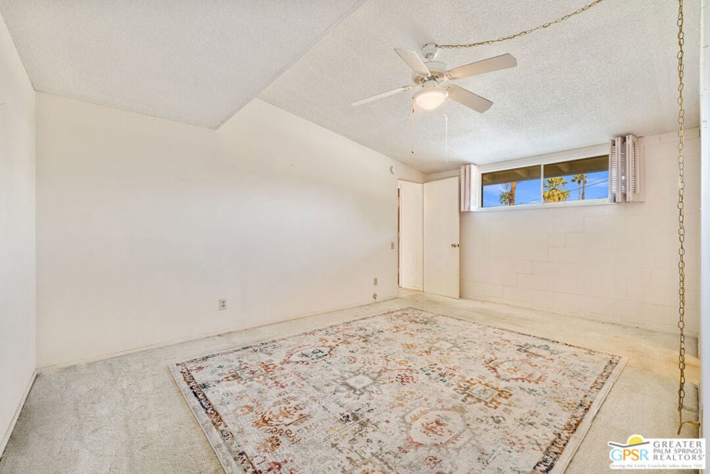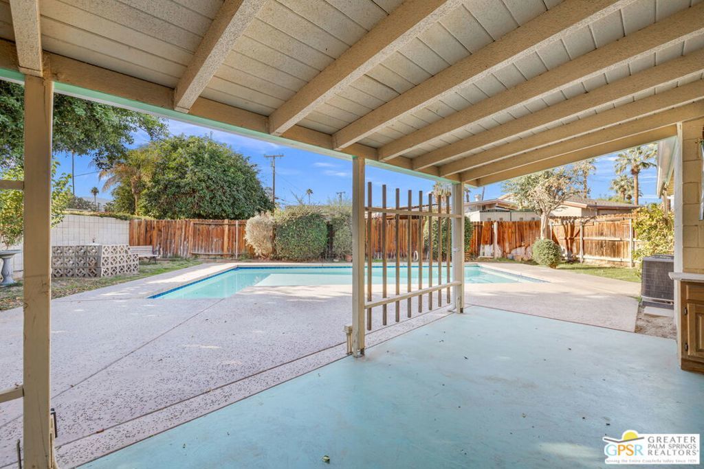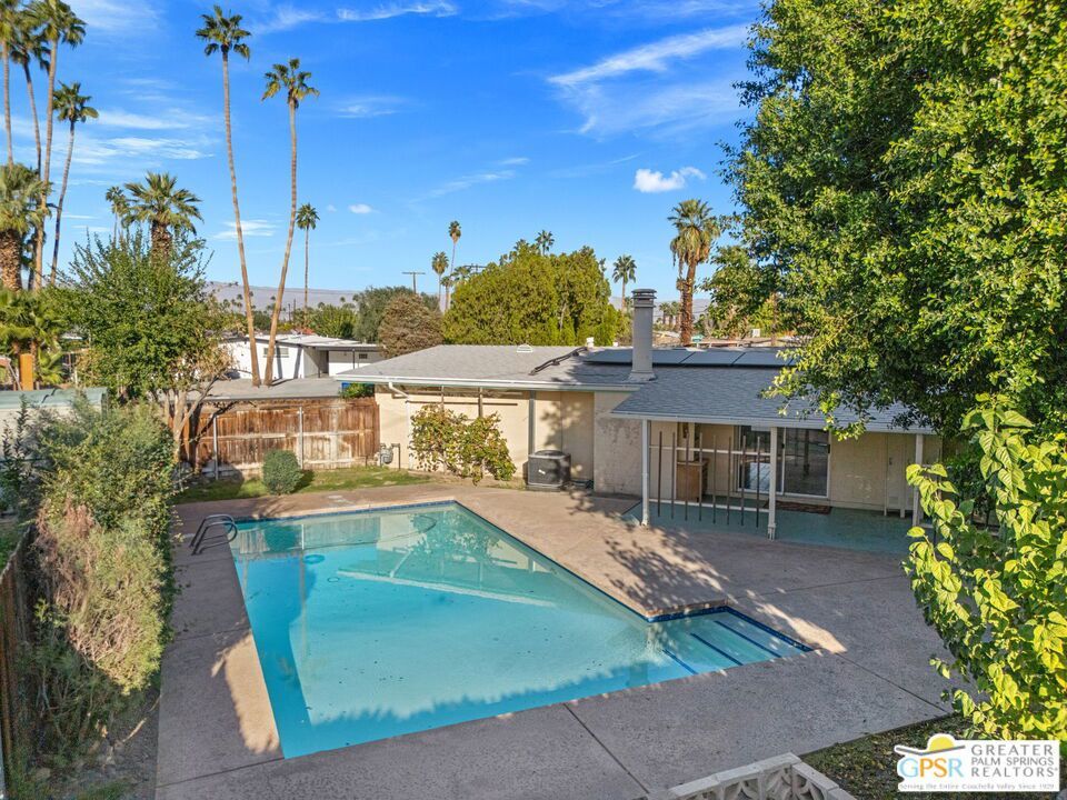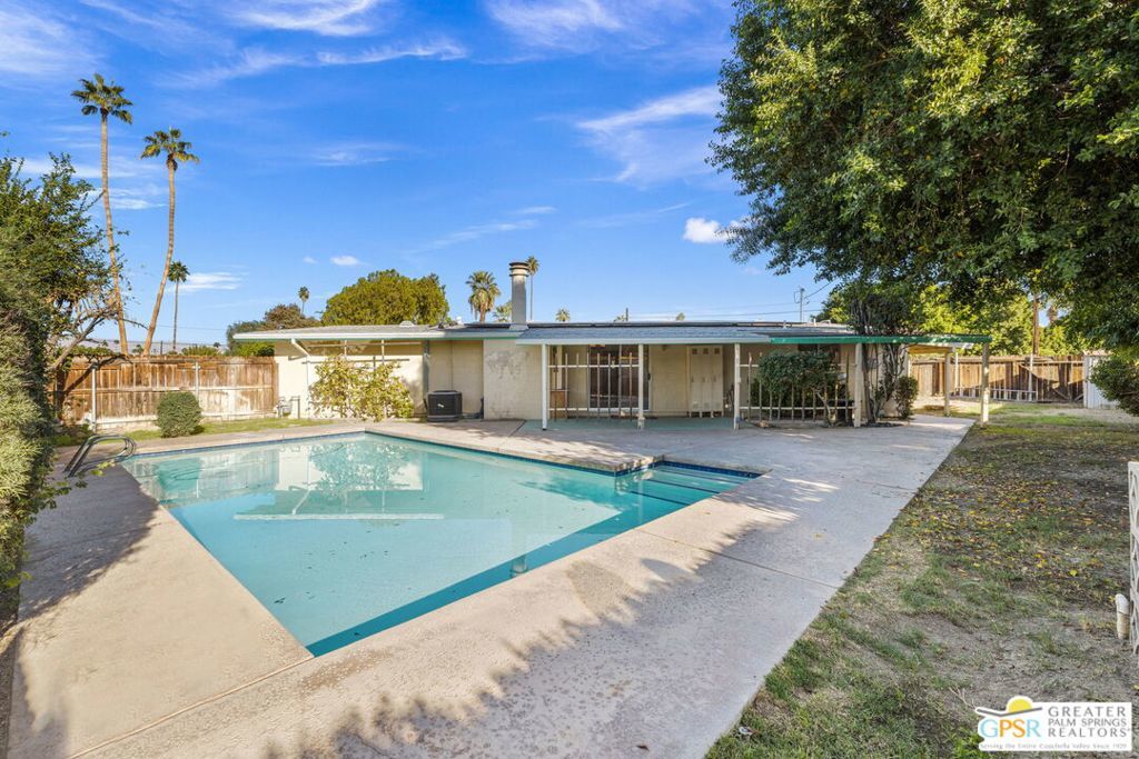 THE ONE you've been waiting for in Palm Desert, where mid-century architecture, clean lines, and an ultra-private pool setting come together on a corner lot with south-facing mountain views. Motor up the drive for a closer look at this three-bedroom, two-bath opportunity where value and location shine. Bring your special touch and enjoy the modernist vibes of block walls, clerestory light, and the optimism of that iconic architectural era. The living and dining areas center around a handsome brick fireplace with hearth and a glass slider that opens to the pergola-covered patio, while the nearby kitchen enjoys great flow and easy outdoor access. Bedrooms enjoy thoughtful separation, and the ensuite primary features a vaulted ceiling, clerestory window, and two closets, while guest bedrooms two and three share a full bath. Carport parking for two plus a nearby storage area adds convenience, and leased solar is another plus. Recent improvements include a newer roof, newer water heater, and a freshly replastered pool. Generous outdoor spaces offer plenty of opportunity to elevate the landscaping and create something truly special, all in a prime Palm Desert setting just minutes from the best of El Paseo.