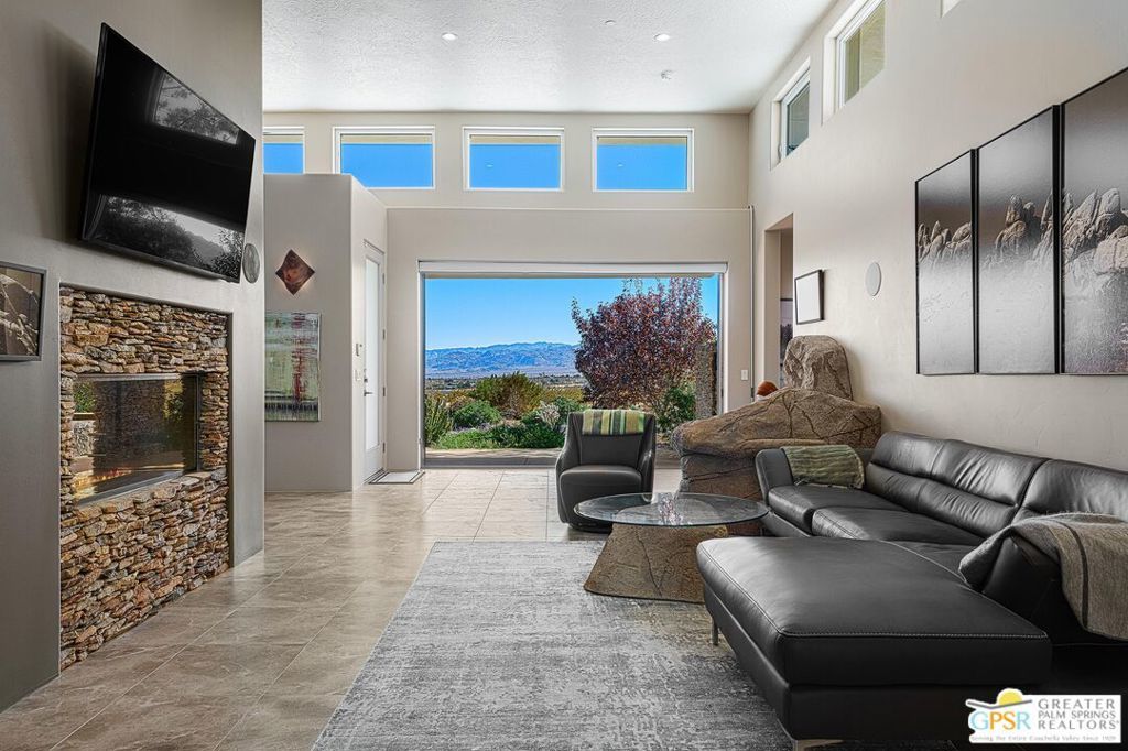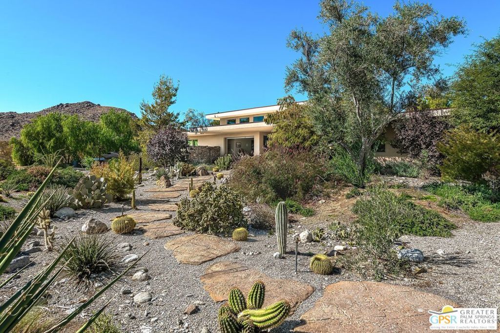 Desert Horizon House is a sophisticated desert retreat set within a private botanical garden of sculptural desert plants designed by a renowned Los Angeles landscape architect. This home is a modern sanctuary where architecture and nature blend perfectly. The stunning location is enhanced by the magical garden that completely envelops the house, complementing its position on the desert floor. Located on an expansive lot, this newer home has breathtaking, unobstructed views of the desert landscape, nearby hills, and distant mountain ranges. Both sunrise and sunset here are unforgettable, bracketing perfect desert days and nights. The property is located moments from Joshua Tree National Park. A custom metal gate opens to a fully fenced estate where meandering pathways, mature trees, and vibrant plantings create a tranquil retreat for nature and bird lovers alike. Inside, the home showcases soaring cathedral ceilings and an airy, minimalist design that emphasizes light, space, and flow. Thoughtfully designed for efficiency, the home features an owned solar energy system that ensures sustainable comfort year-round. Expansive glass sliders on both sides of the main living area invite seamless indoor-outdoor living, allowing the desert breeze to drift through and connect every room to the natural beauty beyond. A testament to refined desert living, Desert Horizon House is the perfect high desert home.