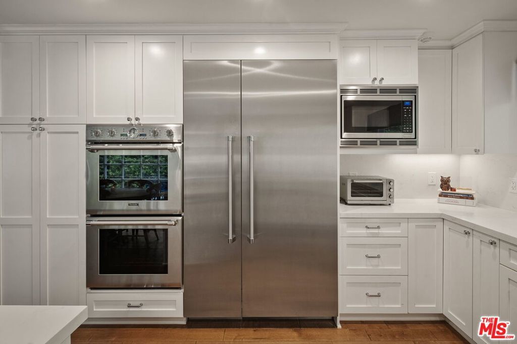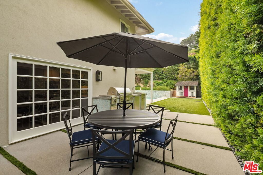 Set in an idyllic Brentwood neighborhood, this pristine traditional-style residence blends classic refinement with modern comfort. Awash with natural light, the home welcomes with soaring vaulted and beamed ceilings, warm wood floors, and an inviting sense of space and serenity. Enter through the foyer and enjoy an open sightline through the home to the beautifully landscaped backyard. The formal living room, anchored by a stone fireplace and custom built-ins, opens through sliding glass doors to the firepit patio for effortless indoor-outdoor living. The remodeled chef's kitchen features premium Thermador appliances, ample pantry storage, and a convenient passthrough window to the backyard entertaining area. A formal dining room sits adjacent to the kitchen, ideal for hosting intimate dinners or larger gatherings. Designed for relaxation and connection, the expansive family room boasts a built-in wet bar with temperature-controlled wine storage. The thoughtful floor plan offers one bedroom on the main level -- ideal for a home office or guest suite -- and four additional bedrooms upstairs. Retreat to the primary suite, a private sanctuary with a spacious walk-in closet and a luxurious en suite bath with dual vanities, a glass-enclosed shower with bench seating, and a sunlit soaking tub. Additional amenities include Control4 home automation, surround sound, a gym, a powder room, and a two-car garage with direct home access. Outdoors, enjoy manicured landscaping and tall privacy hedging framing an entertainer's paradise -- complete with a sparkling pool with an automatic cover, built-in outdoor kitchen, cozy firepit, children's playhouse, and both covered and uncovered patio spaces for year-round enjoyment. Located just moments from Brentwood Village's charming boutiques, restaurants, and amenities, this home offers the best of Westside living in a premier Brentwood enclave.