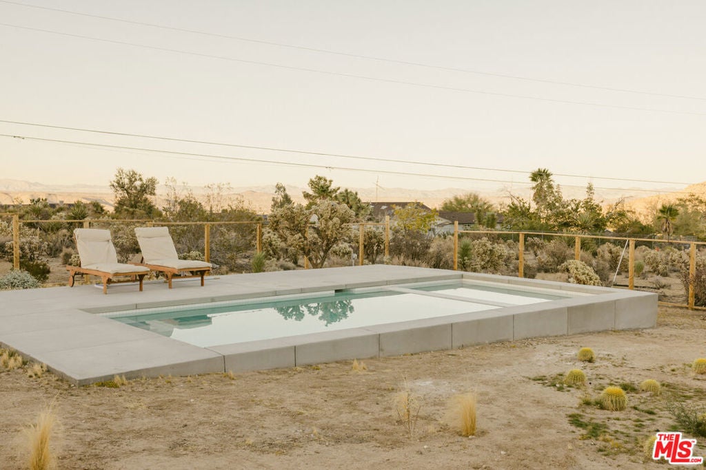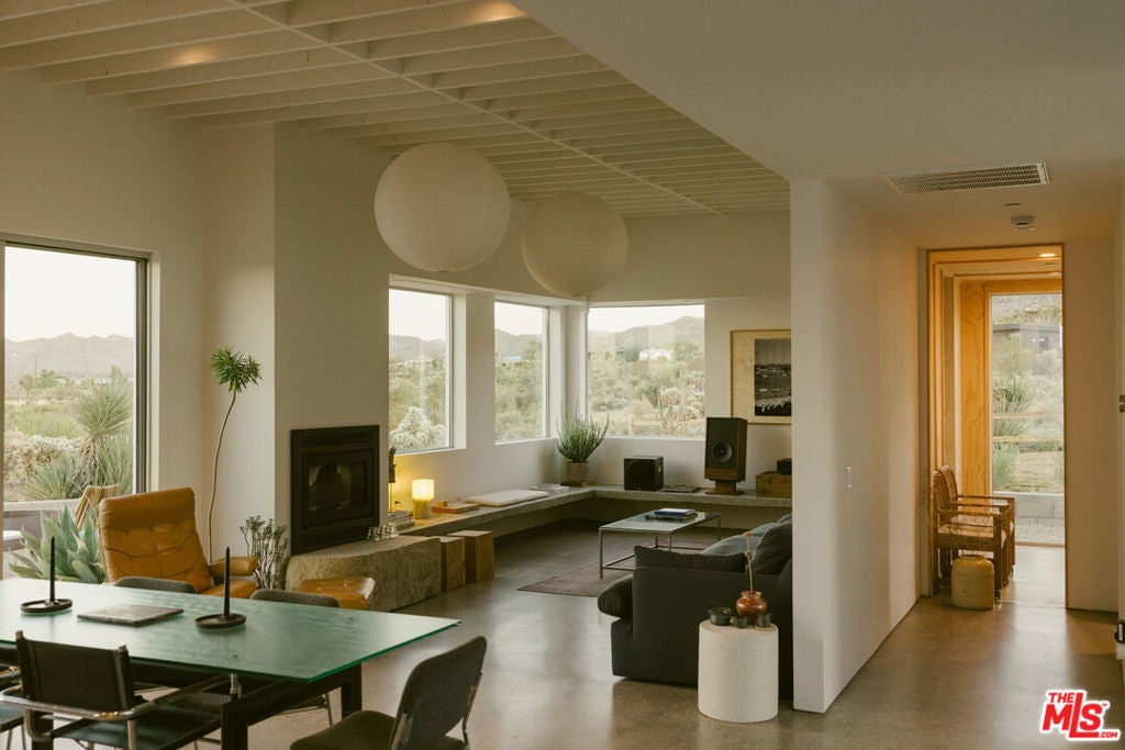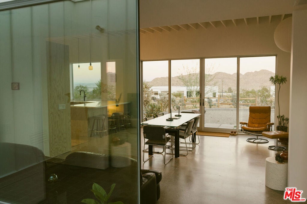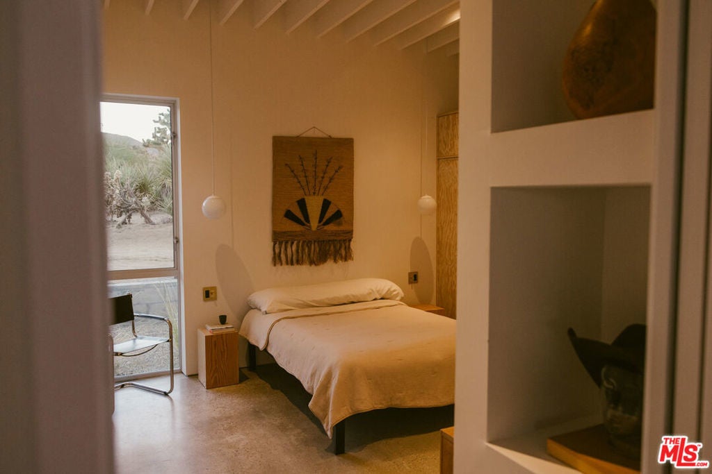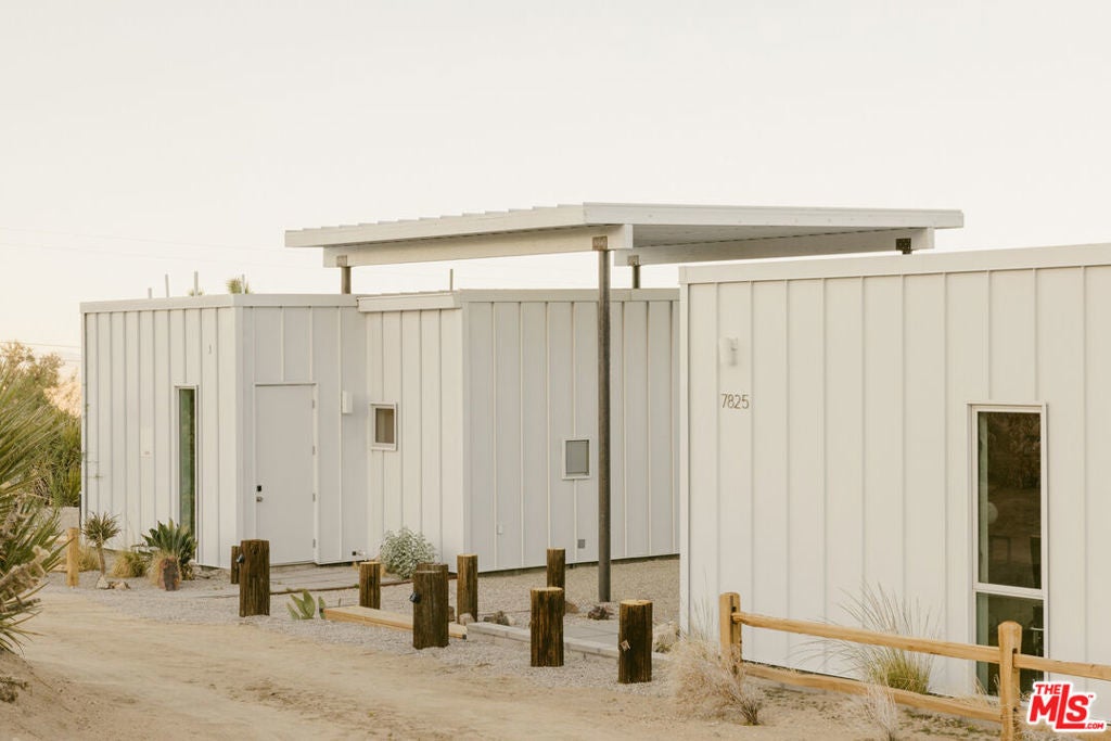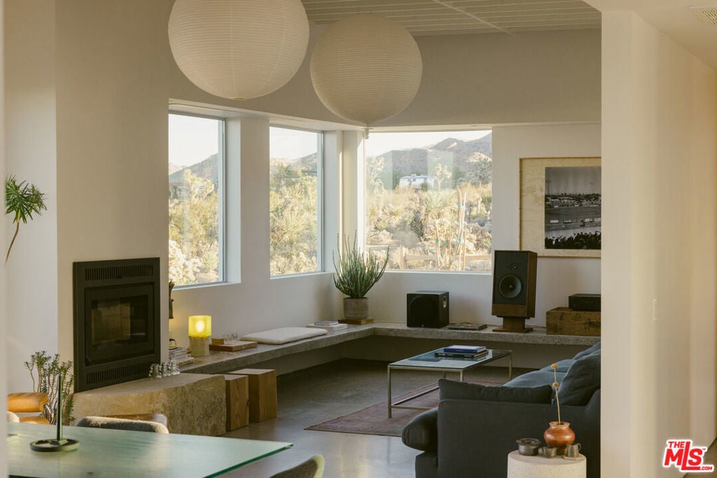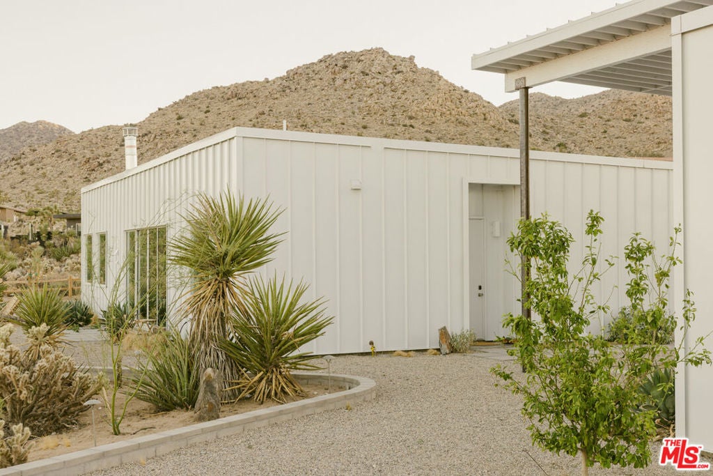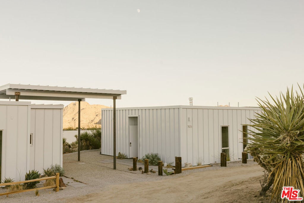 Designed to live in rhythm with the desert sun, this newly built modern residence offers a rare balance of architectural intention, nature-integrated living, and refined comfort. Set against a mountain side and wide-open landscape of Joshua Tree, the home presents a serene sanctuary where clean lines, warm minimalism, and immersive natural light shape the experience from the moment you arrive. Anchored by a restrained contemporary silhouette, the 2,323 sq ft house + casita is defined by its off-white steel facade and expansive large metal frame glass that dissolves the threshold between indoors and out. Stepping inside, the atmosphere shifts into a quiet, grounded elegance bright, airy, and softly diffused light throughout the day. An internal atrium, wrapped in glass, forms the heart of the home, drawing in natural light while establishing a constant connection to land and sky. The interiors reflect a thoughtful commitment to natural materials, craftsmanship, and warm Scandinavian undertones. Concrete floors flow throughout, complemented by custom Douglas Fir cabinetry that brings a tactile, organic calm to every room. The kitchen pairs quartzite countertops with integrated appliances for a refined, minimalist profile, while a sculptural floating concrete bench anchors the living space with gallery-like simplicity. A dedicated office wrapped in wood walls and ceilings offers a quiet, soulful workspace for creative living or remote work, with a custom built-in table top. Two spa-inspired bathrooms in the main house are finished in hand-applied tadelakt plaster, one featuring a built-in tub wrapped in glossy Zellige tile for a luxurious, retreat-like ritual. A detached casita - a fully self-contained 1 bedroom, 1 bath suite with kitchenette - sits near the pool with its own private outdoor area, offering guests or residents an independent haven with a resort-like sensibility. Outdoors, the property unfolds across 1.05 acres of native, drought-tolerant desert landscaping, curated pathways, and sculptural plantings that echo the surrounding terrain. Lounge areas, a fire pit, and a pool and spa invite slow mornings, golden-hour reflection, and stargazing beneath expansive desert skies. With sunrise and sunset views, open land, and wildlife quail, roadrunners, and coyotes this home embodies the restorative, creative, and nature-oriented spirit of Joshua Tree. A modern desert retreat designed for deeper connection where architecture, land, and light live in effortless balance.