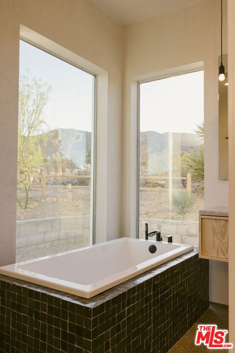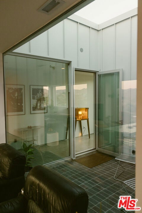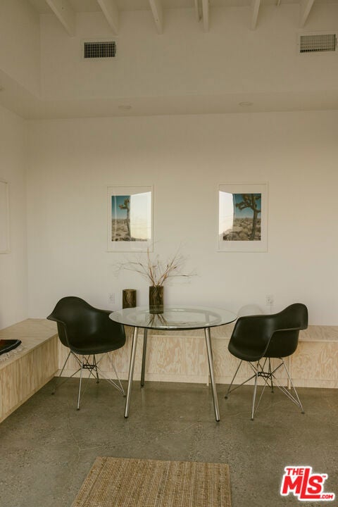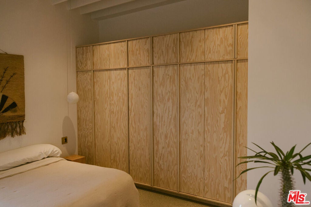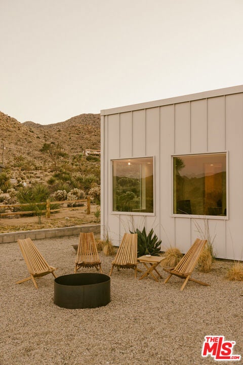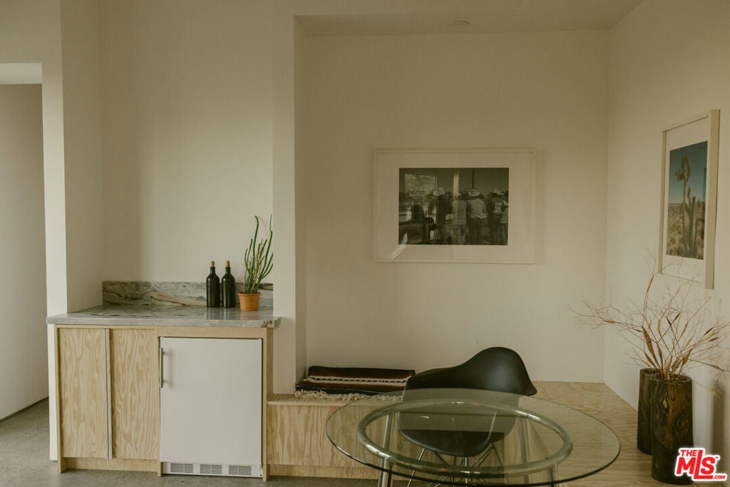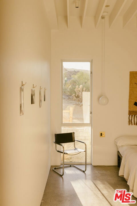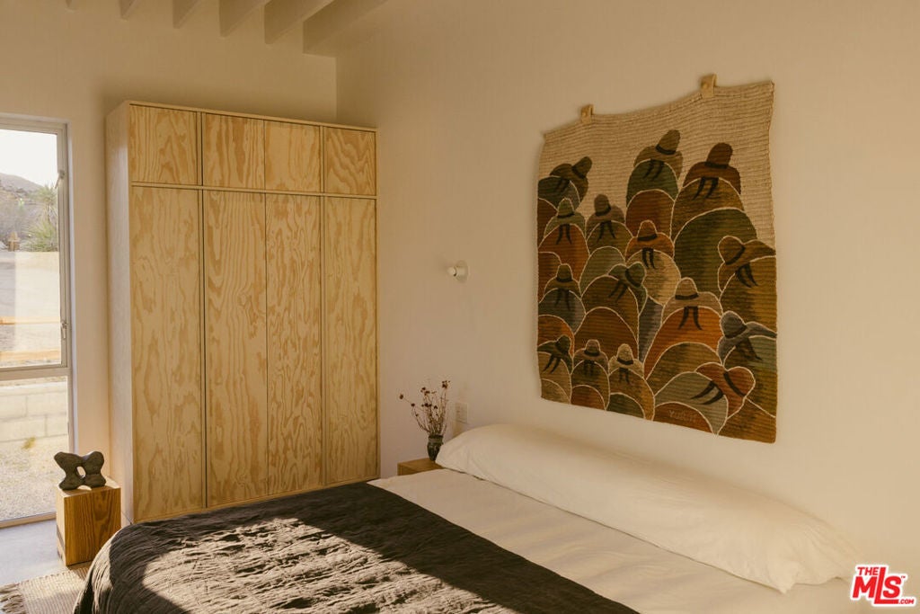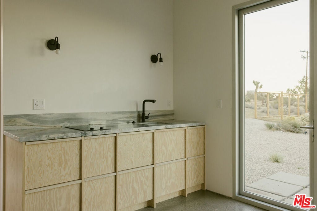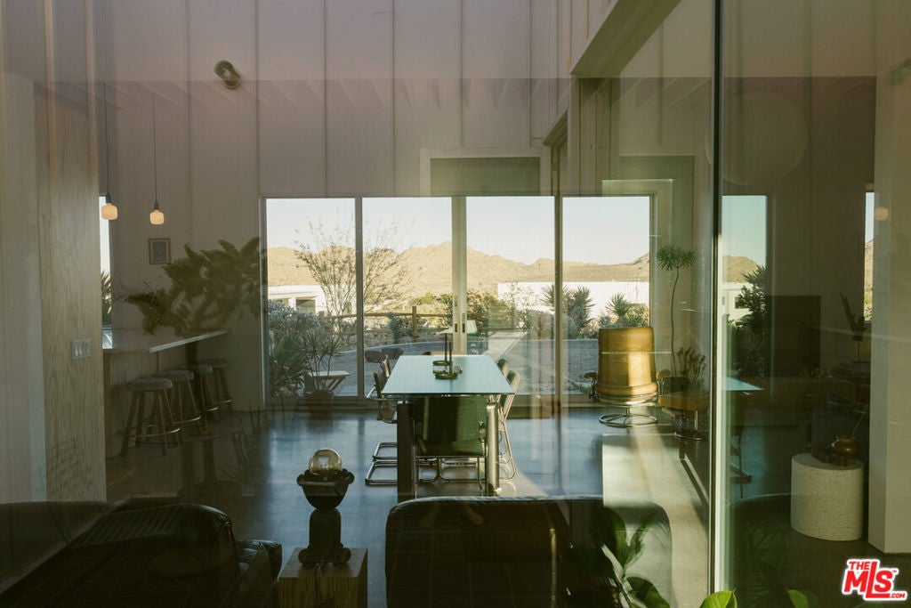 Designed to live in rhythm with the desert sun, this newly built modern residence offers a rare balance of architectural intention, nature-integrated living, and refined comfort. Set against a mountain side and wide-open landscape of Joshua Tree, the home presents a serene sanctuary where clean lines, warm minimalism, and immersive natural light shape the experience from the moment you arrive. Anchored by a restrained contemporary silhouette, the 2,323 sq ft house + casita is defined by its off-white steel facade and expansive large metal frame glass that dissolves the threshold between indoors and out. Stepping inside, the atmosphere shifts into a quiet, grounded elegance bright, airy, and softly diffused light throughout the day. An internal atrium, wrapped in glass, forms the heart of the home, drawing in natural light while establishing a constant connection to land and sky. The interiors reflect a thoughtful commitment to natural materials, craftsmanship, and warm Scandinavian undertones. Concrete floors flow throughout, complemented by custom Douglas Fir cabinetry that brings a tactile, organic calm to every room. The kitchen pairs quartzite countertops with integrated appliances for a refined, minimalist profile, while a sculptural floating concrete bench anchors the living space with gallery-like simplicity. A dedicated office wrapped in wood walls and ceilings offers a quiet, soulful workspace for creative living or remote work, with a custom built-in table top. Two spa-inspired bathrooms in the main house are finished in hand-applied tadelakt plaster, one featuring a built-in tub wrapped in glossy Zellige tile for a luxurious, retreat-like ritual. A detached casita - a fully self-contained 1 bedroom, 1 bath suite with kitchenette - sits near the pool with its own private outdoor area, offering guests or residents an independent haven with a resort-like sensibility. Outdoors, the property unfolds across 1.05 acres of native, drought-tolerant desert landscaping, curated pathways, and sculptural plantings that echo the surrounding terrain. Lounge areas, a fire pit, and a pool and spa invite slow mornings, golden-hour reflection, and stargazing beneath expansive desert skies. With sunrise and sunset views, open land, and wildlife quail, roadrunners, and coyotes this home embodies the restorative, creative, and nature-oriented spirit of Joshua Tree. A modern desert retreat designed for deeper connection where architecture, land, and light live in effortless balance.