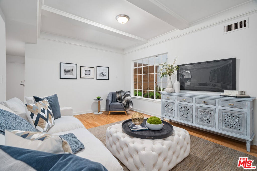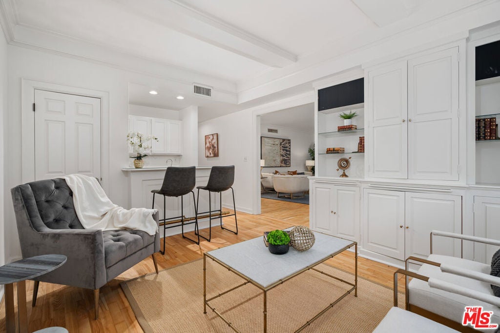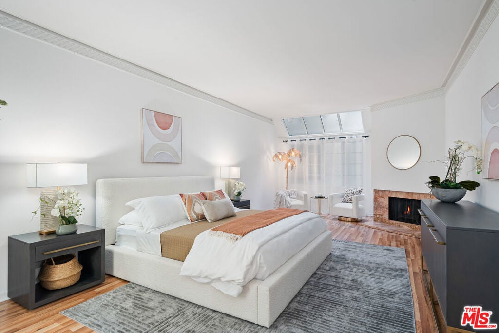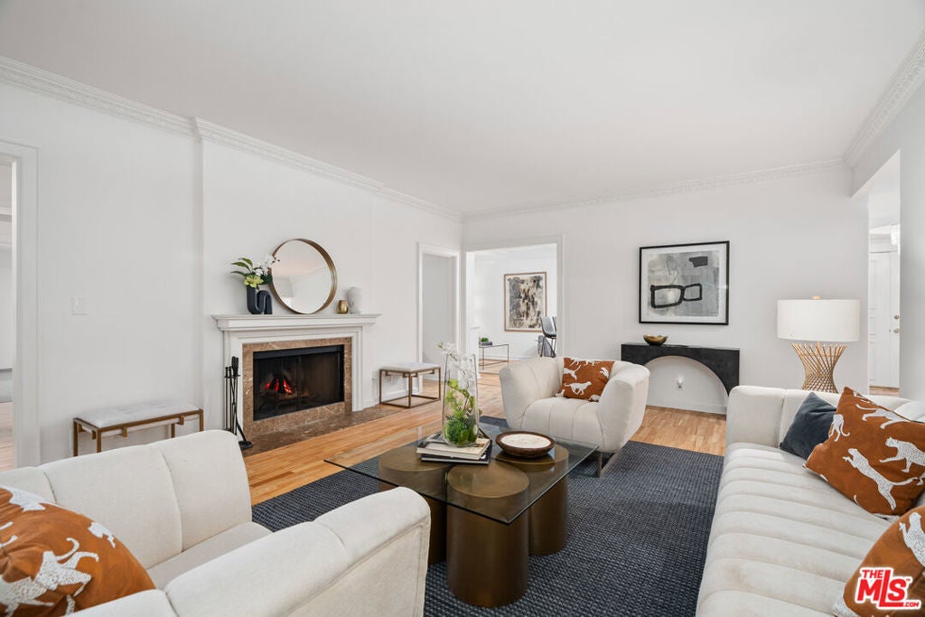 Rare opportunity to buy in the prestigious Fleur de Lis - one of the most desirable buildings in Brentwood. This spacious single-story unit features hardwood floors, recessed lighting, and crown moldings throughout. Large formal living room with a gas fireplace flows out to an intimate balcony as well as a lounge that's perfect for entertaining. Just off the kitchen there is a family/bonus room on one side and a formal dining room on the other. Huge primary suite includes a gas fireplace, an expansive walk-in closet and newly remodeled bathroom with dual sinks, shower and stand-alone tub. The residence is equipped with in-unit laundry, while the building enjoys a tranquil outdoor swimming pool, controlled access with security cameras on all floors and it prides itself as one of the best run buildings on the Westside. Ideal location with an incredible walk score of 90, this gem is close to all the top restaurants and shopping that Brentwood has to offer!
