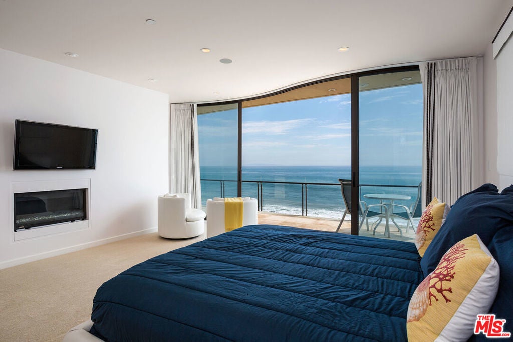 Dolphin House with celebrity style, and 55 feet of Malibu Road beach frontage, Sinuous curves, white marble floors, and sleek contemporary furnishings. Walls of glass and two spacious beachfront balconies take in the expansive ocean and island panorama. The main living area is wide, curved Fleetwood stacking glass doors open onto a full-width deck complete with Jacuzzi, Lynx barbecue. The living area comprises two seating areas with exquisite Italian leather furniture, two flat screens, and a fireplace (one of four in the home). Between the sitting areas is a stunning glass dining table for ten guests, and adjacent to that is a fully equipped and stocked horseshoe-shaped bar with a beverage cooler, custom chandelier, and bar seating. The dual-island gourmet kitchen features wood cabinets, rare granite, and onyx countertops, top-of-the-line appliances, an indoor grill, a dumbwaiter to the second-floor kitchenette. Upstairs, accessible by steps or elevator, are three suites, two with ocean views and curved glass doors onto another full-width deck, and one suitable as an office, media room, or guest suite. Lavish spa-style bathrooms, equipped with integrated smart-home amenities, air conditioning, radiant floor heating, security, a two-car garage, standby generator, intercom, and automated sun shades. Lease price to be $45,000 for 1 year term leases. Summer 2026 rate to be.. June $50,000, July and August $69,000 per month, September $50,000 per month. Short term rate to be $47,000 per month