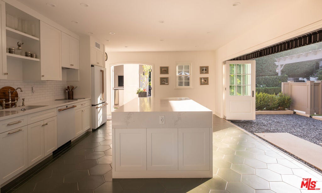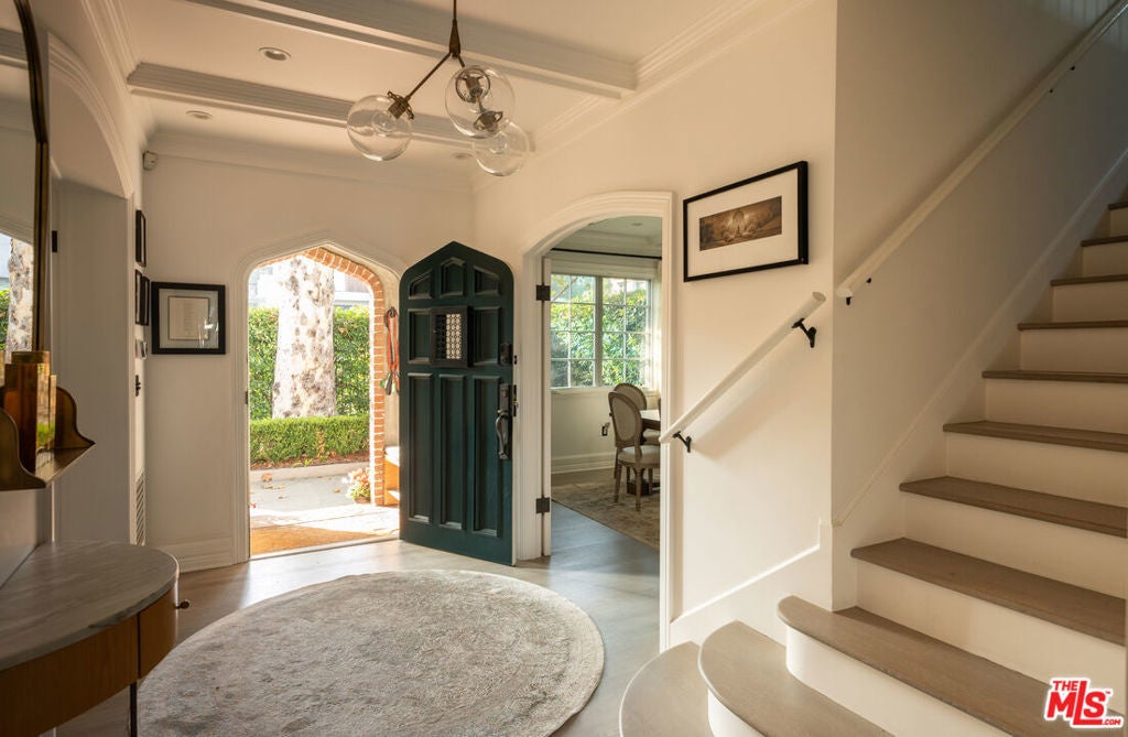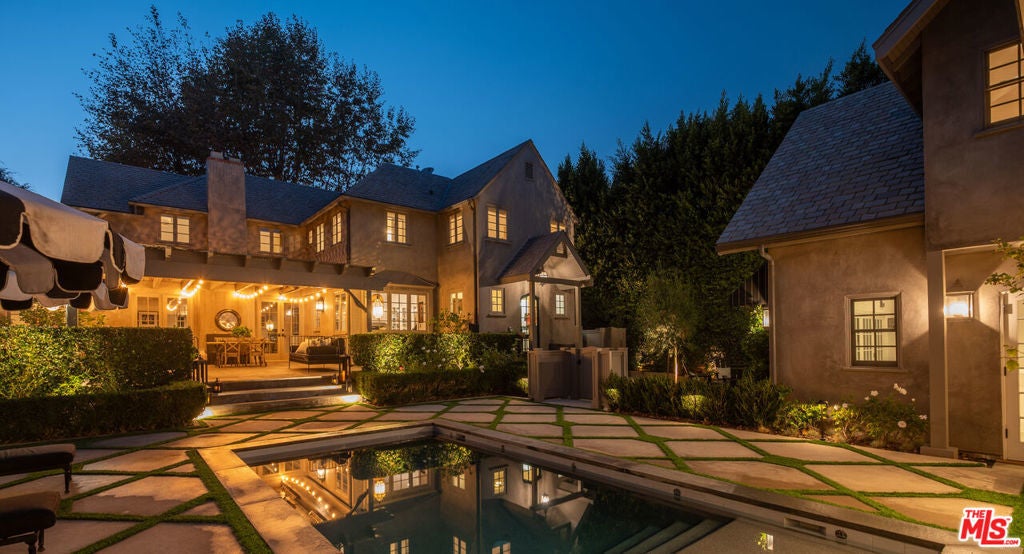 ELEGANT SUNSET SQUARE TRADITIONAL GATED & PRIVATE. This gorgeous, fully updated and dialed-in property has graced the pages of Architectural Digest and was recently home to an iconic actor and music legend. Classic lines and generous scale define every space, with a Paul Williams inspired floor plan offering exceptional flow and timeless elegance throughout. The first floor features an inviting entry foyer leading to the main living areas. The spacious living room boasts coved ceilings, bay windows, and French doors flanking a stunning central fireplace. Double entry doors open to a cozy den/library/media room. The formal dining room includes a built-in hutch and a door leading to the butler's pantry, which connects to the chef's kitchen. The kitchen offers a large center island, top-of-the-line appliances, a built-in dining banquette with expansive picture windows overlooking the gardens, a built-in computer station, and a dry bar. Completing this level are two powder rooms and a large laundry/mud room.Upstairs, the expansive primary suite features vaulted ceilings, walk-in and secondary closets, and beautiful views. The primary bath includes a soaking tub, double sinks, separate shower, and private water closet. Two additional bedroom suites each offer generous closets and beautifully updated baths. The fully hedged and private backyard is truly sensational, featuring a semi-covered living and dining terrace with a built-in BBQ, a sparkling pool with fountains, and a stunning cabana equipped with a full sound and video system, wet bar, refrigerator, and island perfect for entertaining. Beyond the pool, a fire pit leads to the two-story guesthouse (with a separate address) with vaulted ceilings, a full kitchen with island, a full bath, and an upstairs bedroom. A rare and remarkable offering combining exceptional style, condition, and value just blocks from the world-class amenities of the Sunset Strip, West Hollywood, and Runyon Canyon hiking trails.