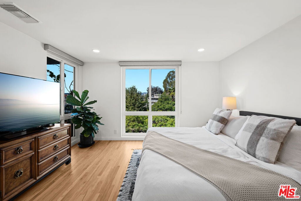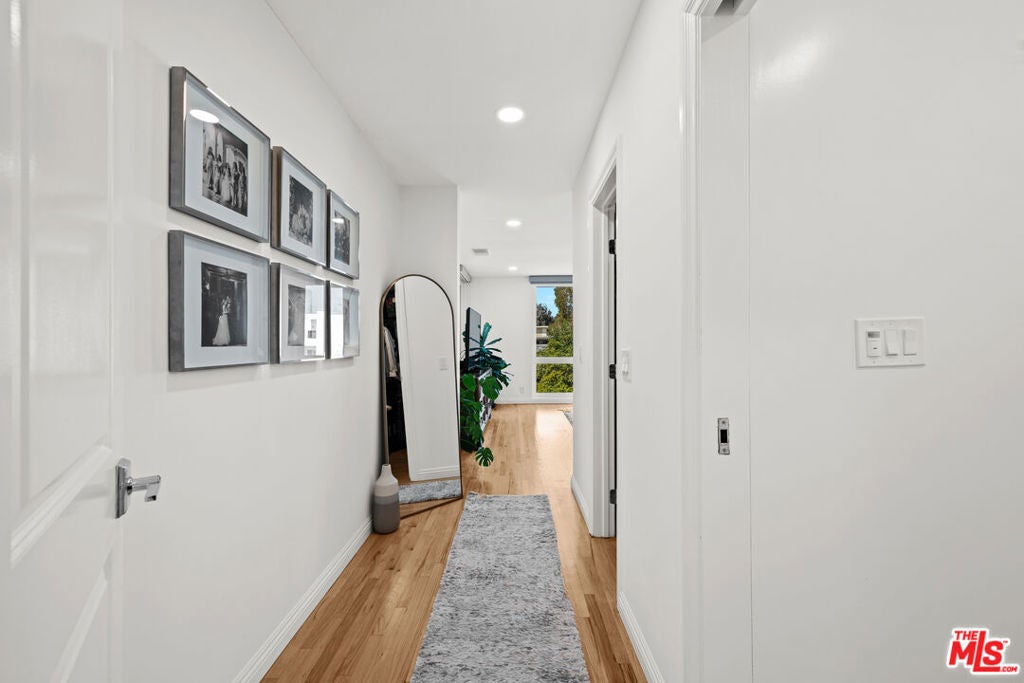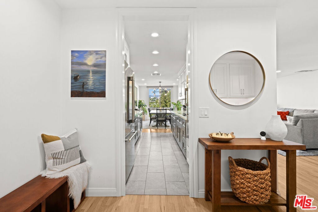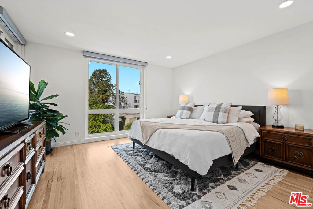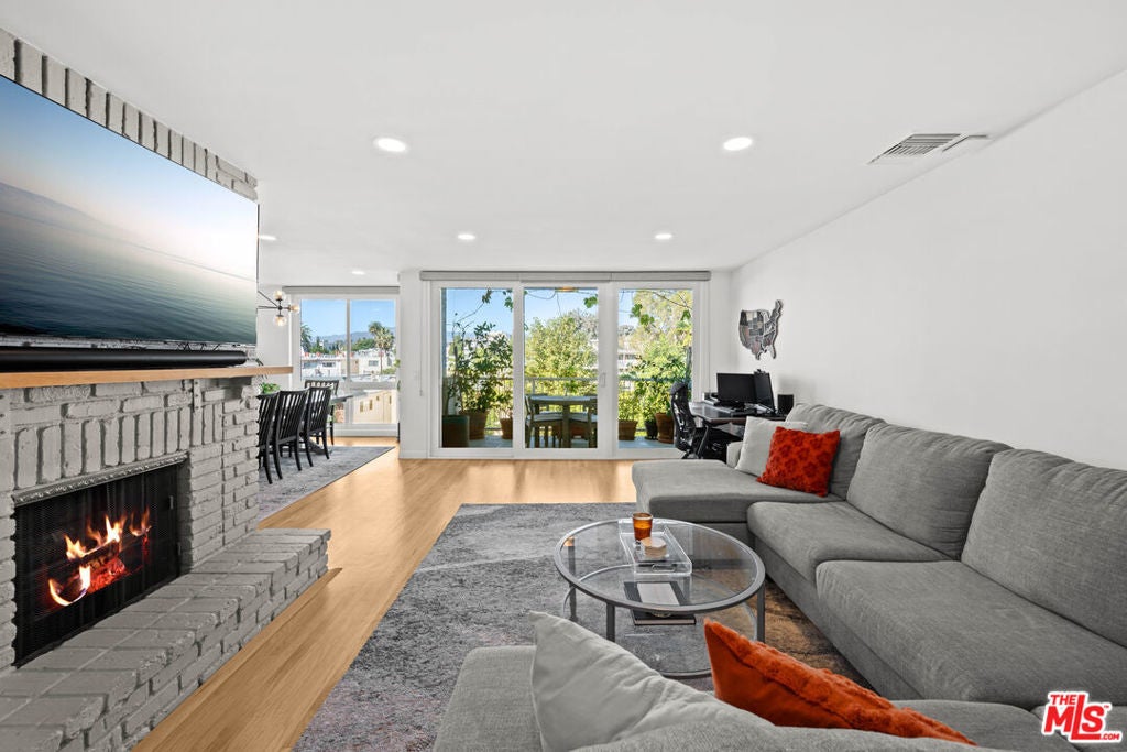 Stunning Top-Floor Corner Condo with Panoramic Views in Prime Brentwood! Discover this gorgeous front-facing 2-bedroom, 2.5-bathroom condo spanning 1,403 sq ft, perfectly positioned on the top floor of a beautifully maintained building in the heart of Brentwood. From the moment you enter through the stylish double doors, you're welcomed into a bright, inviting foyer that sets the tone for the elegance found throughout the home. Enjoy unobstructed treetop views that stretch to the mountains, filling the space with natural light and creating a serene and inspiring atmosphere for everyday living. Every inch of this residence has been thoughtfully updated with impeccable taste, showcasing beautifully refinished hardwood flooring, luxurious marble bathroom tiles, quartz countertops, newer kitchen appliances, gorgeous modern cabinets with under-cabinet lighting, a stylish wet bar with built-in wine fridge, recessed lighting, and custom window treatments. The spacious primary bedroom is a peaceful retreat with abundant windows showcasing the inspiring vistas, along with a beautifully updated en-suite bathroom and a generous walk-in closet. The cozy living room offers a comfortable space to unwind, complete with a fireplace for chilly evenings and direct access to your private balcony, perfect for morning coffee, sunset views, evening wine, or simply soaking in the scenery. A chic wet bar with wine fridge enhances the home's entertaining appeal. The fully equipped kitchen offers everything you need for effortless cooking and hosting. Additional highlights include an in-unit washer and dryer, newer HVAC and ducting, an upgraded electrical panel, double-pane windows, two-car parking with a private EV wall charger, secure building access, and unbeatable proximity to Brentwood's fabulous shops, restaurants, and neighborhood conveniences. Building upgrades include newer elevator (2020), newer roof (2022/2023), upgraded landscaping (2021), building exterior painting (2024), and re-striped parking spaces (2025). Experience elevated living, exceptional style, and breathtaking views in this truly remarkable condo that captures the very best of the Brentwood lifestyle! Please submit offers by 4:00 pm on Wednesday, 11/26.