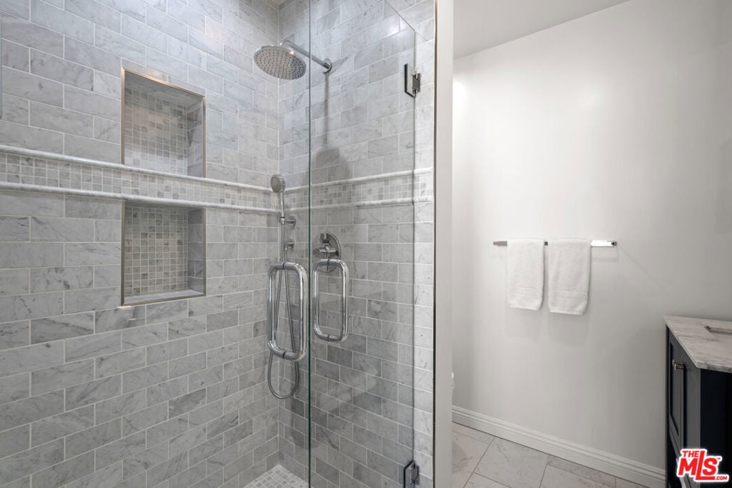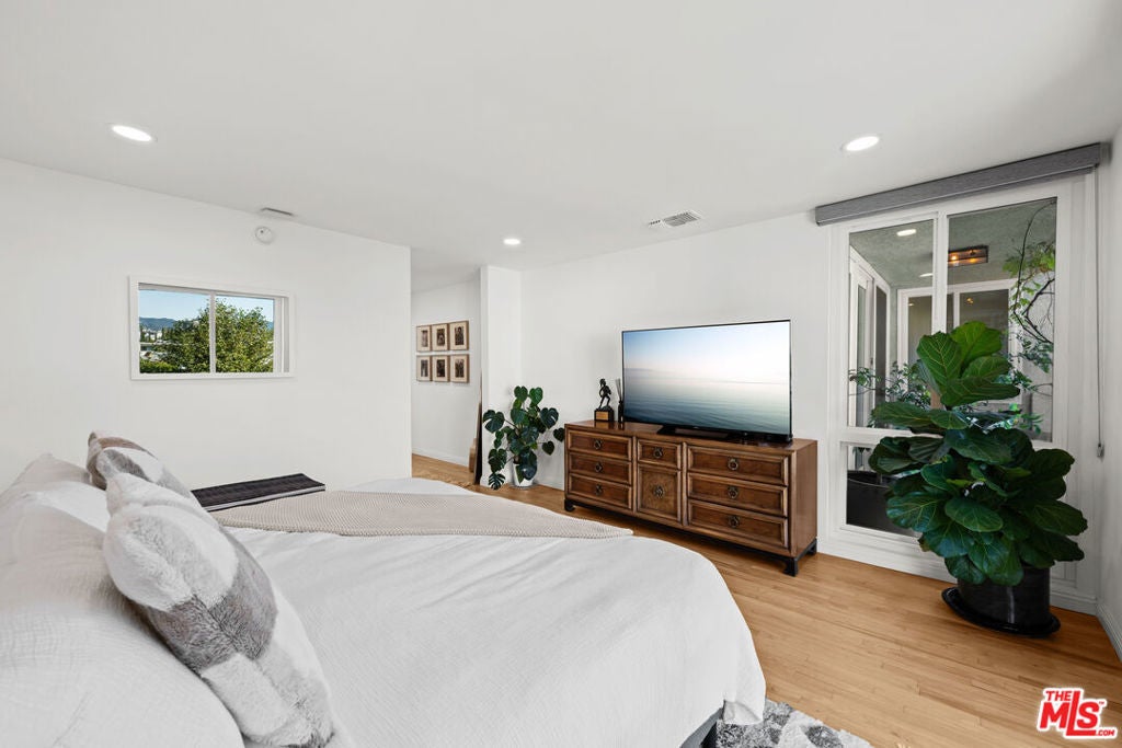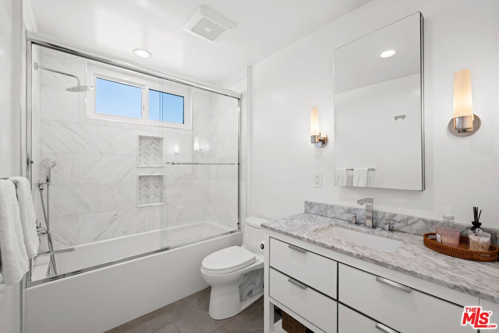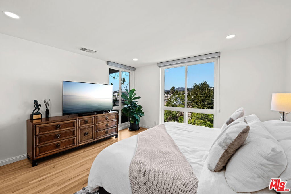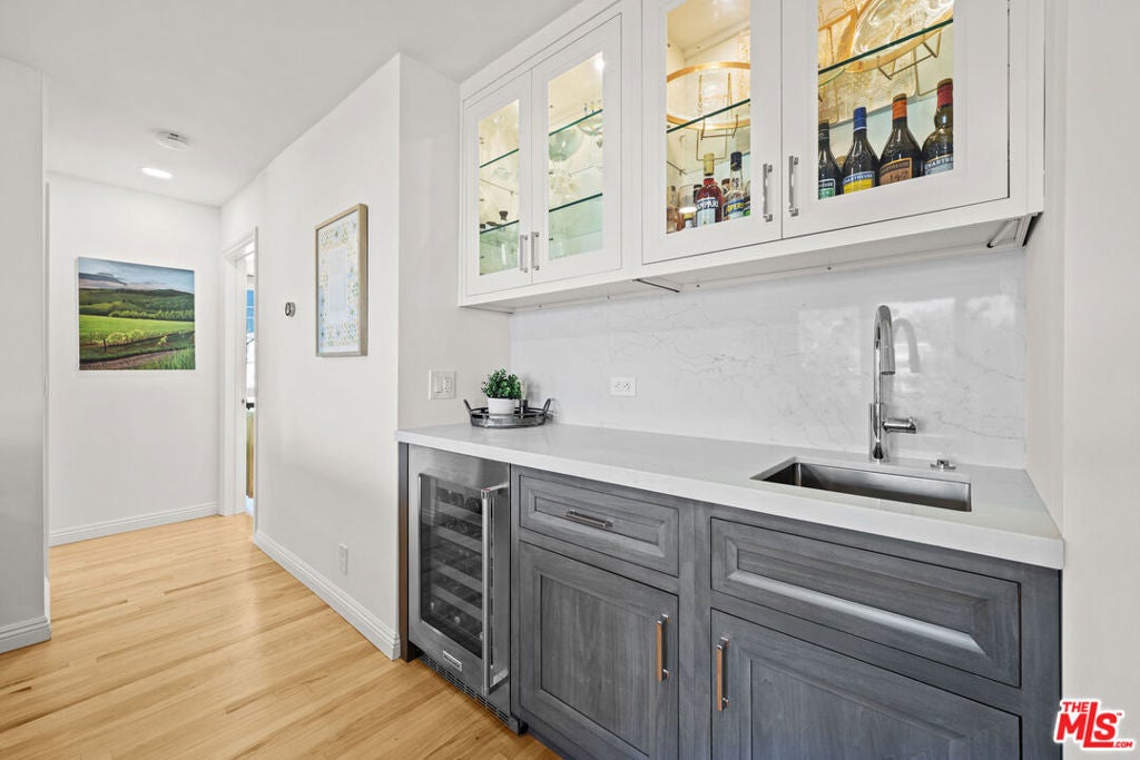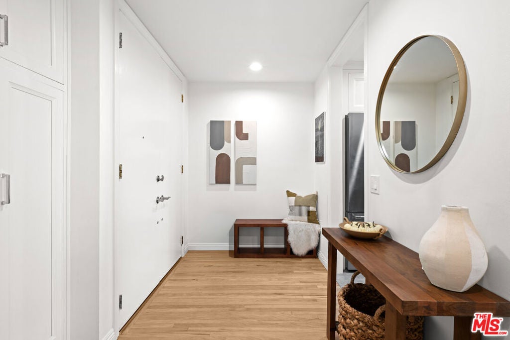 Stunning Top-Floor Corner Condo with Panoramic Views in Prime Brentwood! Discover this gorgeous front-facing 2-bedroom, 2.5-bathroom condo spanning 1,403 sq ft, perfectly positioned on the top floor of a beautifully maintained building in the heart of Brentwood. From the moment you enter through the stylish double doors, you're welcomed into a bright, inviting foyer that sets the tone for the elegance found throughout the home. Enjoy unobstructed treetop views that stretch to the mountains, filling the space with natural light and creating a serene and inspiring atmosphere for everyday living. Every inch of this residence has been thoughtfully updated with impeccable taste, showcasing beautifully refinished hardwood flooring, luxurious marble bathroom tiles, quartz countertops, newer kitchen appliances, gorgeous modern cabinets with under-cabinet lighting, a stylish wet bar with built-in wine fridge, recessed lighting, and custom window treatments. The spacious primary bedroom is a peaceful retreat with abundant windows showcasing the inspiring vistas, along with a beautifully updated en-suite bathroom and a generous walk-in closet. The cozy living room offers a comfortable space to unwind, complete with a fireplace for chilly evenings and direct access to your private balcony, perfect for morning coffee, sunset views, evening wine, or simply soaking in the scenery. A chic wet bar with wine fridge enhances the home's entertaining appeal. The fully equipped kitchen offers everything you need for effortless cooking and hosting. Additional highlights include an in-unit washer and dryer, newer HVAC and ducting, an upgraded electrical panel, double-pane windows, two-car parking with a private EV wall charger, secure building access, and unbeatable proximity to Brentwood's fabulous shops, restaurants, and neighborhood conveniences. Building upgrades include newer elevator (2020), newer roof (2022/2023), upgraded landscaping (2021), building exterior painting (2024), and re-striped parking spaces (2025). Experience elevated living, exceptional style, and breathtaking views in this truly remarkable condo that captures the very best of the Brentwood lifestyle! Please submit offers by 4:00 pm on Wednesday, 11/26.