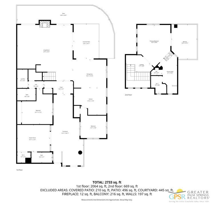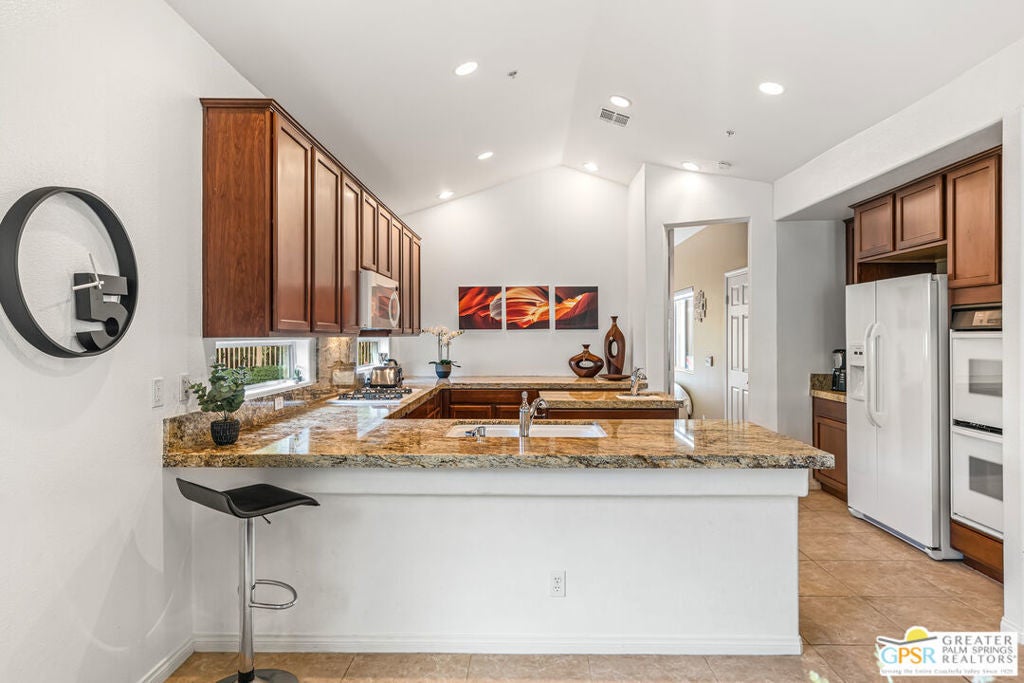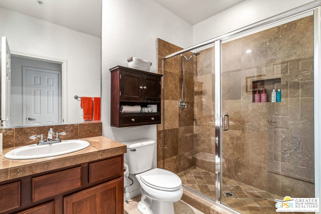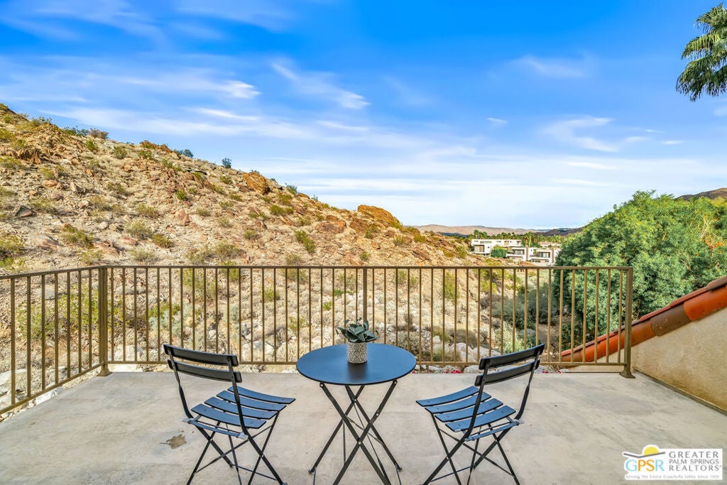 VIEWS and privacy, in South Palm Springs. This two-story unit offers natural scenic beauty from every room, with 2,873 square feet of living space, featuring three bedrooms, den/office, and three bathrooms. The floorplan includes a spacious living area with fireplace and wet bar, an open kitchen with counter seating. Upstairs, primary suite with private balcony has amazing mountain views & views to down valley city lights. Primary bath features dual-sided fireplace leading to a spa-like bathroom with soaking tub and stall shower. Additional features: a gated entry courtyard, an oversized Casita with a private bath, and multiple private patio areas for lounging, dining, sunning, and stargazing. Inside tile flooring in common areas, carpeted bedrooms. The Canyon Heights community has exceptional amenities: pools/spas, tennis courts/pickleball courts, a clubhouse, exercise room, and direct access to the Lykken Hiking Trail & Oswit Canyon Preserve. Two championship golf courses nearby, & minutes to downtown Palm Springs. On Fee land (NO LEASE) in south Palm Springs, in a well maintained community.