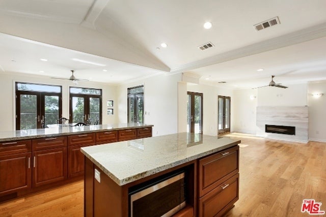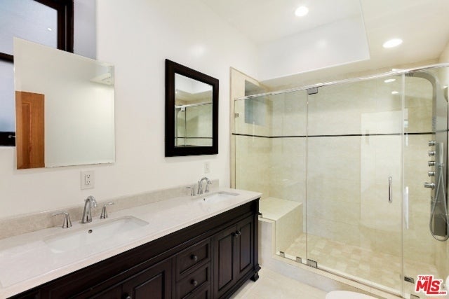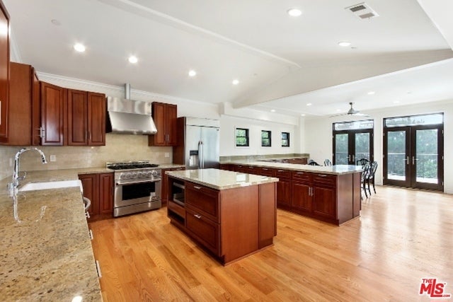 Custom Complete Rebuilt Home in Santa Monica. Located in one of the most sought-after streets in Sunset Park. This is a great house for entertaining with its open and expansive floor plan and approx. 8500 sqft sprawling lot with fabulous views. Enormous patio deck on the upper level overlooking a lush and maniucred backyard. Large open kitchen w/ stainless steel appliances, granite counter tops and custom cabinetry that features excellent cabinet storage. Hardwood floors and recessed lights throughout. Secondary family room in the lower level w/ French doors that open to the patio and yard. Bathroom with shower and 2nd dishwasher, kitchen sink just off lower level patio for convenient cleanup of al fresco dining. Gas fireplaces on both floors. Laundry room on lower level off garage. Large 2 car private garage as well as 2 additional covered spaces + additional parking on the spacious long driveway. Currently partially furnished with 3 new beds, two new wall mounted televistions and 2 dining tables.