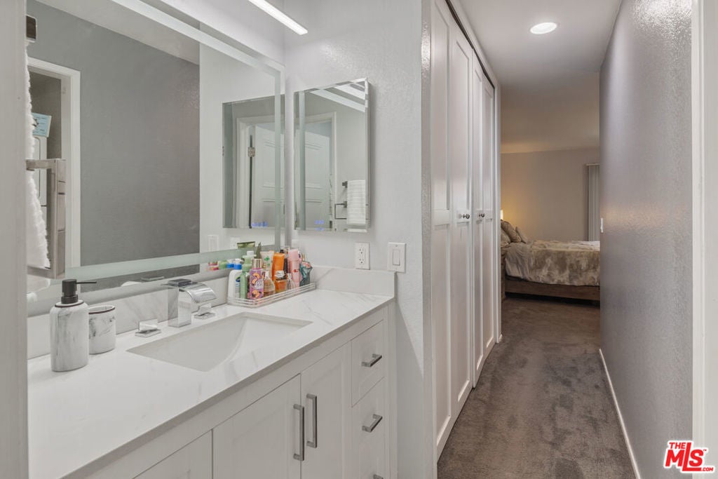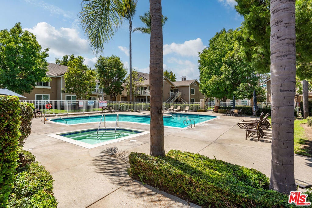 This lovely contemporary one story 2 bedroom plus den with 2 baths is in the highly sought-after Carlton Square gated community. The spacious living area is perfect for entertaining with a fireplace, wood laminate flooring and glass slider doors to a covered private patio. The open cook's kitchen has gorgeous granite counters and pretty tile backsplash. A spacious primary bedroom with great closet space offers an ensuite bathroom with upgraded vanity and new lighted mirror. There's a bonus patio off the primary with a storage closet. A second bedroom has convenient built-in drawers and bookcase. The second bathroom has been upgraded too with a new vanity and lighted mirror. Just off the main living space, you'll find a den with double doors and built-ins perfect for an office or a third bedroom. Additional features are upgraded doors, dual pane windows, central air conditioning and heat, and a stack washer/dryer. Two dedicated parking spaces, one directly outside the unit and the other right across in a carport with storage completes this great property. The affordable HOA dues include on-site management, 24-hour security patrol, community clubhouse, 2 pools, 2 spas, tennis and basketball courts, a kids playground area and visitor parking. Don't miss this fantastic place to call home minutes away from Inglewood's vibrant entertainment and sports district: Sofi Stadium, Kia Forum, Intuit Dome, Cosm, Cinepolis Luxury Cinemas and much more!