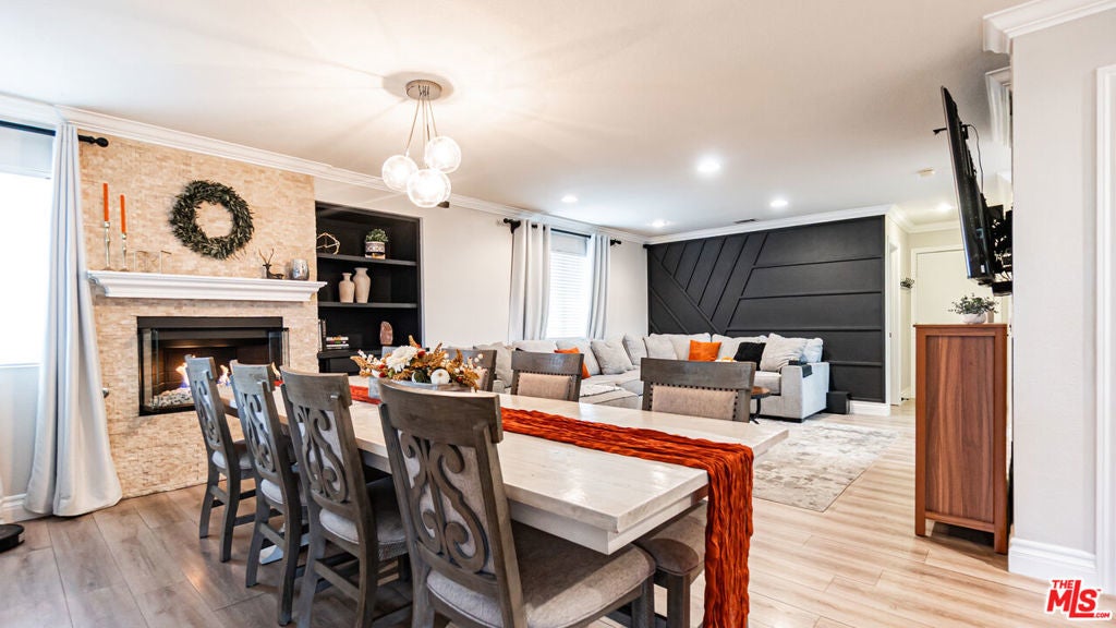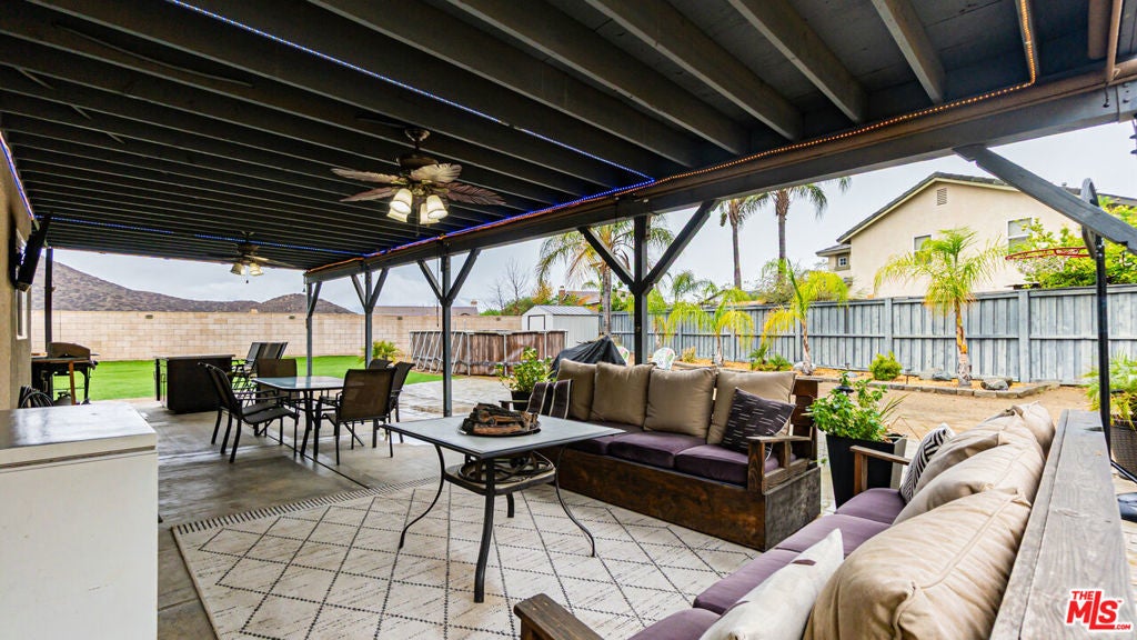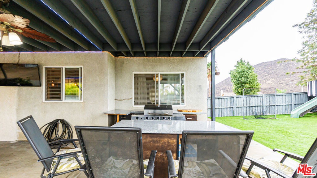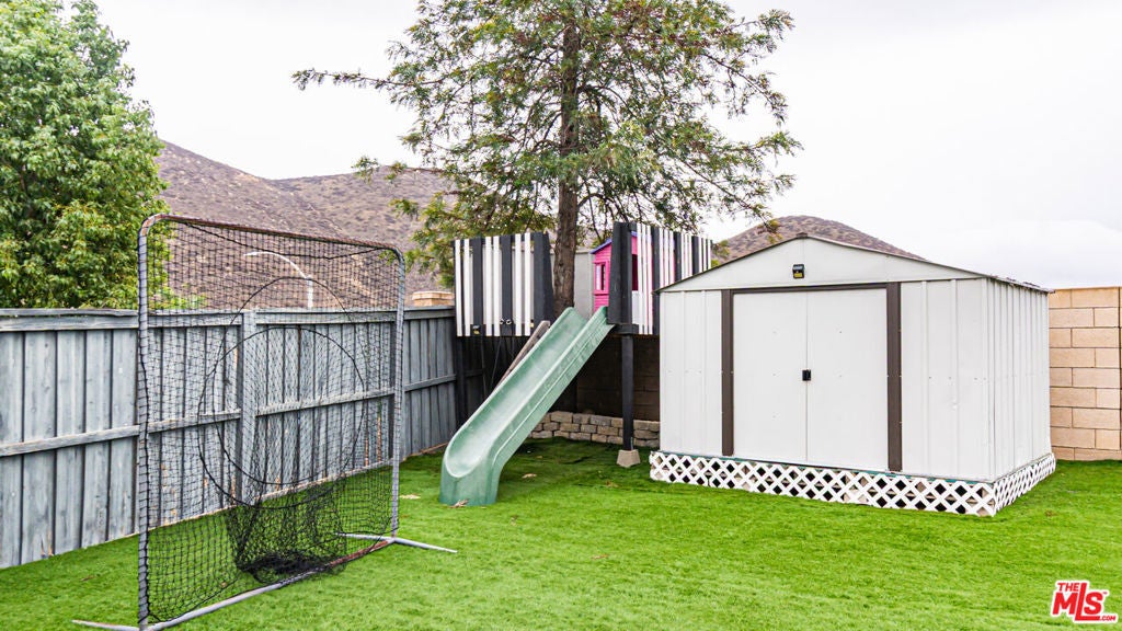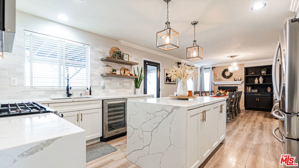 Beautifully Upgraded 5-Bedroom Home On Huge Corner Lot in Lake Elsinore! Sitting on just over 19,000 square feet, this 2-Story Stunner has undergone extensive remodeling & has designer finishes throughout. Modern open-concept layout. Formal living room area w/ soaring dual-height ceilings. Full bar area w/ boxed-in ceiling. Family room w/ custom wall inlays & built-ins. Stunning Chef's kitchen w/ custom shaker cabinetry, quartz countertops, subway tile backsplash, center island w/ pendant lighting, stainless-steel appliances, wine cooler, & walk-in pantry. Adjacent dining area w/ stone fireplace. Spacious 2nd floor bedrooms w/ vaulted ceilings. Master Bedroom Suite w/ Huge wrap-around balcony (views of the Lake & Stadium), dual vanities, soaking tub, & standing shower. Huge private backyard w/ covered patio, grassy area, playhouse, & shed - perfect for entertaining! Laundry room w/ storage. Sunrun solar system. 3-car garage w/ storage & plenty of driveway parking (3rd garage space has drive-thru door into backyard). Full front & rear irrigation systems. Just minutes to the best shopping, dining, & entertainment the area has to offer, as well as excellent local schools, parks, hiking trails, & Lake Elsinore itself. A unique opportunity that is not to be missed - turnkey!