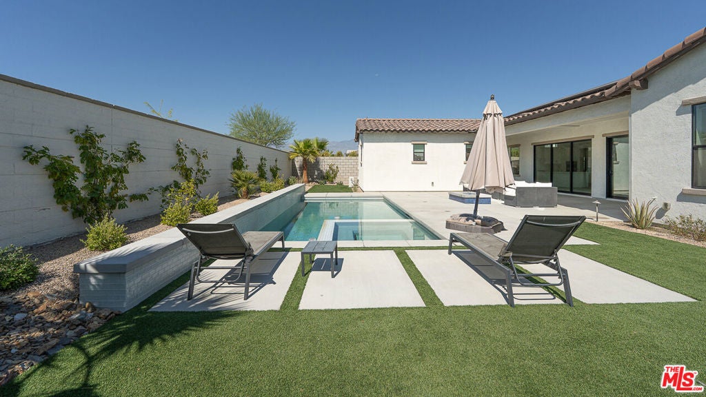 Welcome to Montage Palm Desert! This stunning Spanish Elevation LX Series home offers 5 bedrooms and 4.5 bathrooms, including a private detached casita with its own entrance, bathroom, air conditioning, and solar panelsideal as a guest suite or pool cabana. Spanning approximately 3,297 sq ft, the open-concept layout includes a spacious media/club room, dedicated office space, and soaring high ceilings that create a bright, airy ambiance. The interior is elegantly appointed with white cabinetry, quartz countertops, stylish tile surrounds, and modern flooring throughout. Enjoy the best of desert living with a pebble pool and spa, basic rear landscaping, and a 3-car garage configuration2 attached and 1 detached.