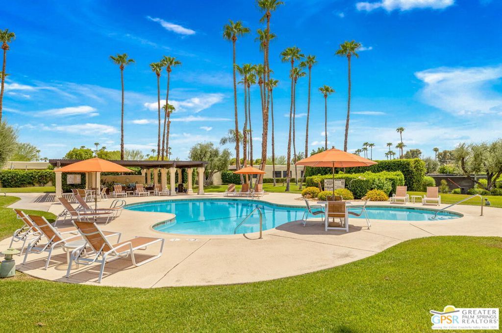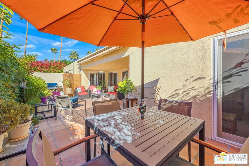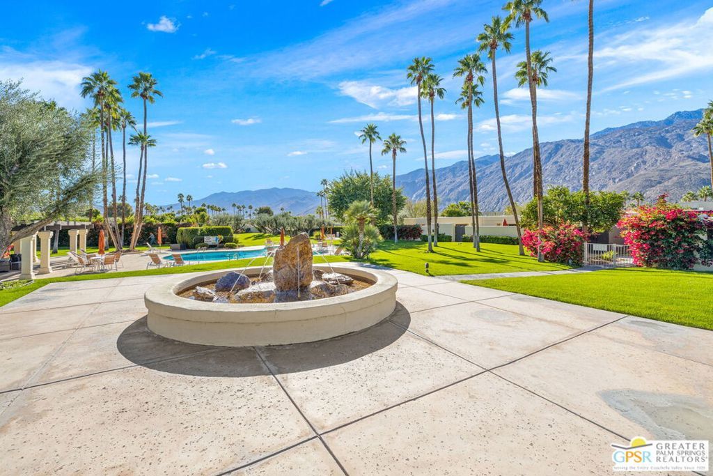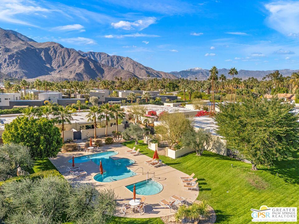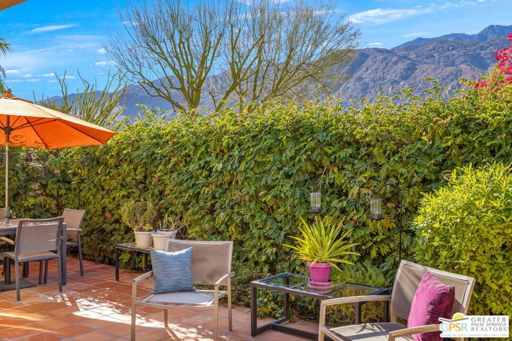 For those who know, the ONE TO SEE! Welcome to Greenhouse with its next level setting, expansive green lawns, dramatic mountain views, and wide open pool areas framed by umbrellas that deliver exceptional quality of life in one of the finest condominium settings in Palm Springs. No power lines overhead either. A sunken, lighted tennis court plus pickleball and a fabulous outdoor pavilion add to the appeal. This 2 bedroom, 2 bath home enjoys San Jacinto Mountain views to the west from every room plus the private patio. Living and dining areas connect easily to the patio. The kitchen features cultured stone counters and stylish cabinetry, with Mexican Saltillo tile flooring in the main living areas. Bedrooms enjoy a nice separation. The ensuite primary includes a separate office area and direct access to the patio, and both bedrooms feature plush carpet for added comfort. Additional highlights include retractable sunshades on all windows, a 17 foot SunSetter awning that opens at the touch of a button to provide cooling shade along the patio during the afternoons, newer dual pane glass sliders throughout, and newer sinks and fixtures in both the kitchen and bathrooms. LED landscape lighting adds yet another thoughtful detail. The proximity to The Movie Colony completes the picture of easy Palm Springs living.