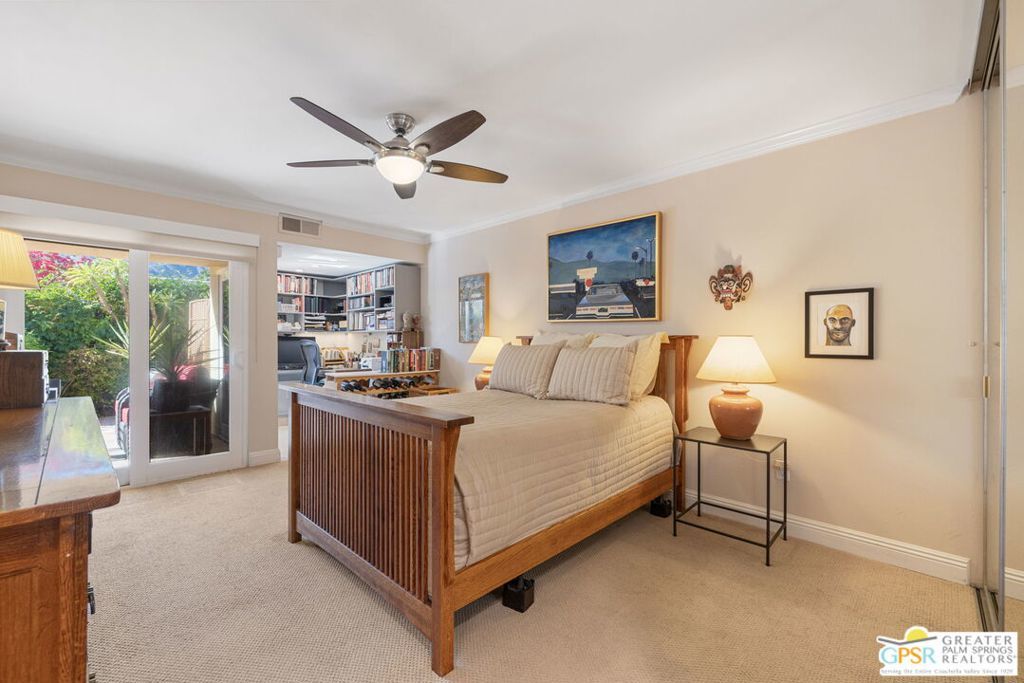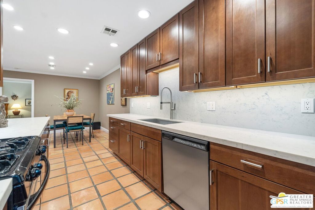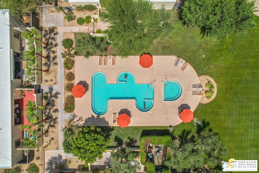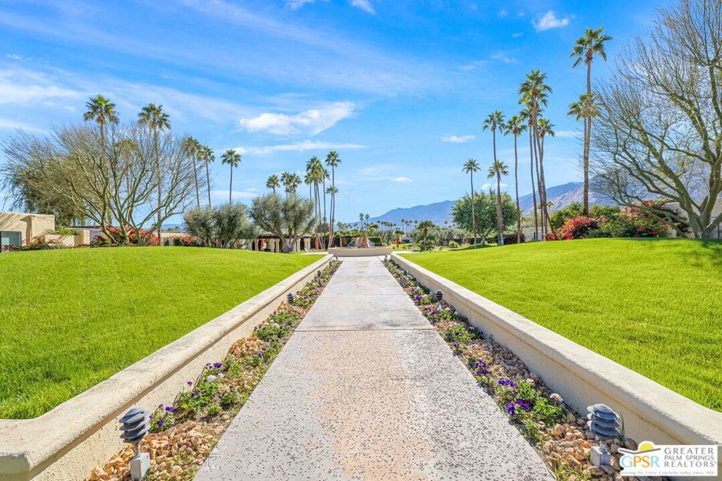 For those who know, the ONE TO SEE! Welcome to Greenhouse with its next level setting, expansive green lawns, dramatic mountain views, and wide open pool areas framed by umbrellas that deliver exceptional quality of life in one of the finest condominium settings in Palm Springs. No power lines overhead either. A sunken, lighted tennis court plus pickleball and a fabulous outdoor pavilion add to the appeal. This 2 bedroom, 2 bath home enjoys San Jacinto Mountain views to the west from every room plus the private patio. Living and dining areas connect easily to the patio. The kitchen features cultured stone counters and stylish cabinetry, with Mexican Saltillo tile flooring in the main living areas. Bedrooms enjoy a nice separation. The ensuite primary includes a separate office area and direct access to the patio, and both bedrooms feature plush carpet for added comfort. Additional highlights include retractable sunshades on all windows, a 17 foot SunSetter awning that opens at the touch of a button to provide cooling shade along the patio during the afternoons, newer dual pane glass sliders throughout, and newer sinks and fixtures in both the kitchen and bathrooms. LED landscape lighting adds yet another thoughtful detail. The proximity to The Movie Colony completes the picture of easy Palm Springs living.