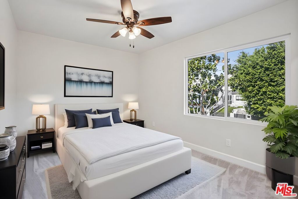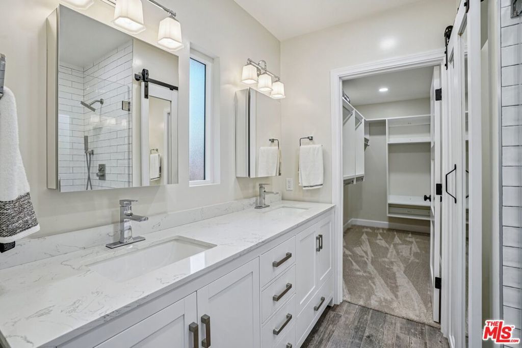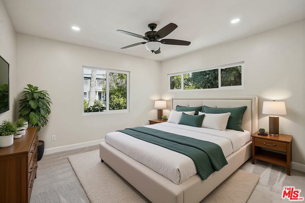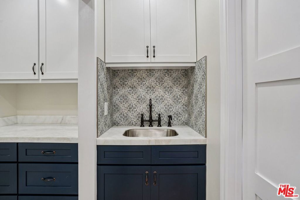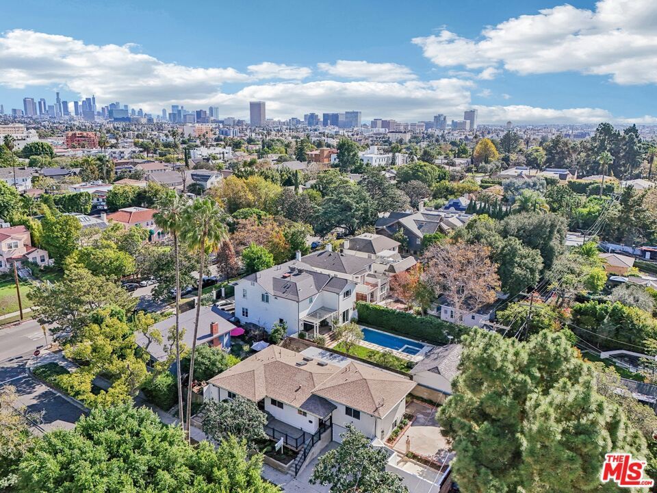 This beautifully renovated Larchmont residence blends contemporary elegance with timeless charm. Step inside through a new mahogany front door to a bright, airy living room featuring vaulted ceilings, recessed LED lighting, and white oak hardwood floors. The open layout flows into a custom chef's kitchen equipped with a Forno Capriasca 36" 6-burner range, custom range hood, quartz waterfall countertops, LED cabinet lighting, a Bosch panel-ready dishwasher, farmhouse sink, counter-depth 4-door refrigerator, decorative tile backsplash, brand-new cabinetry with crown molding, and a walk-in pantry.An inviting family/game room offers the perfect space for entertaining, complete with a custom bar, sink, dual beverage/wine refrigerators, skylights, and French doors leading to two outdoor patios: one covered with pavers and ceiling-fan lighting, the other a peaceful hardscaped retreat.The main-level primary suite features a custom walk-in closet and a spa-inspired bath with dual vanities, an oversized deco-tiled shower, and a mirrored barn door enclosing the private toilet area. Upstairs, two additional bedrooms include custom closets and share a thoughtfully designed bathroom with a dual-access vanity.Extensive upgrades include a new HVAC system and ducting, dual-pane windows, updated electrical and plumbing, custom lighting, skylights, redwood fencing, redwood decking with Trex railing, new garage door, and refreshed landscaping with LED lighting and drip irrigation.Ideally located near Larchmont Village with convenient access to Metro transit and major freeways.