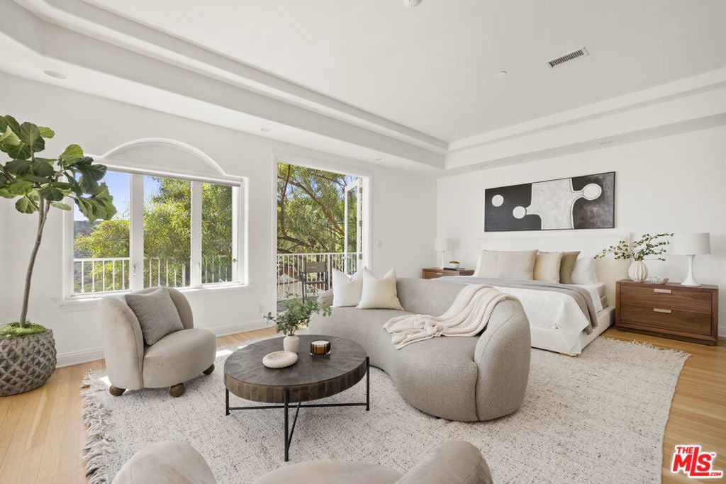 Back on the market at an unmatched price per square foot. This thoughtfully designed residence combines clean, modern architecture with exceptional scale and natural light throughout. Ideal for art collectors and entertainers alike, the home features expansive walls, soaring ceilings, and skylights that illuminate its open layout. The main level offers formal living and dining rooms, a large entertainment room, and a chef's kitchen with premium appliances. Six bedrooms include a stunning primary suite with dual spa-style bathrooms and oversized walk-in closets. Two additional en-suite bedrooms on the same level offer both privacy and proximity, perfect for family living. On the lower level, two guest suites- each with its own living area and kitchenette- provide comfort and flexibility for extended stays or multigenerational living. Additional amenities include a library, gym, auna, custom built-ins, wine storage, and multiple wet bars. French doors open to private balconies with sweeping canyon, city, and ocean views, while the backyard offers a pool and spa designed for entertaining. Located in one of Bel Air's most prestigious neighborhoods, this home delivers extraordinary space, luxury, and lifestyle. Agent is related to ownership.