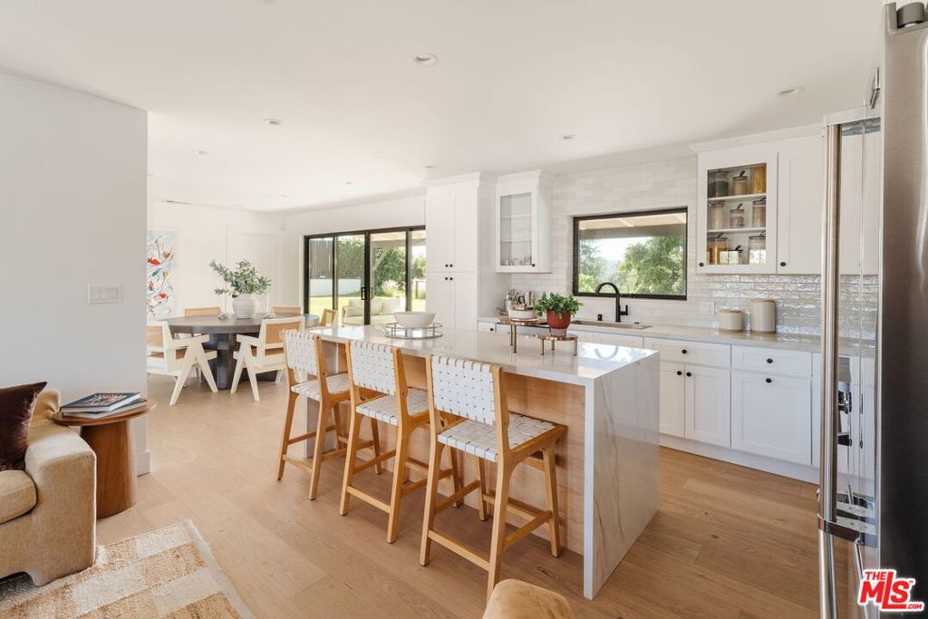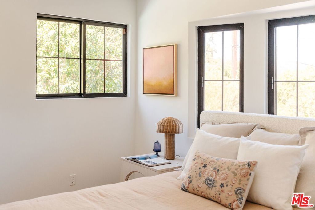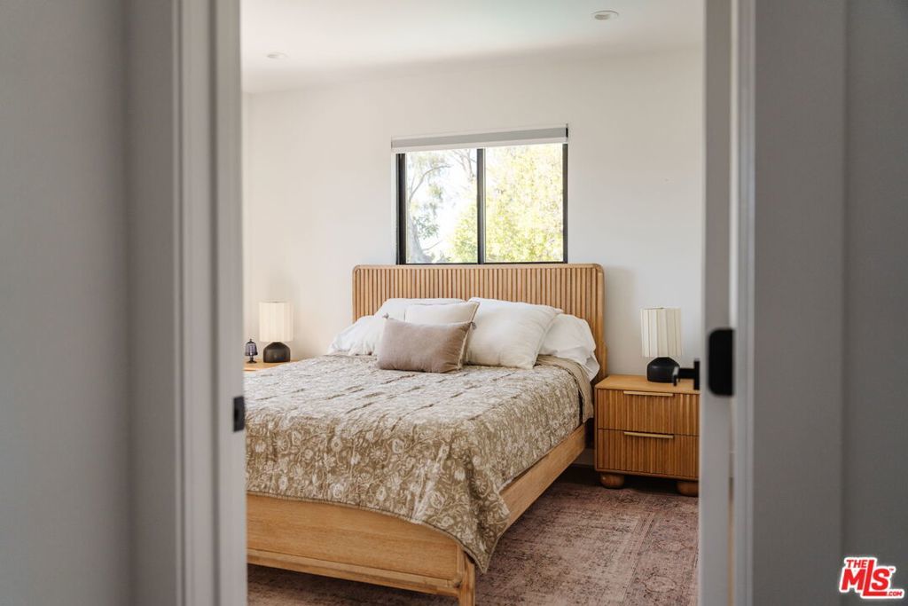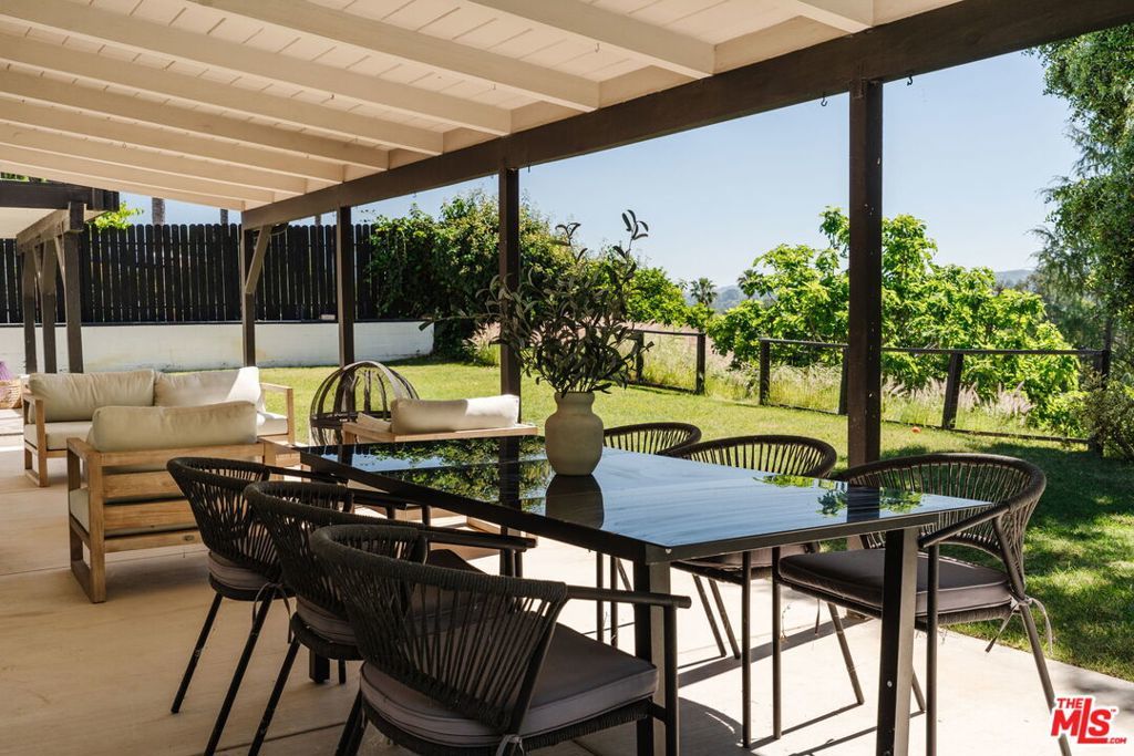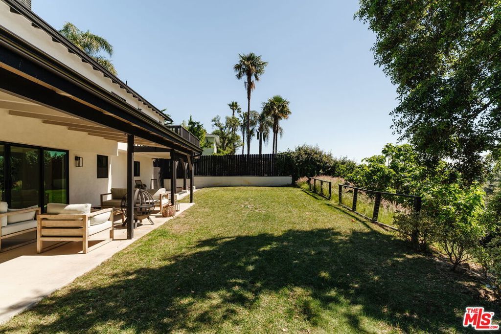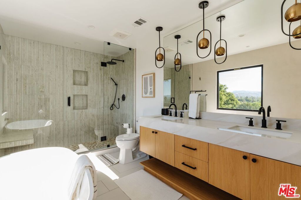 Perched above the tree-lined streets of coveted Walnut Acres, this reimagined 3,000 sq ft estate sits on an 11,017 sq ft lot within a peaceful double cul-de-sac. Sweeping valley and mountain views are visible from nearly every room, while bold black-framed windows and lush landscaping create instant curb appeal. A steel-and-glass pivot entry opens to a soaring two-story foyer with skylight and hardwood floors. The open-concept great room flows seamlessly between living, dining, and kitchen with oversized sliding glass doors blending indoor and outdoor living, inviting the California breeze and golden light inside. The gourmet kitchen features quartz countertops, Viking appliances, custom white shaker cabinetry, and a waterfall island all overlooking the lush garden with mountain views beyond. The primary suite offers a private balcony with hillside views and a spa-caliber bath with freestanding soaking tub, rainfall shower, and floating dual vanity. Upstairs, three guest bedrooms are bright and well-appointed one with an ensuite, the other two sharing a spacious designer bathroom. Outside, a pergola anchors an outdoor lounge and dining area alongside a pool within a privacy-hedged garden. The attached 1BD/1BA ADU is a spacious, light-filled retreat with a private entrance and full kitchen ideal as a guest suite, home office, or rental.