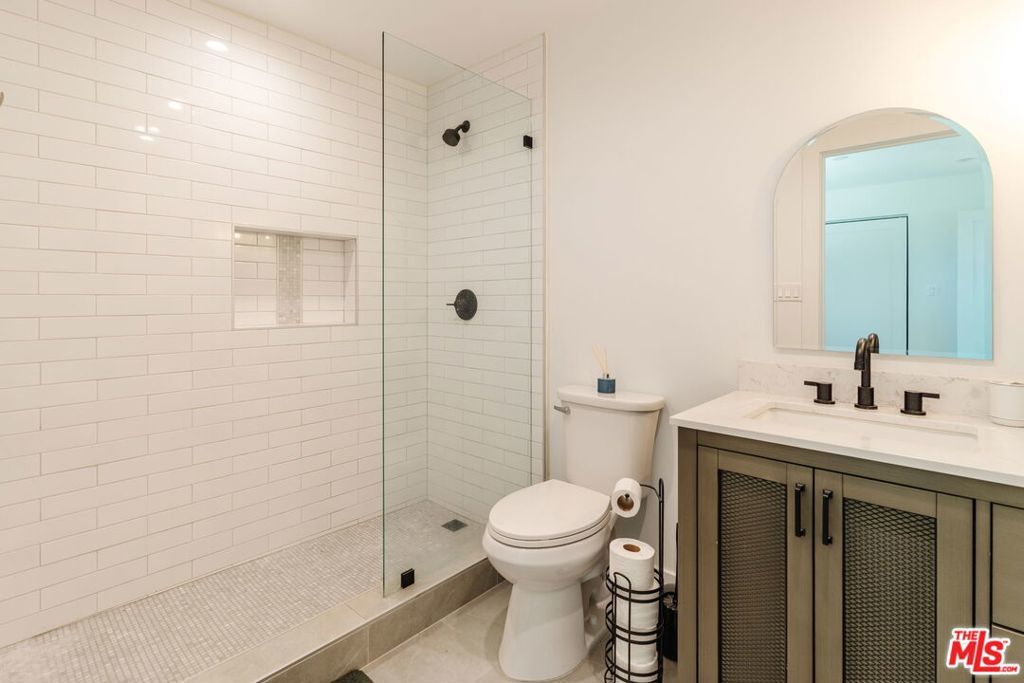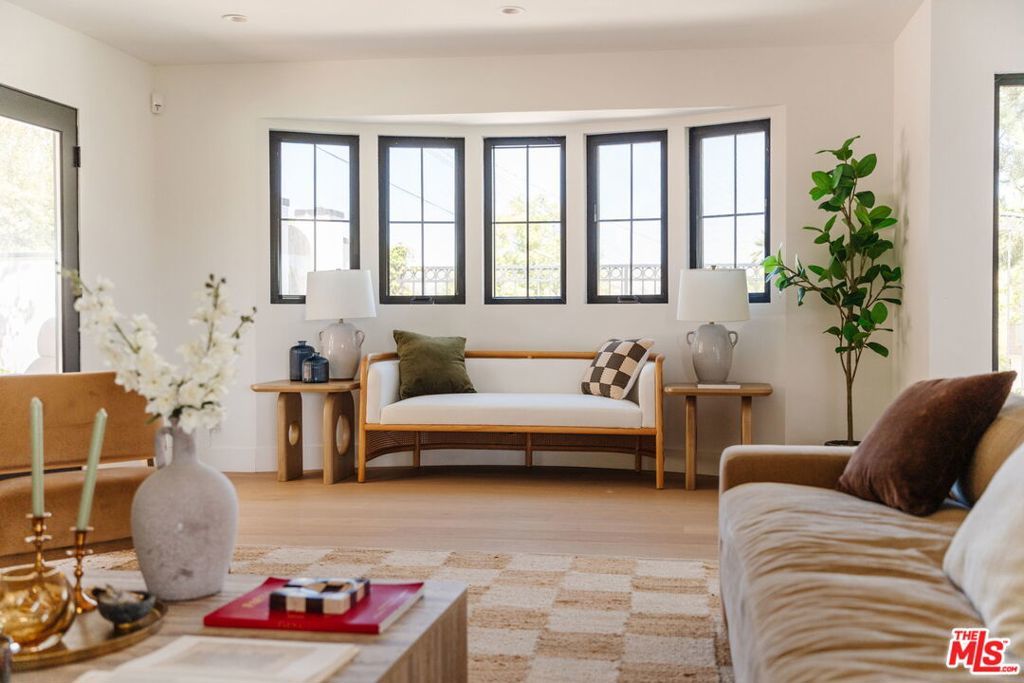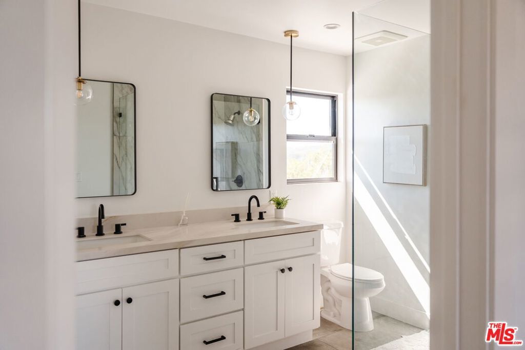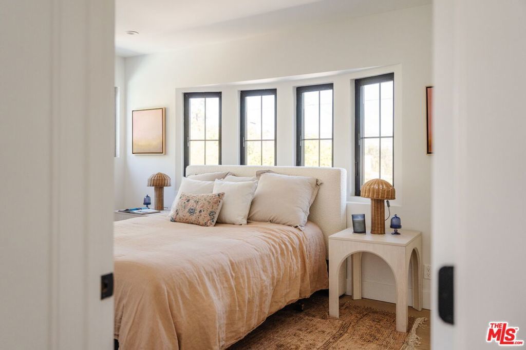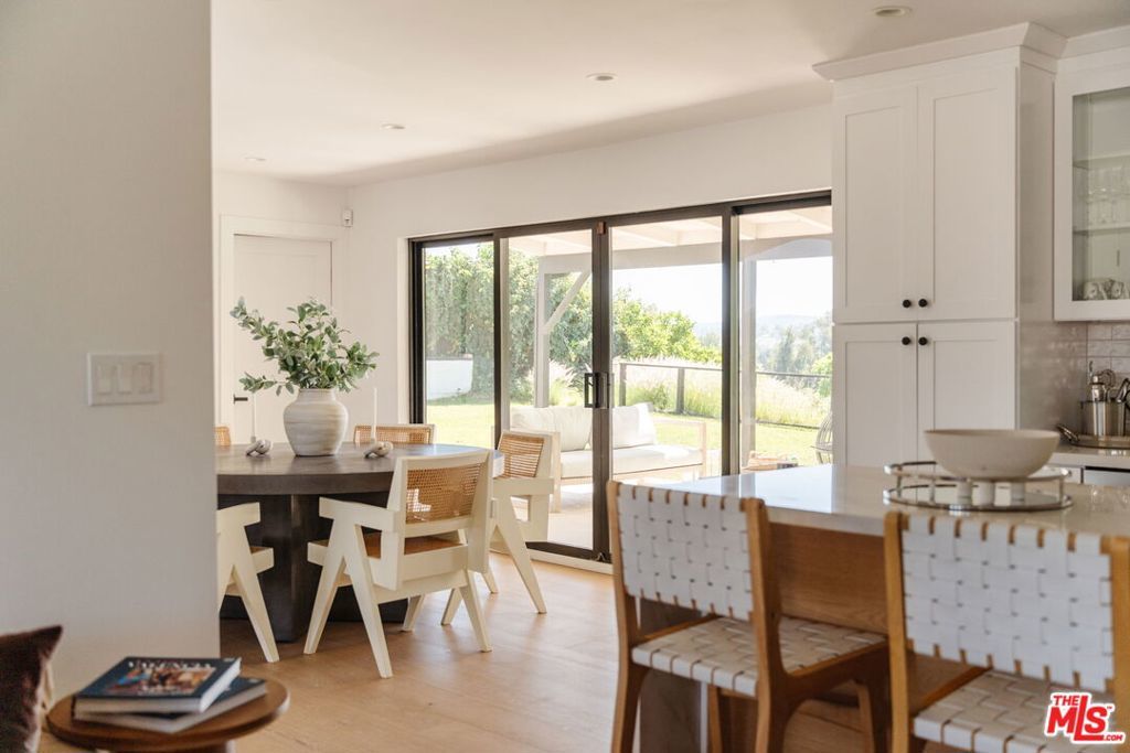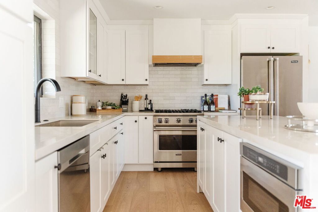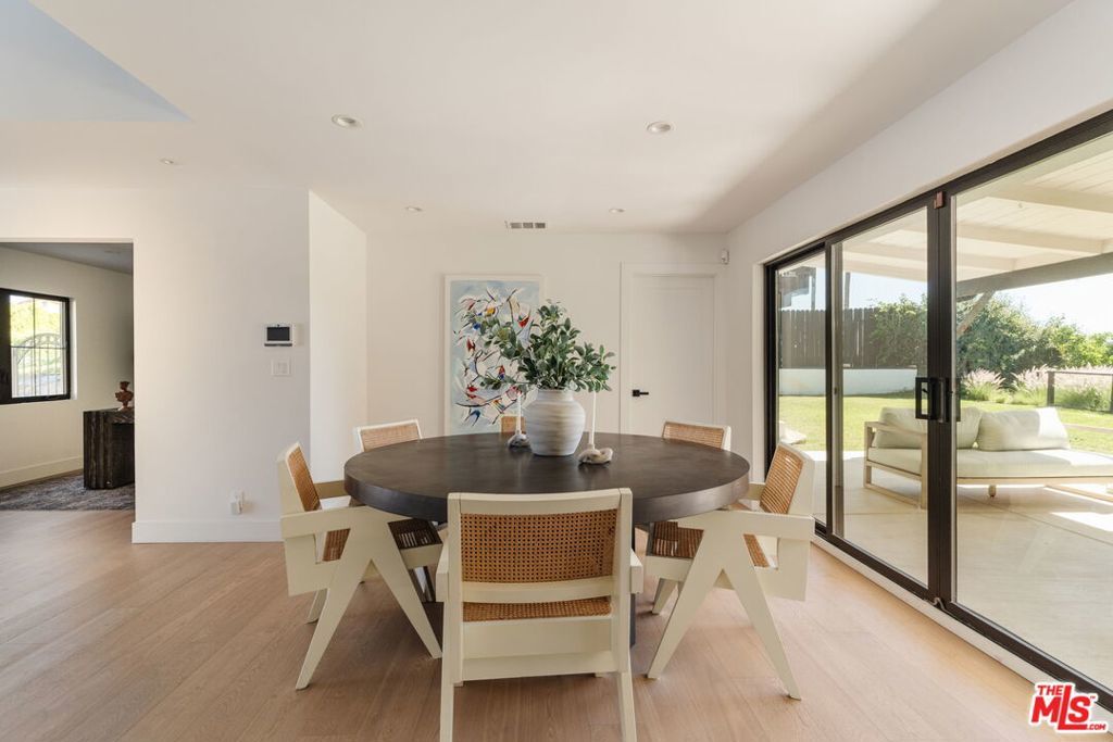 Perched above the tree-lined streets of coveted Walnut Acres, this reimagined 3,000 sq ft estate sits on an 11,017 sq ft lot within a peaceful double cul-de-sac. Sweeping valley and mountain views are visible from nearly every room, while bold black-framed windows and lush landscaping create instant curb appeal. A steel-and-glass pivot entry opens to a soaring two-story foyer with skylight and hardwood floors. The open-concept great room flows seamlessly between living, dining, and kitchen with oversized sliding glass doors blending indoor and outdoor living, inviting the California breeze and golden light inside. The gourmet kitchen features quartz countertops, Viking appliances, custom white shaker cabinetry, and a waterfall island all overlooking the lush garden with mountain views beyond. The primary suite offers a private balcony with hillside views and a spa-caliber bath with freestanding soaking tub, rainfall shower, and floating dual vanity. Upstairs, three guest bedrooms are bright and well-appointed one with an ensuite, the other two sharing a spacious designer bathroom. Outside, a pergola anchors an outdoor lounge and dining area alongside a pool within a privacy-hedged garden. The attached 1BD/1BA ADU is a spacious, light-filled retreat with a private entrance and full kitchen ideal as a guest suite, home office, or rental.