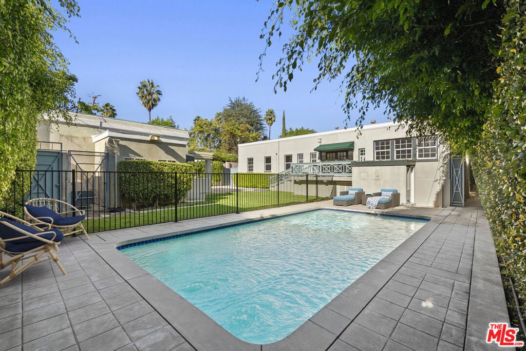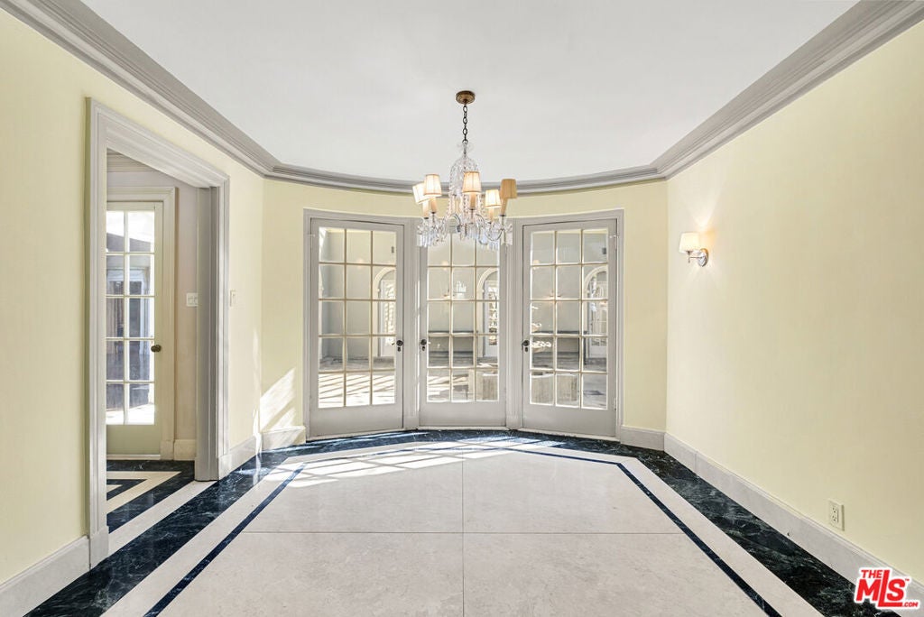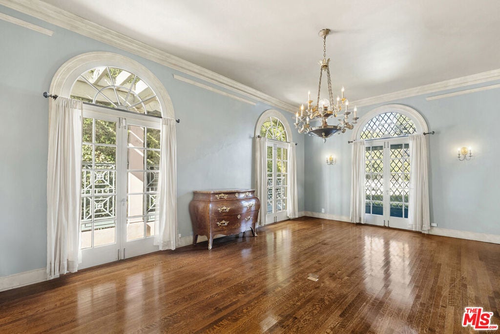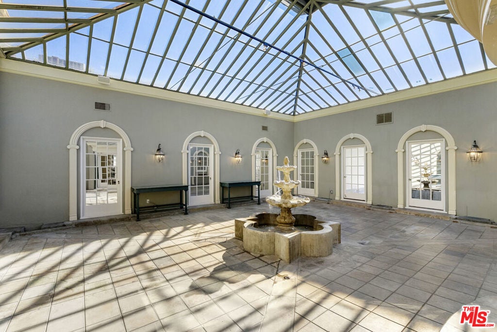 Welcome to The Rexford Estate, where dreams come true. Located in the Beverly Hills flats just around the corner from the legendary Beverly Hills Hotel, you will instantly fall in love with this magical French-style estate with extraordinary curb appeal. Surrounded by mature landscaping, this luxurious manor is privately set behind a grand custom gate, followed by a second gate before you reach the front door. Step through the marble entryway into the grand living room with soaring vaulted ceilings, elegant French doors, gorgeous columns, rich hardwood floors, and a statement fireplace that anchors the room. The formal library exudes classic Beverly Hills style, with custom wood built-ins and exquisite details, while the beautiful dining room glows with a real sense of occasion, great for entertaining. At the heart of the home is a large atrium with a serene water fountain. This breathtaking, one-of-a-kind courtyard features a glass ceiling that fills the room with natural sunlight by day and starlight by night. This estate offers five bedrooms and eight bathrooms, with each bedroom graced by its own en-suite. Additional spaces include a cheerful breakfast room overlooking the atrium with a Quatrefoil fountain, a butler's pantry off the kitchen, and an inspiring office, family or bedroom option that opens to the back terrace through French doors. Downstairs, you will find a spacious laundry room, versatile bonus room, and dedicated storage area. Outside, the enchantment continues with a sparkling pool, expansive yard, and custom-built BBQ area. The three-car garage with alley entrance is complemented by a long driveway that can accommodate a fleet of six or more vehicles. The residence also comes with the peace of mind of a full security and camera system, plus the benefit of having Beverly Hills police and fire departments three blocks away. Built in 1923, the home has been meticulously maintained with love and intention. While it is a stunning showpiece as-is, it also offers room to update with grace. Beyond its beauty and architectural pedigree, Rexford carries a remarkable legacy. It has been in the family with lots of Hollywood television, movie, and radio history for decades. This is a rare opportunity to own a magnificent, inviting and undeniably magical Beverly Hills property. VIRTUAL STAGING.
