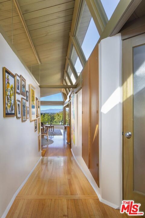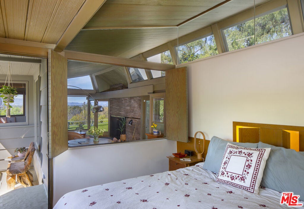 The Roxy Roth House, 1946. R.M. Schindler, Architect. Commissioned by a screenwriter and actor, the Roxy Roth House has been cared for by only four owners across nearly eight decades, all creatives themselves. Critic Reyner Banham observed that Schindler "designed as if there had never been houses before," a sentiment fully realized here in the inventive choreography of light, space, and privacy. Living here feels less like inhabiting a traditional house and more like inhabiting a work of art. Sited above the street at the end of a cul-de-sac, the residence offers both seclusion and sweeping, cinematic views across the San Fernando Valley. An understated entry leads to a generous first-floor bedroom before ascending into the main living level, where light pours in from three directions by day, and creative interior lighting brings sculptural warmth by night. Space unfolds gently, with shifting planes of light dissolving the boundary between indoors and out. The main floor's living and dining area centers on a massive picture window framing the valley panorama. The room is flanked by Schindler's original built-ins, functional alcoves and hidden storage. The primary suite includes more whimsical touches - a built-in reading light and a folding screen that when opened allows a window into the living room and beyond to the unique valley view. Throughout, Schindler's custom details remain intact, anchoring the home firmly in its architectural lineage. Another defining feature is the approximately 400 sq. ft. writers' studio/office, once the carport and later transformed by architect Barbara Bestor. Lined with a series of dramatic clerestory windows, the space is an inspiring environment for writing, art, or remote work. Outside, native landscaping surrounds the property, while a hillside fire pit and seating area above the house provide sunset views over the valley. Despite its tranquil setting, the location remains convenient, with Carpenter Elementary and Ventura Boulevard just a short walk away. Features: 3 bedrooms; 3 en-suite bathrooms; fireplace; original Schindler built-ins; expansive yard; panoramic views; separate 400 sq. ft. studio/office.