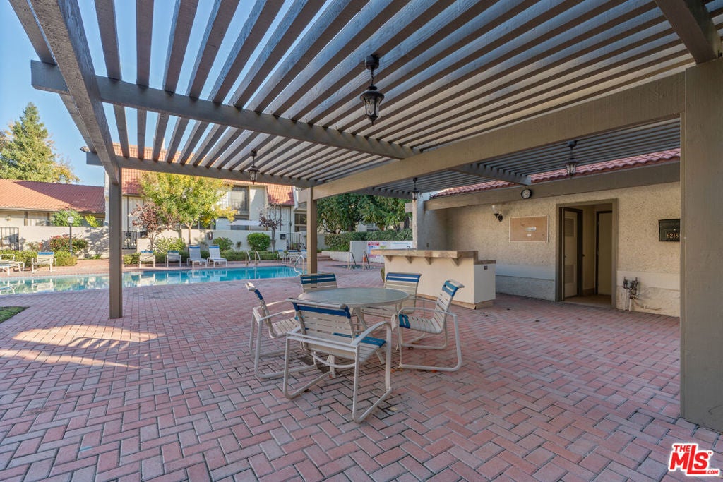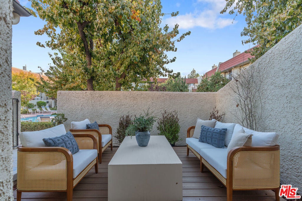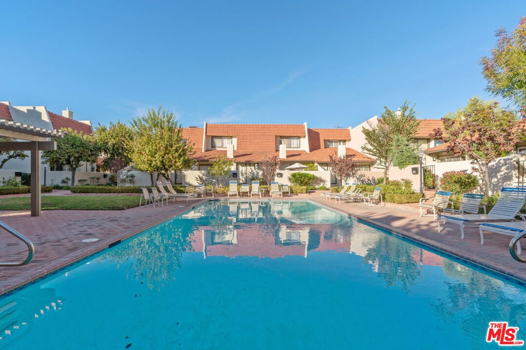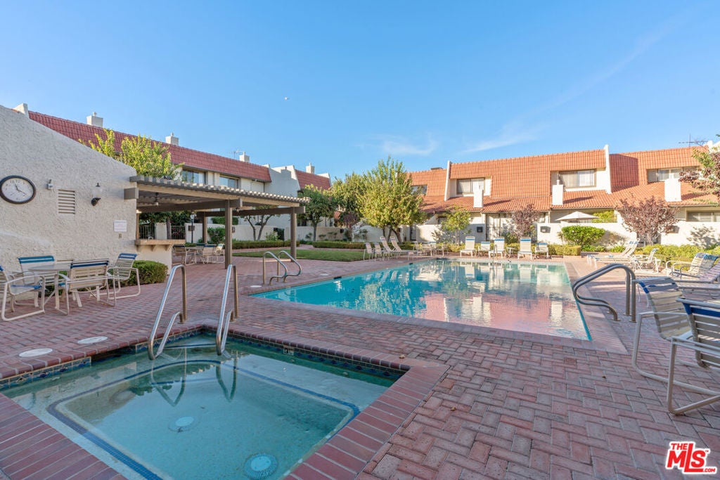 Ideally situated in the coveted Villa Castilla community in the heart of Warner Center and walking distance to the Village, this beautifully updated end unit townhome offers refined comfort and effortless living. The spacious 1,416 sq ft layout includes 2 bedrooms and 2 bathrooms, a gourmet chef's kitchen with a generous dining room with bar area, a private outdoor patio, an attached 2-car garage, and an inviting open-concept living room highlighted by a fireplace. Newly updated chefs kitchen with premium appliances and custom cabinetry featuring a great breakfast dining area. The primary suite is a true retreat, featuring soaring ceilings, walk in custom closet and second closet, an en-suite bath, and a wall of windows that fills the space with natural light while overlooking the serene community courtyard, pool, and spa. Incredible entry level private patio with trex decking and a large 2 car garage with plenty of storage space! Just moments from Westfield Topanga, The Village, Equinox, Shoup Park, premier dining on Ventura Boulevard, and quick 101 freeway access, this exceptional location offers unmatched convenience and a lifestyle of ease.