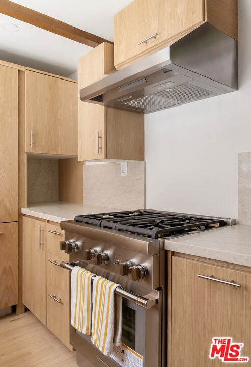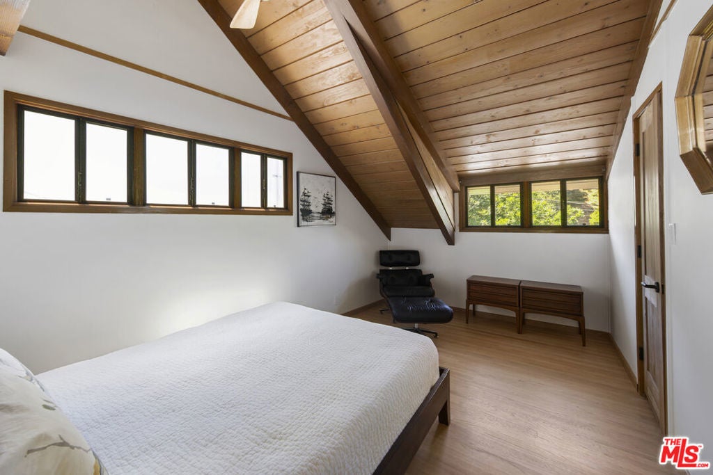 La Maison Bleue is a Mid-Century 1956 Storybook Cottage, perfectly sited in the Hollywood Hills. This Single Family Home has 3+ parking spaces, including a garage! Thoughtfully and completely remodeled to suit contemporary living while honoring its original charm. One bedroom plus a large **loft or second bedroom**. Warm, soft, and grounded in neutral tones, this home radiates tranquility. One must see in person to truly feel the magic. The brand-new kitchen is a chef's dream, featuring brand new high-end appliances, handmade custom White Oak cabinetry, and stunning Taj Mahal quartz countertops. Solid Oak floors flow seamlessly throughout the home. The primary bedroom includes a brand-new en-suite bathroom and a generous walk-in closet. A second full bathroom is conveniently located just off the living room. The laundry area, outfitted with a new LG Wash-tower system, is thoughtfully placed inside the home for ease and comfort. The second bedroom is a versatile loft space complete with a new closet and custom White Oak shelving units. It can easily be enclosed or enjoyed in its current open format, ideal as a guest room, office, or creative studio. Anchoring the living space is a striking brick fireplace wall, adding warmth and character. Step outside into a private Zen retreat: a blooming, auto-irrigated garden that's both enchanting and easy to maintain. At the top of the garden, a whimsical He-She Shed invites imagination and inspiration. Additional features include copper plumbing throughout, a brand-new 200-amp electrical panel, plus another 100-amp panel setup for a hot tub and sauna. This single-family residence offers the rare charm of a canyon cottage with the price tag of a WEHO condo but without the high monthly fee! Completely turn-key and ready to move in. This home is gorgeous!