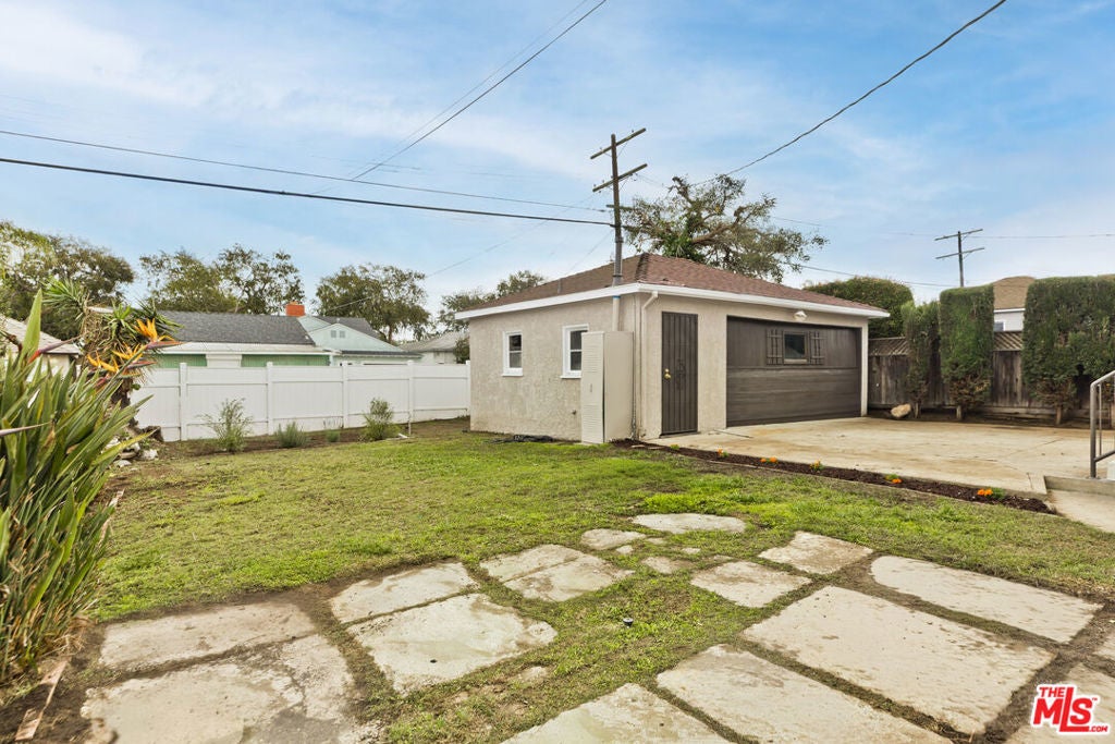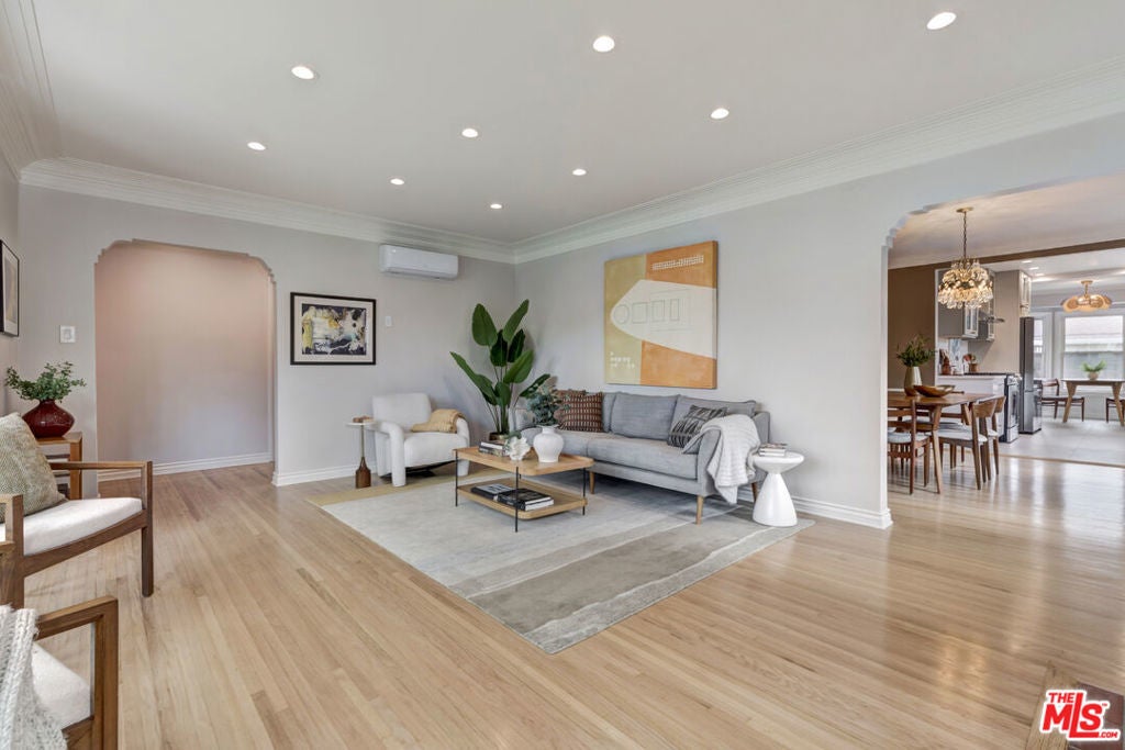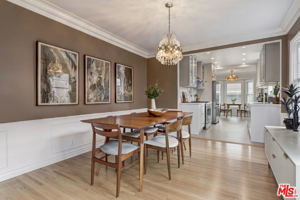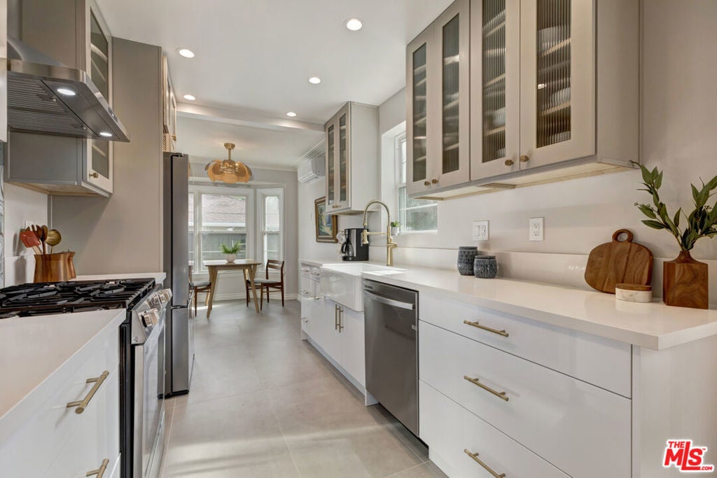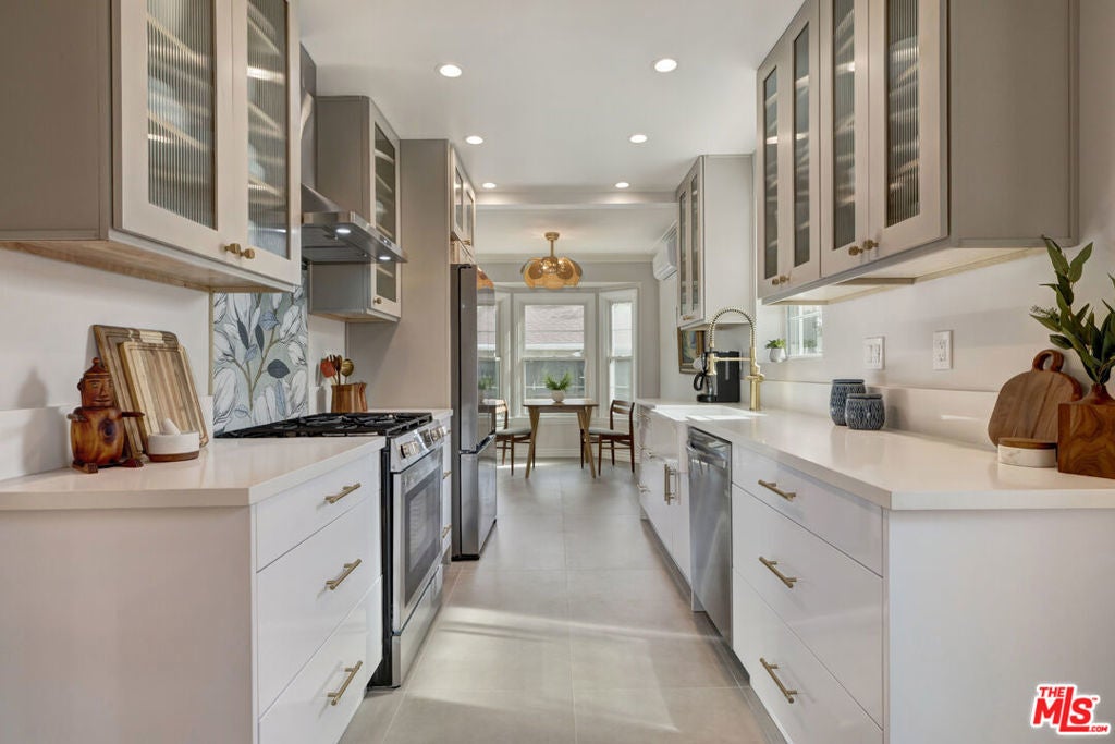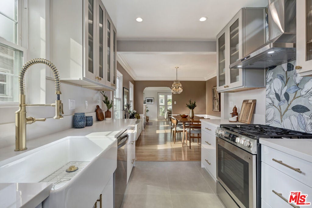 Impeccably and thoughtfully revitalized, this traditional home combines its original 1947 historic charm with modern updates and an open, entertaining floor plan, totaling 1,638 sq ft on a 7,023 sq ft flat lot with a detached 2-car garage. The home features custom touches, including original, elegant multi-draped archways in the sizable living room and dining rooms, recessed lighting, and beautiful hardwood floors throughout, recently uncovered and refinished for the first time in over 60 years! The living room is light filled, with a large, newer multi-panel bay window, a gorgeous decorative fireplace with a wood mantel (see report for minor repairs), and the formal dining room has the original, beautiful wainscoting and crown molding and opens to the kitchen! The kitchen has been stylishly remodeled with custom cabinetry, quartz countertops, a newer stainless-steel stove, refrigerator, and dishwasher, and handcrafted porcelain tiles. It features a breakfast nook with a multi-panel bay window that overlooks the expansive yard. There is plenty of storage, including a walk-in laundry area, a separate linen closet, and a coat closet. The three spacious bedrooms all have wood floors, crown molding, newer windows, and sizable closets. The main bathroom is gorgeously remodeled with double sinks and a shower/ bathtub. The primary bedroom has an elegant ensuite bathroom with stunning ceramic and marble tile, and large sliding glass doors that exit to a covered hardscaped flagstone patio, great for al fresco dining, a lounge area, and a large backyard that is perfect for indoor-outdoor enjoyment. The detached garage is excellent for the car enthusiast, studio artist, or ADU down the road. The home has copper plumbing, an updated electrical panel, and is in a sought-after neighborhood. This centrally and conveniently located home is in a quiet, vibrant neighborhood, with easy access to shopping, grocery stores, restaurants, and parks, and a quick commute to Culver City, Santa Monica, and LAX. Nearby is Rancho Cienega Recreation Center and Kenneth Hahn Park, offering hiking trails, picnic areas, and panoramic views.