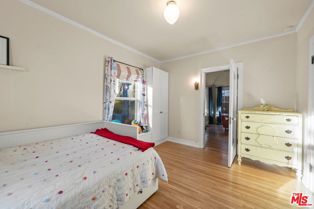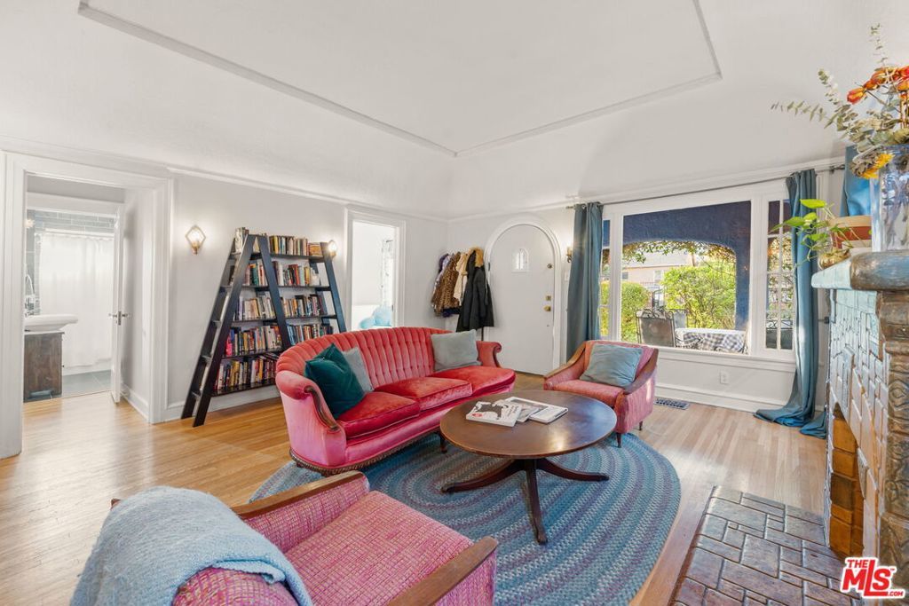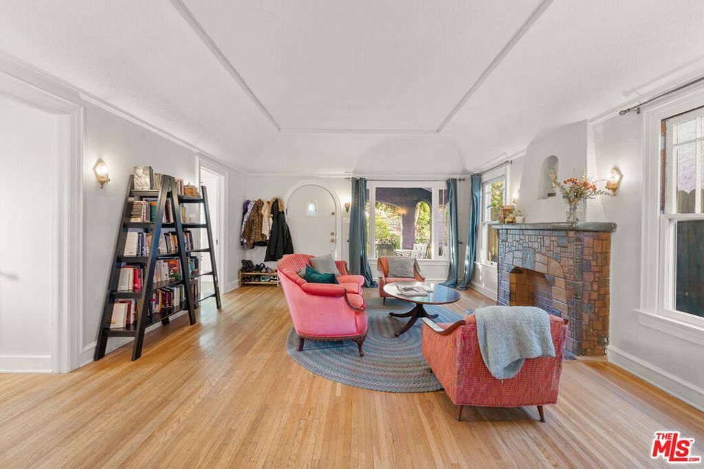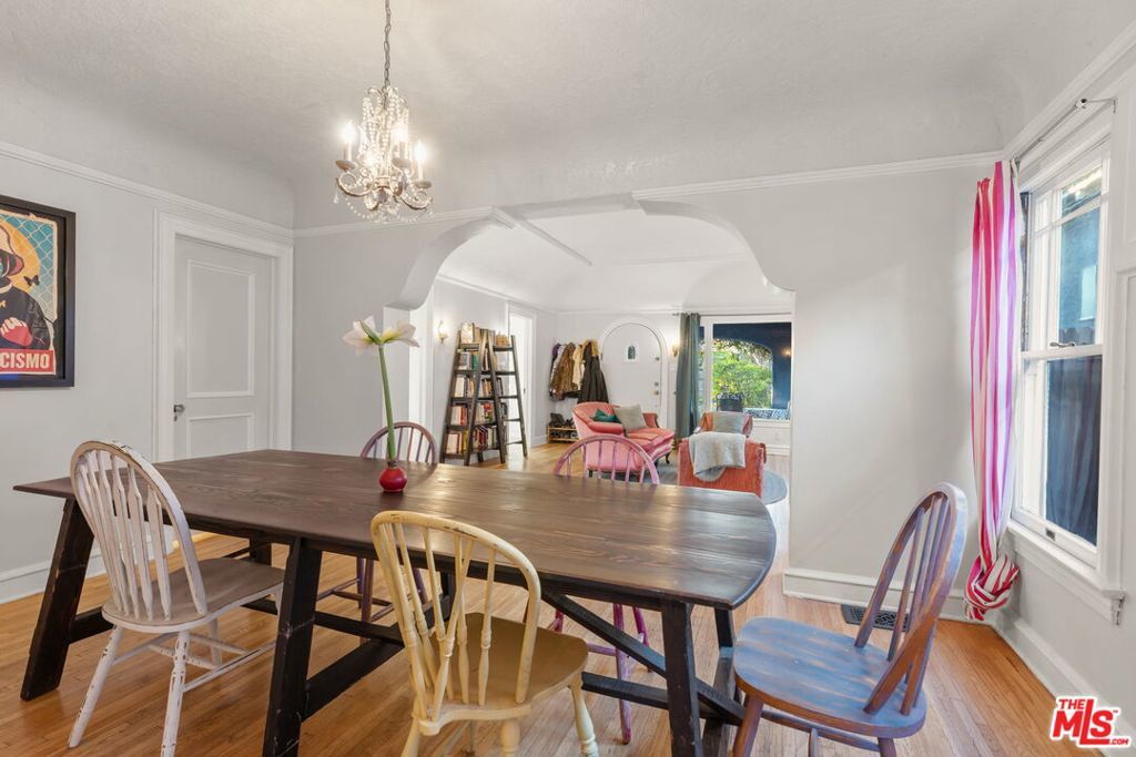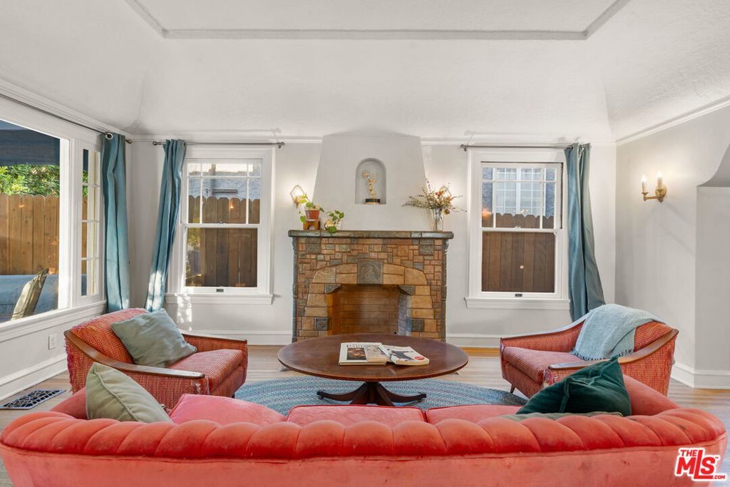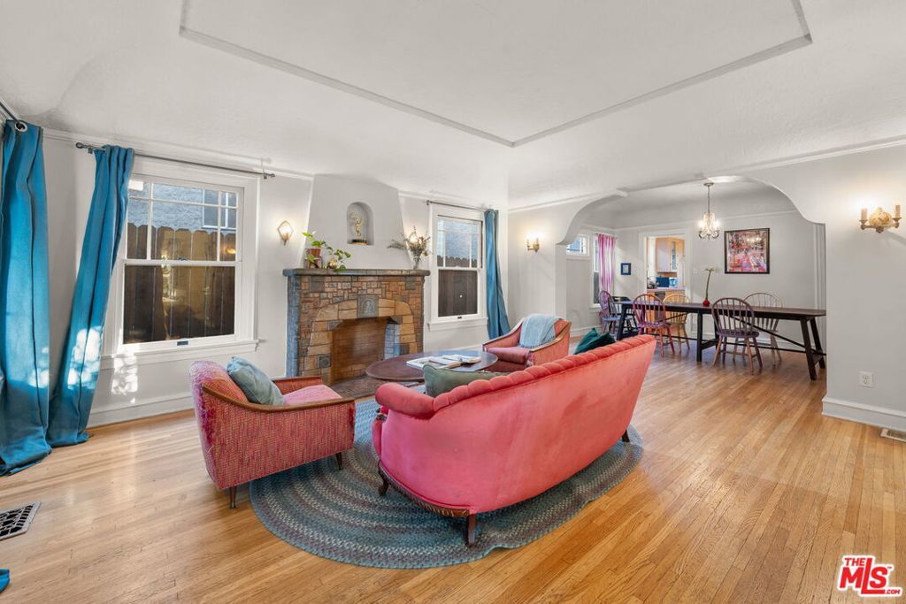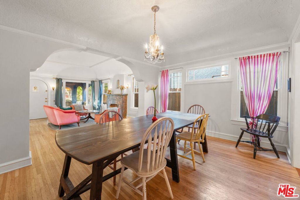Welcome home to this charming 1920's California Spanish bungalow located in Silver Lake. Larger than most homes in the neighborhood, 646 N. Dillon is ready to become your own private sanctuary. With tremendous character, the house includes a must-see rustic family room and a bonus room above the garage. Entering the home through a covered porch, you're greeted by a light-filled living room featuring a high coved ceiling, original hardwood floors, and a Batchelder-inspired decorative fireplace. A draped arch opening leads to the large formal dining room, also with a coved ceiling. The spacious kitchen and adjoining utility room with washer, dryer, and wash basin offer ample opportunity to expand or customize, and elevate every culinary endeavor. The warm "log cabin" style family room has a vaulted ceiling with exposed beams and overlooks the backyard, creating an ideal space for relaxing and entertaining friends and family. Both well-sized bedrooms with crown molding are downstairs and share a recently remodeled Jack-and-Jill bathroom. The bonus room is ideal for a home office, guest bedroom, or fitness room. The private backyard features mature landscaping and access to the attached two-car garage (no direct access to the house). Surrounded by a native California garden and located close to Silver Lake's best restaurants, shops, parks, and the reservoir, this property is perfect for buyers seeking character, charm, and the opportunity to create a very special retreat. This is a true gem waiting for its next owner.