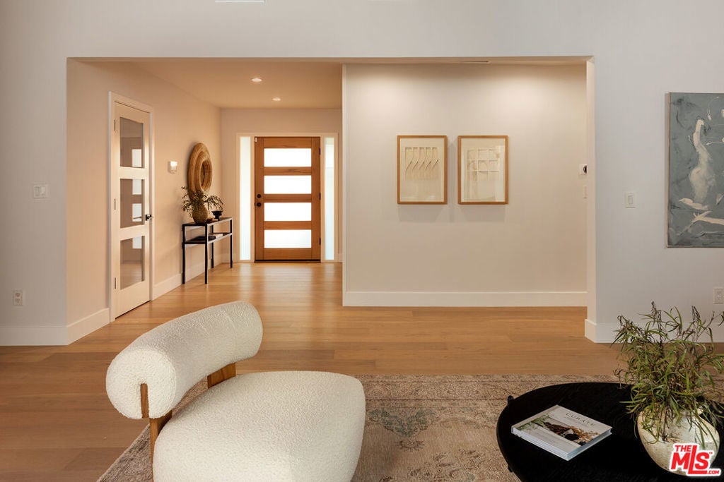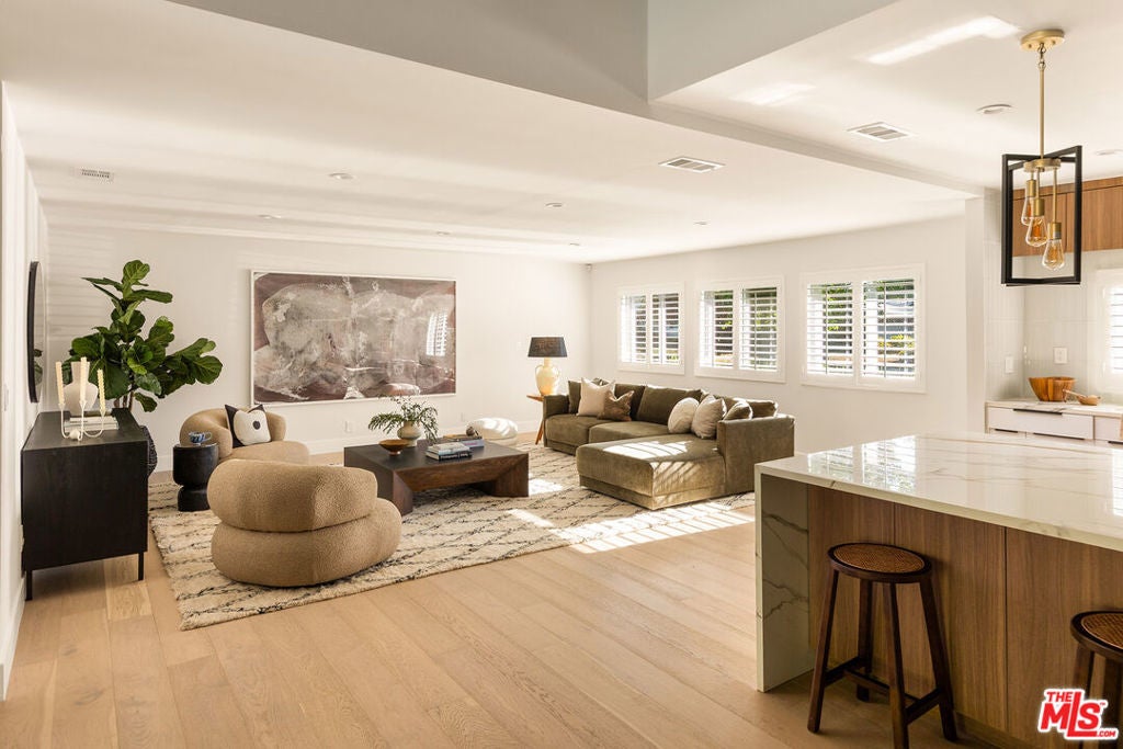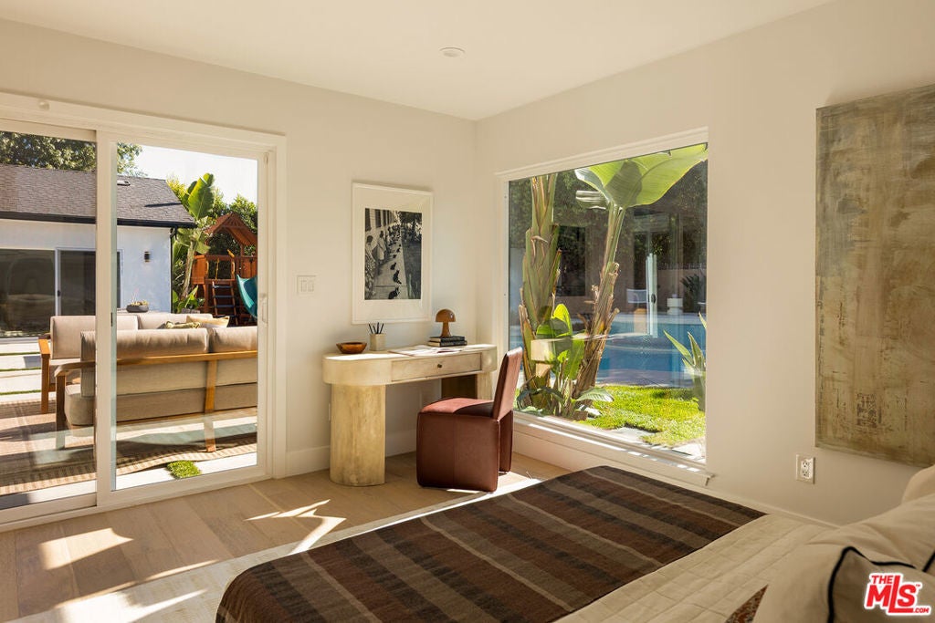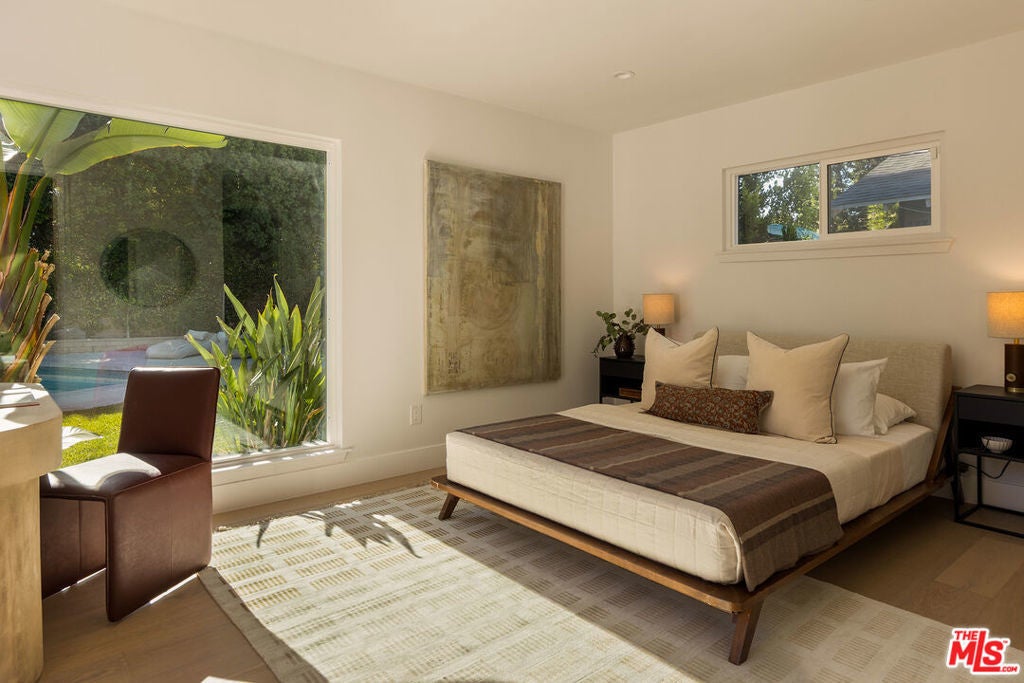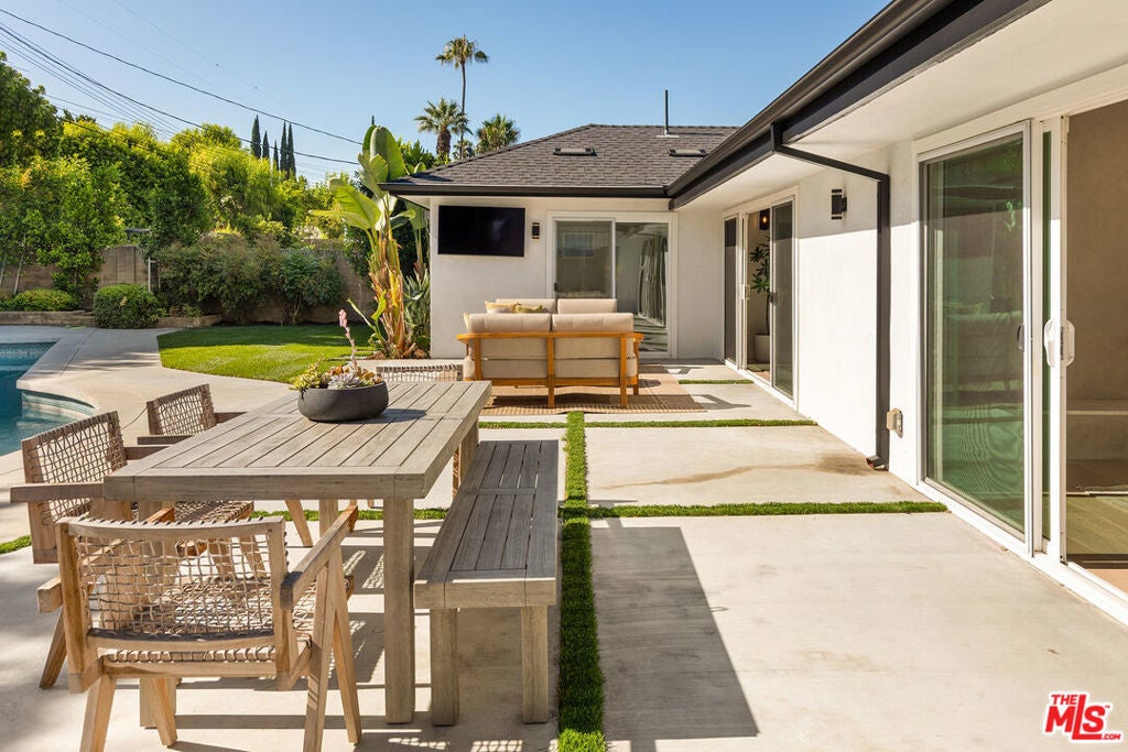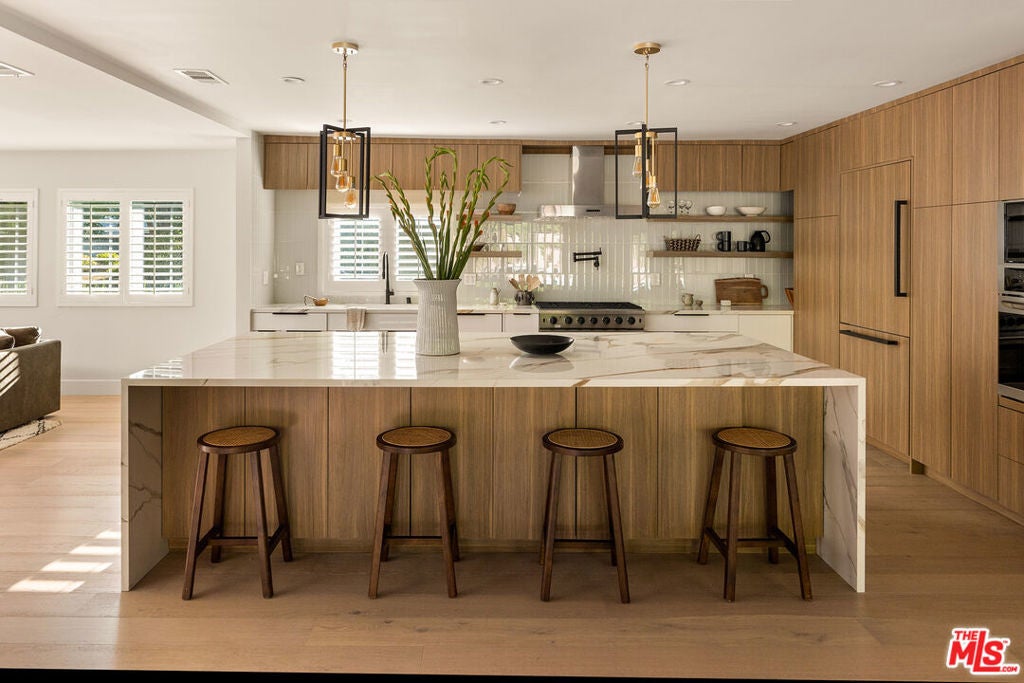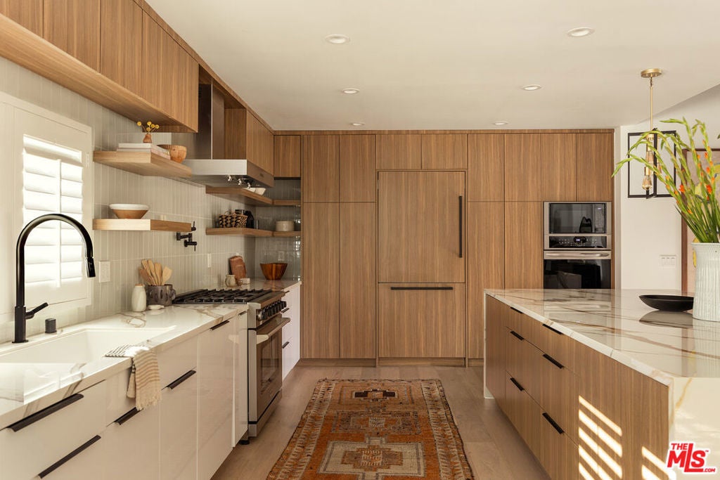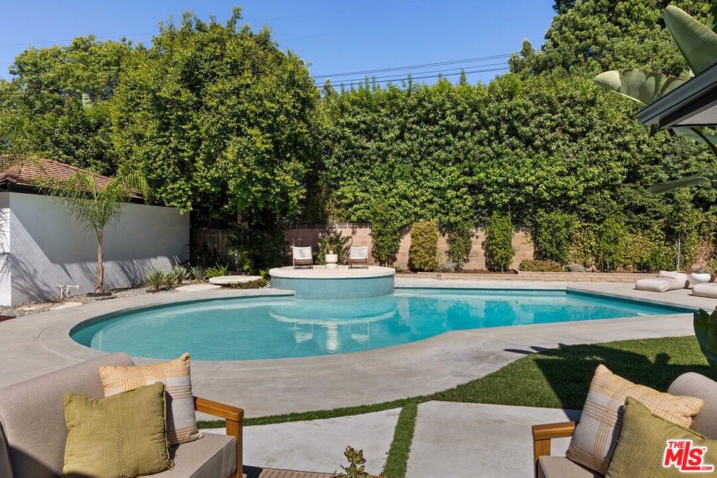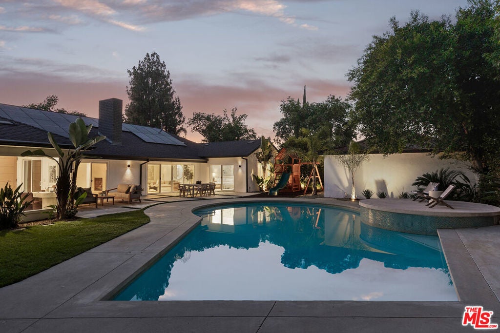 Stunning Mid-Century Charles DuBois Architectural with Pool in Prime Woodland Hills. Located on a desirable corner lot in one of the most sought-after areas of Woodland Hills, this impeccably remodeled Mid-Century Charles DuBois home offers over 3,000 sq ft of thoughtfully designed living space with 4 bedrooms and 3.5 bathrooms. Step through a custom oversized front door into a sun-drenched, open-concept interior featuring soaring ceilings with exposed beams, wide-plank white oak floors, and a dramatic Venetian plaster double-sided fireplace separating the formal living and dining areas. The chef's kitchen is a showpiece designed for both entertaining and everyday living. Highlights include a striking waterfall island, sleek wood and glossy white cabinetry, gold vein Calacatta countertops, and top-tier appliances including a panel-covered Fisher & Paykel fridge, Miele dishwasher, Frigidaire double oven, and Thor gas range. No detail was overlooked in this one-of-a-kind renovation: designer light fixtures, floating vanities, custom accent walls, solid extra-tall wood doors, and premium tile and finish selections throughout. The luxurious primary suite features cathedral ceilings with a central beam, a spa-like bath with a freestanding tub, floating double vanity, oversized walk-in shower, and a massive custom walk-in closet. Additional highlights include a spacious laundry room and pantry with smart controls, and a separate en-suite bedroom located on the opposite wing of the home ideal for guests or multigenerational living. Step outside to a private resort-like entertainer's backyard with newly designed hardscape, lush modern landscaping, and a large sparkling pool. Major upgrades include newer roof, dual HVAC systems, updated electrical panel, tankless water heater, recessed lighting, CAT wiring, plumbing, all new pool equipment and solar panels for the house which offers a huge savings. A detached garage with a private side entrance offers excellent ADU potential. Ideally located near top-rated charter schools, Bristol Farms, Calabasas Commons, Topanga Village, and the beloved local Farmer's Market, with quick access to the 101 freeway. The best value in Woodland Hills based on quality remodel, lot size, privacy and location.