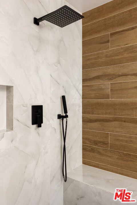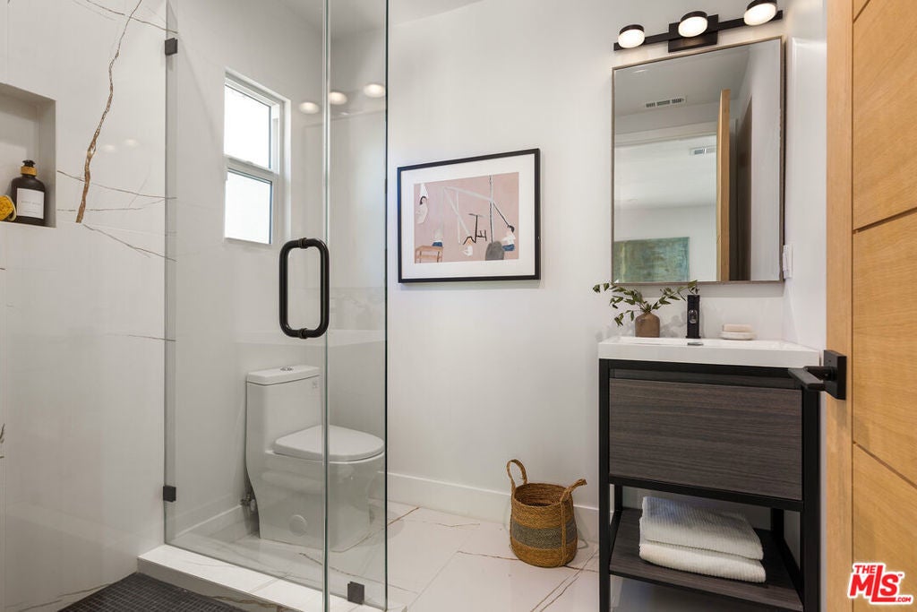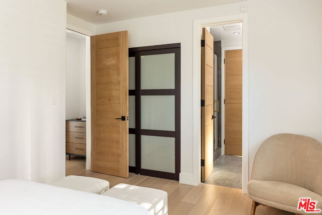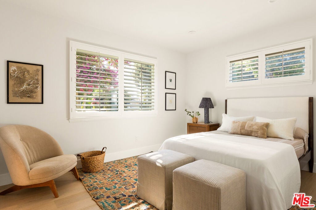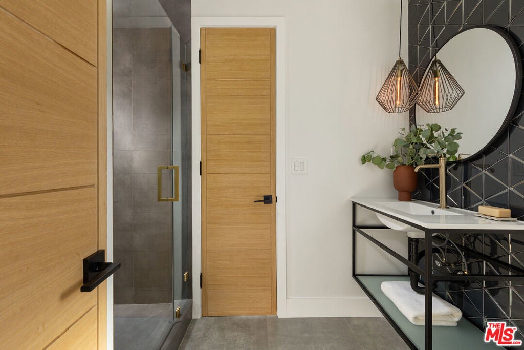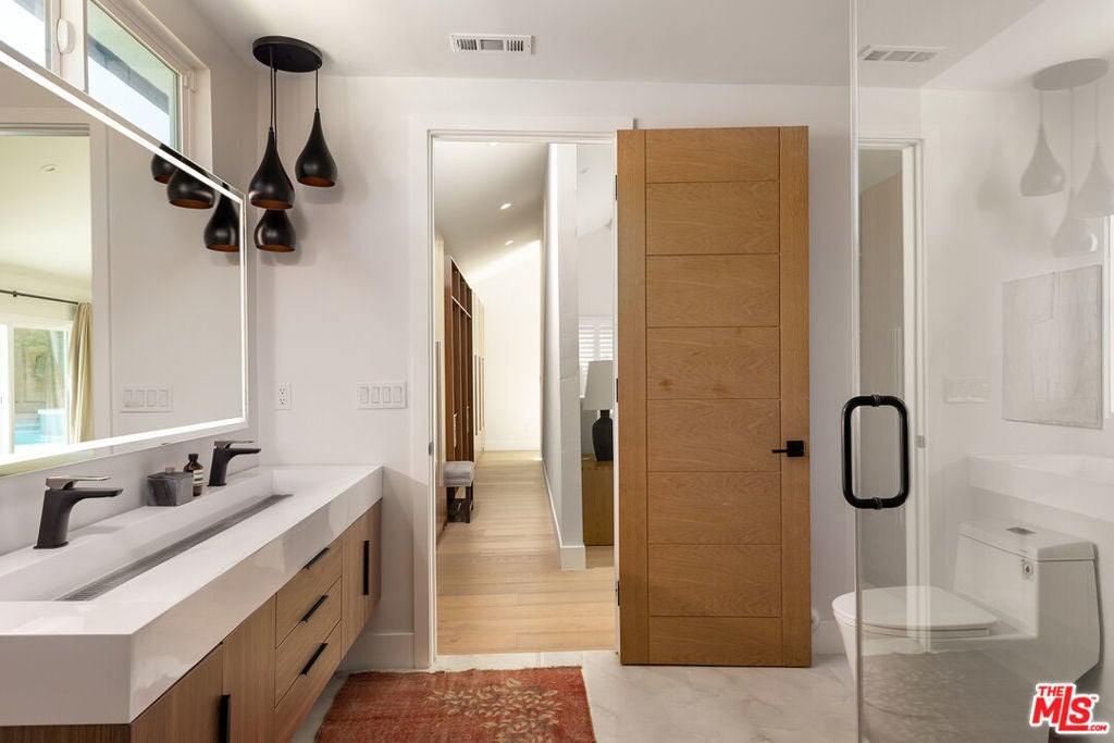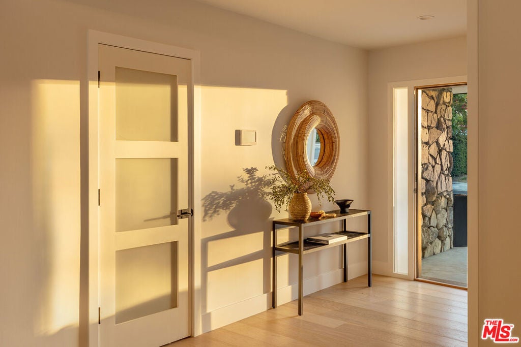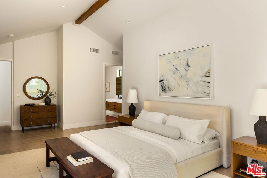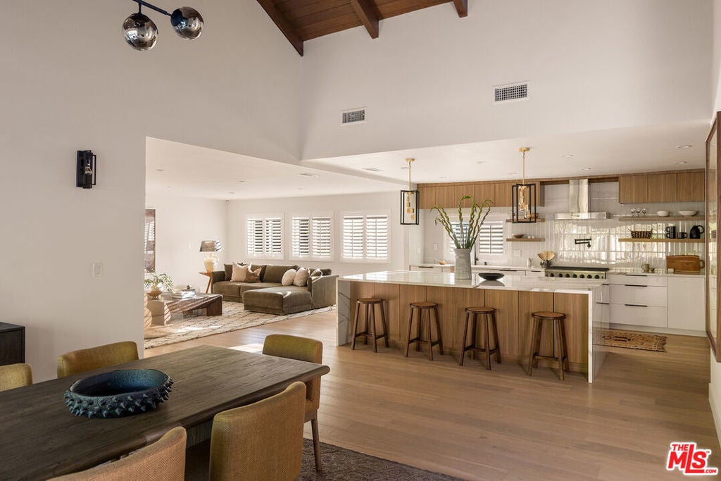 Stunning Mid-Century Charles DuBois Architectural with Pool in Prime Woodland Hills. Located on a desirable corner lot in one of the most sought-after areas of Woodland Hills, this impeccably remodeled Mid-Century Charles DuBois home offers over 3,000 sq ft of thoughtfully designed living space with 4 bedrooms and 3.5 bathrooms. Step through a custom oversized front door into a sun-drenched, open-concept interior featuring soaring ceilings with exposed beams, wide-plank white oak floors, and a dramatic Venetian plaster double-sided fireplace separating the formal living and dining areas. The chef's kitchen is a showpiece designed for both entertaining and everyday living. Highlights include a striking waterfall island, sleek wood and glossy white cabinetry, gold vein Calacatta countertops, and top-tier appliances including a panel-covered Fisher & Paykel fridge, Miele dishwasher, Frigidaire double oven, and Thor gas range. No detail was overlooked in this one-of-a-kind renovation: designer light fixtures, floating vanities, custom accent walls, solid extra-tall wood doors, and premium tile and finish selections throughout. The luxurious primary suite features cathedral ceilings with a central beam, a spa-like bath with a freestanding tub, floating double vanity, oversized walk-in shower, and a massive custom walk-in closet. Additional highlights include a spacious laundry room and pantry with smart controls, and a separate en-suite bedroom located on the opposite wing of the home ideal for guests or multigenerational living. Step outside to a private resort-like entertainer's backyard with newly designed hardscape, lush modern landscaping, and a large sparkling pool. Major upgrades include newer roof, dual HVAC systems, updated electrical panel, tankless water heater, recessed lighting, CAT wiring, plumbing, all new pool equipment and solar panels for the house which offers a huge savings. A detached garage with a private side entrance offers excellent ADU potential. Ideally located near top-rated charter schools, Bristol Farms, Calabasas Commons, Topanga Village, and the beloved local Farmer's Market, with quick access to the 101 freeway. The best value in Woodland Hills based on quality remodel, lot size, privacy and location.