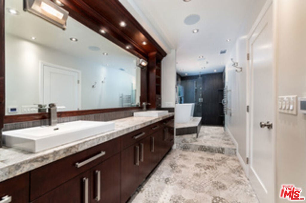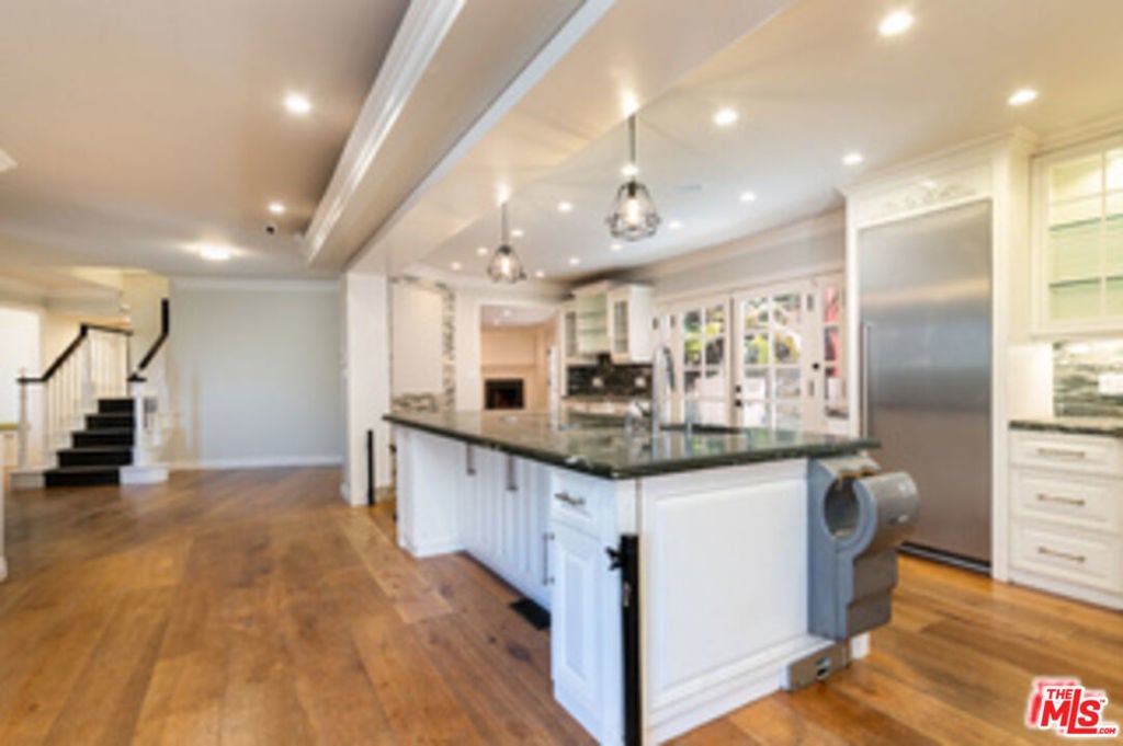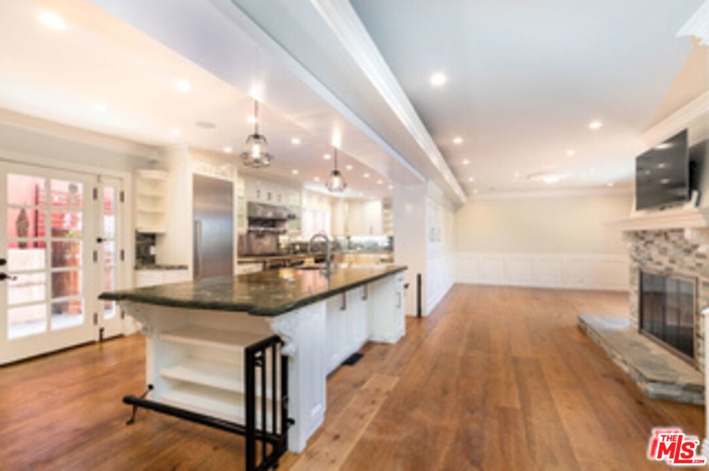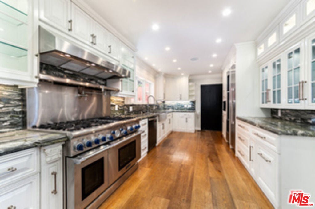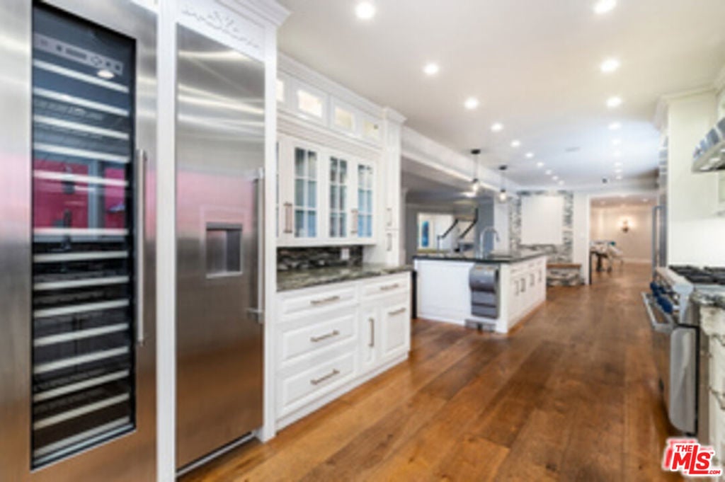 Nestled in the privacy of the prestigious Wrightwood Estates, this quintessential 5 bedroom, 4.5 bath English Tudor boasts over 4,700 square feet and sits above the city offering exceptional views, privacy and security. The front garden slate patio welcomes you home with its mature citrus trees & cascading bougainvillea. Once you enter the home, you're greeted by a grand foyer with French Oak floors that lead you into the formal living room which features a corner fireplace and beautiful sliding French doors. The Gourmet Chef's kitchen is complete with state-of the-art stainless steel appliances and marble counters - 6 burner range, griddle, dual ovens, wine refrigerator, dedicated freezer, and island with prep sink and seating for 5 - the perfect place to entertain. The Formal dining room comfortably seats 10 and leads to a temperature controlled wine room. Once upstairs, you'll delight in a large master suite with a fireplace and dual baths - one with soaking tub and one with spa-tub - a large double shower, dual expansive closets with custom fittings, an upstairs laundry plus 4 other separate guest rooms all with fantastic canyon views and sparkling valley lights. There are Custom features galore throughout this lovely estate from built-ins, in ceiling surround sound speakers, to an outdoor entertaining space featuring a built-in kitchen with sink, BBQ, and griddle. Great location for valley/city access and some of LA's best shopping, dining, and live sports/event venues.