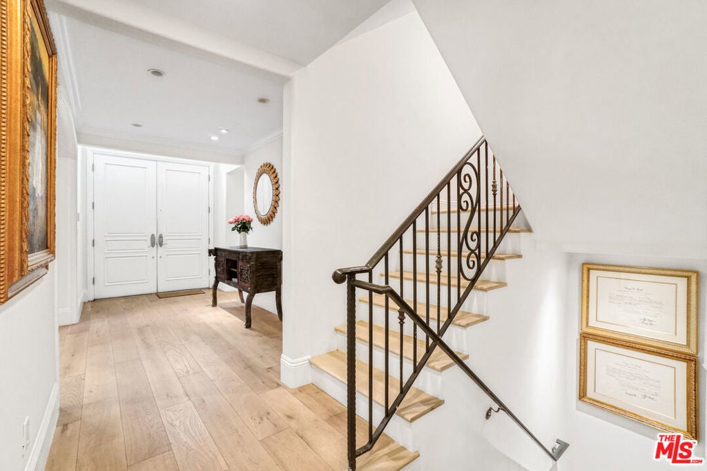 This exceptional, fully furnished residence is nestled in the heart of the highly sought-after Brentwood neighborhood, just steps from San Vicente Boulevard and the vibrant Sunday farmers market. Part of an exclusive, gated Mediterranean-style complex with only 8 townhomes, this rare, expansive townhouse offers the privacy and feel of a single-family home. Enjoy direct access to a 2-car garage, a private elevator servicing all floors, 4 spacious bedrooms plus a family room, loft, and a large private rooftop deck. Inside, the living room impresses with high vaulted ceilings and a cozy fireplace, while the open dining area features a chandelier. The chef's kitchen is equipped with top-tier appliances, including a Viking range, Subzero refrigerator, wine fridge, and a large center island, perfect for entertaining. The master suite is a luxurious retreat with a walk-in closet, en suite bathroom, private patio, and its own fireplace. The private rooftop terrace offers stunning city views, making it the ideal spot to relax or entertain. This sophisticated property offers a premium lifestyle in Brentwood, providing the perfect alternative to a single-family home in a prime location.