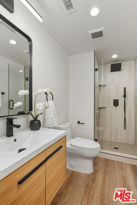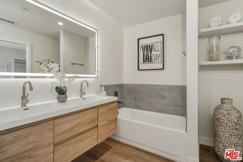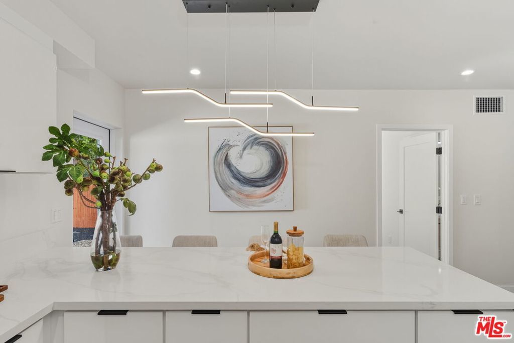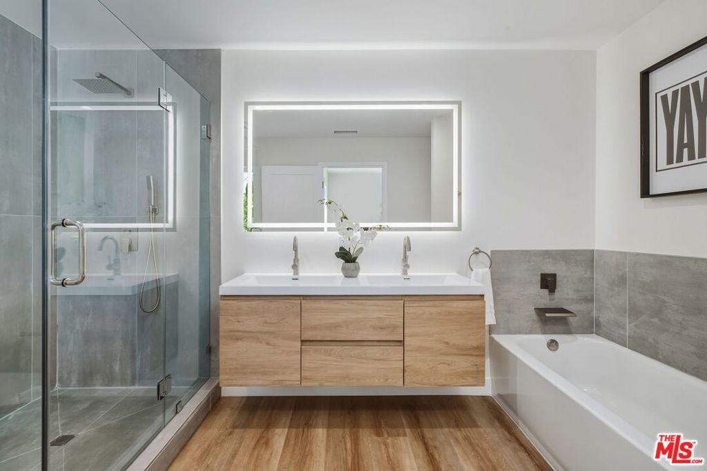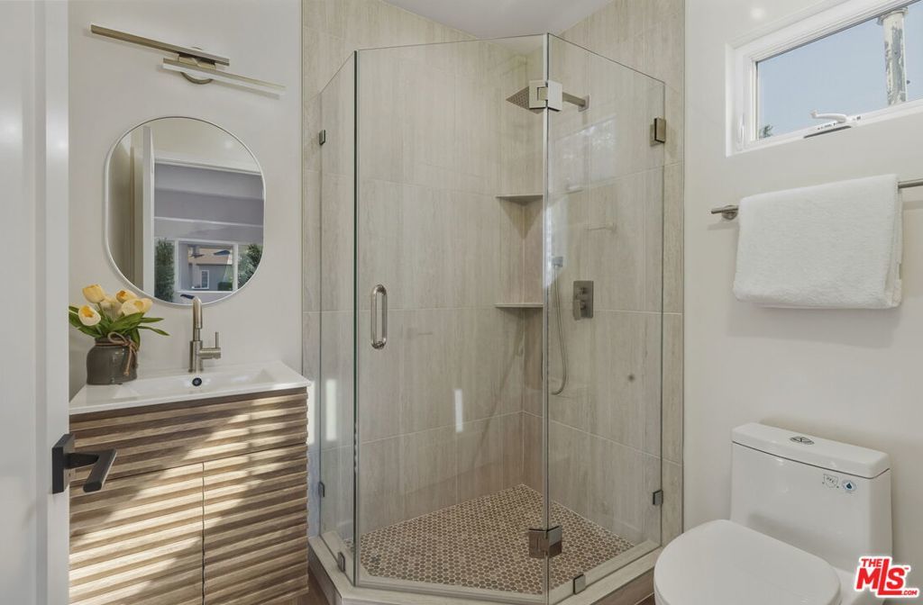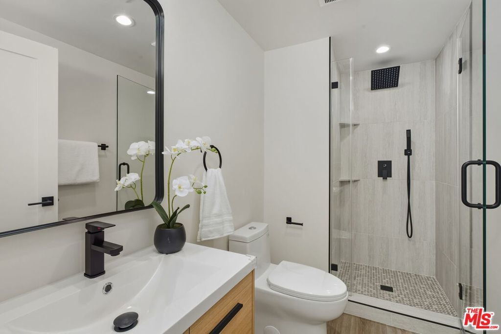 Newly renovated inside & out and expanded Westide 4 bed/4.5 bath stunning Contemporary style home with spectacular designer finishes throughout. Covered front porch opens to dramatic high vaulted ceiling spacious living room and dining filled with natural light. All new kitchen with the latest modern cabinetry, stainless steel appliances including gas range and oven, quartz countertops with waterfall edge breakfast bar and door with glass panel leading to backyard. 3 bedrooms all with ensuite remodeled bathrooms with tile finishes. 2nd story stairway with contemporary glass railing leads to stunning spacious primary suite with sliding door to private balcony, separate office/den area, 2 separate walk-in closets and luxurious primary bath with dual basins and separate bath and shower and linen shelving. Additional features include newly replaced dual-pane windows throughout, central ac/heat, contemporary wood-like flooring throughout, all new bathrooms, large laundry room on main level. Close proximity to UCLA, Sawtelle restaurants and shops, Westfield Century City and 405/10 fwy access. Move-in ready!