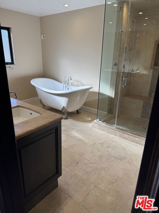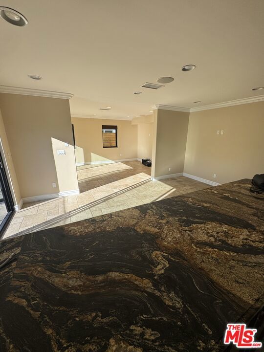 Resort-Style Living with Private Sport Court, Pool & Spa !!!~~~This expansive contemporary ranch style residence offers an open, light filled layout designed for both everyday comfort and effortless entertaining. Wide stone tile flooring flows seamlessly throughout the main living spaces, complemented by smooth ceilings, crown molding, recessed lighting, and integrated ceiling speakers across multiple rooms. The kitchen is a true centerpiece, featuring rich dark wood cabinetry with crown detailing, polished granite countertops, and a full height stacked stone backsplash. The space offers dual prep areas with a large central island with built in sink and dishwasher, plus a secondary island with built in microwave and additional storage. Sliding glass doors and a large kitchen window provide abundant natural light and direct access to the backyard. Multiple living areas create flexibility for entertaining, media use, or quiet relaxation. Large sliders throughout the home open to the rear patio, creating exceptional indoor outdoor flow. The rear yard is finished with full width stone pavers and showcases a long rectangular swimming pool with elevated built in spa, positioned parallel to the home for a clean, modern look. Wood privacy fencing lines the yard for a secluded atmosphere. Below the pool level, a rare full size sport court with dual basketball hoops adds a unique recreational element to the property. A dedicated stairway with wood railing connects the sport court to the main yard level. The home blends timeless ranch proportions with contemporary finishes, offering a functional single level flow through the main living areas, expansive glass doors, and thoughtfully designed outdoor living space.