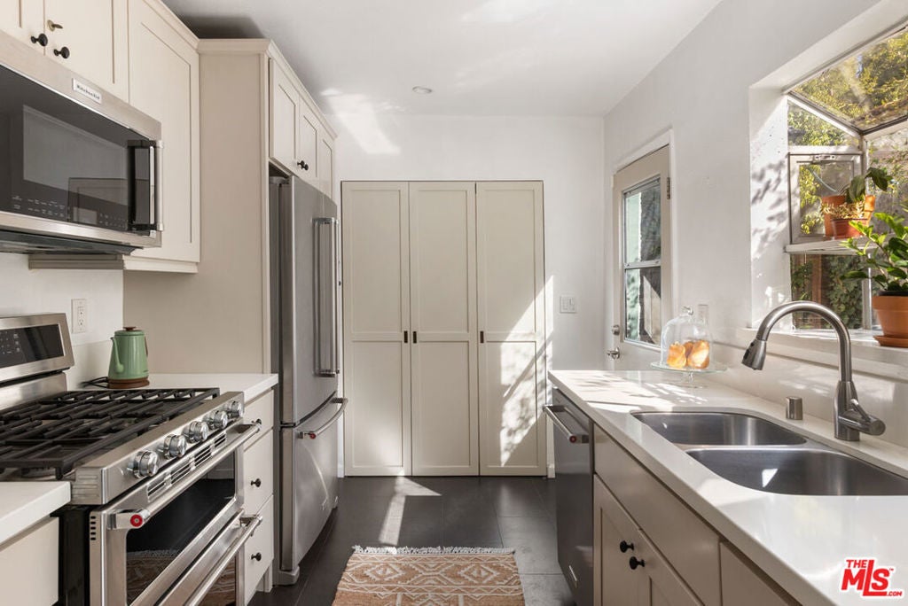 Have it all in Silver Lake with this 1925 Spanish, a private hillside retreat filled with sunlight, character, and thoughtful updates. The light-filled living room is a warm, inviting space with built-ins and an arched passthrough to the charming dining room; wood floors flow throughout. Meal prep is easy in the bright galley kitchen, finished with quartz countertops, stainless appliances, and a walk-in pantry with laundry. Two bedrooms include a serene ensuite primary with a walk-in closet and a remodeled bath, plus a powder room for guests. The lower suite with a separate entrance and bath adds flexibility for visitors or creative work. The lush, secluded yard feels like an idyllic escape with terraced gardens, mature trees, and plenty of space to dine, lounge and gather. Amenities include HVAC, laundry, and a garage with storage. From this tranquil perch, you're moments from Bar Siesta, L&E Oyster Bar, Lamill Coffee, and the Silver Lake Reservoir.