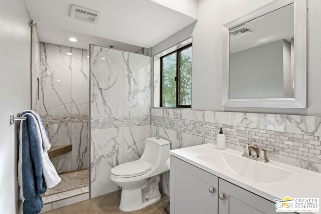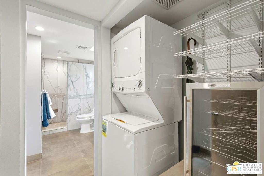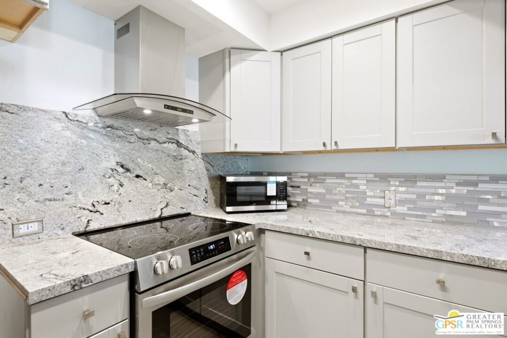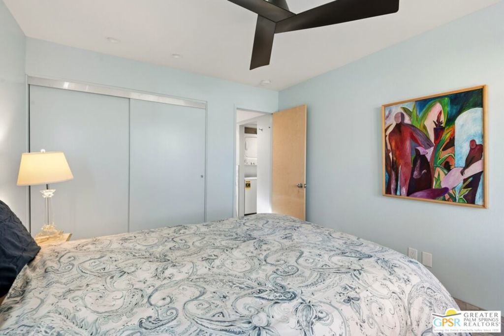 Welcome to this beautifully renovated 1-bedroom, 1-bath ground-floor condo at the highly desirable Riviera Gardens! This end unit is just steps from one of the community's sparkling pools and spas, with convenient covered carport parking nearby. The home has been completely transformed with a comprehensive remodel - the original accordion doors between dining and bedroom were replaced with a proper wall, creating true separation and a dedicated dining space with better privacy and flow. The kitchen features all new stainless steel appliances including dishwasher, microwave, range/oven, and refrigerator, and has been intelligently reconfigured for improved walk-through access. Updated throughout with tile flooring, updated bathroom, expanded bedroom closet, and a walk-in laundry area housing stackable washer/dryer. The living area opens to a private covered patio with green belt views, perfect for relaxing. This gated, resort-style community sits on fee-simple land you own (no land lease!) and offers lush mature landscaping, multiple heated pools and spas, and controlled access. Located minutes from uptown and downtown Palm Springs dining, shopping, and entertainment, yet tucked away in a peaceful setting. Ground-floor convenience, end-unit location, pool-adjacent positioning, and complete updates make this perfect as a primary residence, vacation getaway, or investment property. Move-in ready and waiting for you!