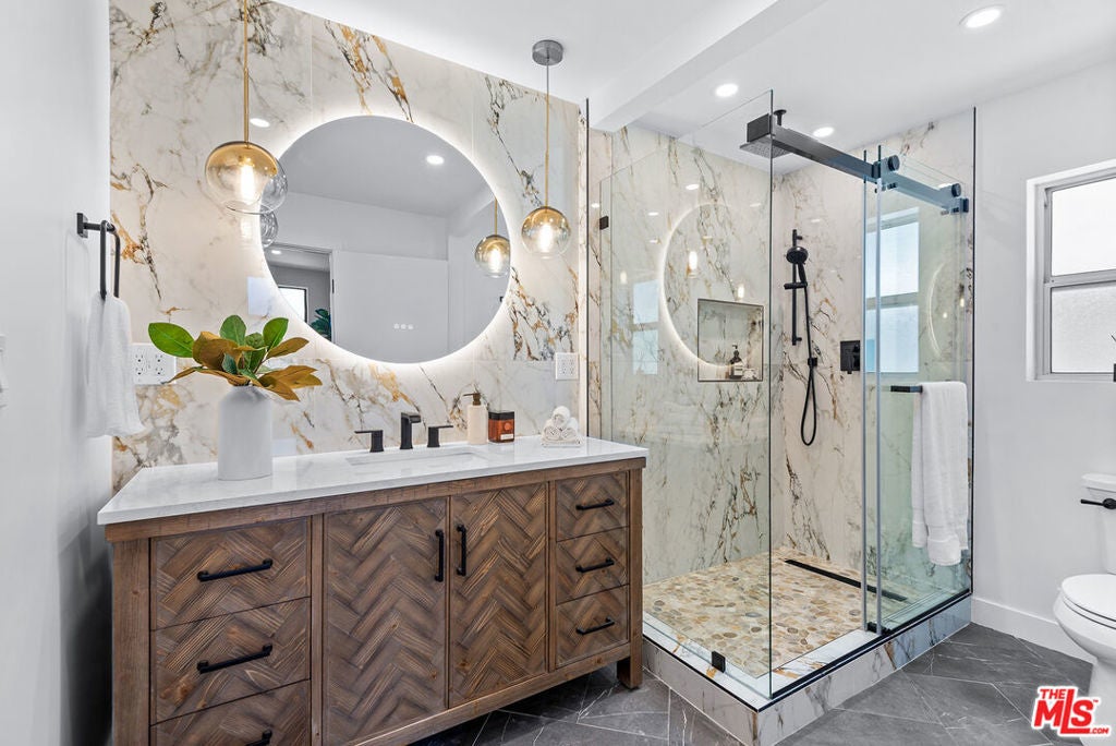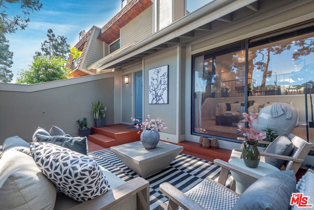 This exquisitely renovated corner townhome features two bedrooms, two bathrooms, and is located in the highly desirable Villa Velletri community of Marina Del Rey, only steps from the Marina Marketplace shopping and entertainment center. Designed with maximizing luxury, sophistication and comfort in mind, you will entertain on a grand scale in your 1,398 sqft living space. This one-of-a-kind home boasts a Modern Italian style, offering tons of natural light, wide oak vinyl floors, recessed LED lighting, and updated electrical outlets, dimmers, and switches throughout. Pass through the front door into a spacious living room with high ceilings, an elegant porcelain electric fireplace and a designer organic chandelier, and enjoy the relaxing view of your south-facing patio (Approx. 250 sf) with new gas BBQ hookups and electrical plugs. The designer kitchen shines with soft close glossy white and walnut cabinets with tons of storage, white quartz countertops, dramatic porcelain backsplash, Samsung stainless steel appliances, a built-in pantry with hidden microwave outlets, a built-in trash pull out, and a custom breakfast bar or workstation area. The dining level is perfect for entertainers and features a custom bar or storage area in walnut with white quartz countertops, dramatic porcelain backsplash. The primary suite offers an en-suite spa-like bathroom unique backlit circular vanity mirror flanked by pendant lights above a designer vanity, a walk-in shower with a ceiling mounted showerhead and a convenient hand shower, and his and hers walk-in closets with custom closet organizers already installed, and a striking smoked glass slider for the larger walk-in. Dramatic porcelain tile stretches from floor to ceiling, and includes a herringbone pattern on the bath floor and a pebble pattern on the shower floor. The guest bedroom offers plenty of natural light and closet space, and can easily flex to function as an office. The guest bath has been elegantly upgraded with new floor to ceiling tile, new pebble shower and bath tile, a designer vanity with brushed gold plumbing and lighting fixtures. Upgrades also include 220V plug for EV charger in the attached two car garage, updated electrical panel, LED recessed lights, updated laundry hookups, and freshly painted ceilings and walls. Villa Velletri is a gated community with lush landscaping, 4 pools and spas, clubhouse, and ample guest parking. Enjoy the Marina lifestyle. Close to world famous beaches, Abbot Kinney, trendy shops/restaurants, movie theaters, Marina access, LAX and more! Villa Velletri HOA includes water, trash, high speed Spectrum internet and cable, EQ insurance, and association insurance. **For Showings call Will Robertson 310-889-5729**
