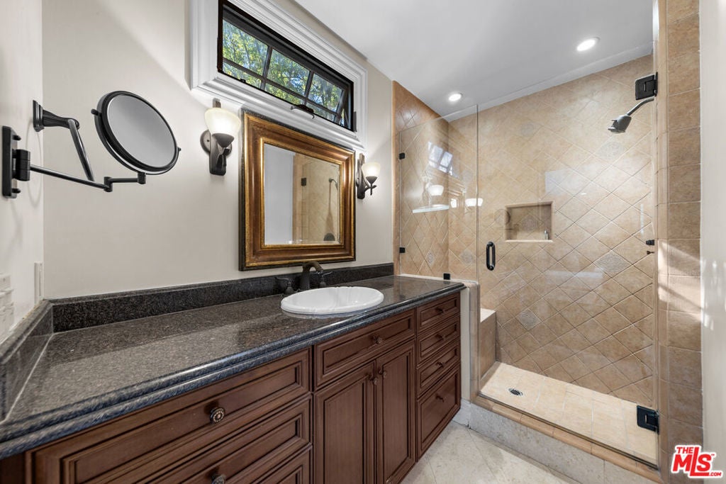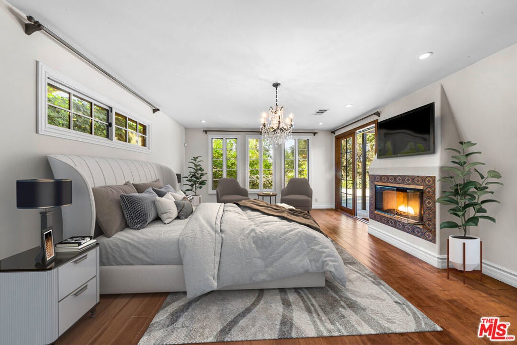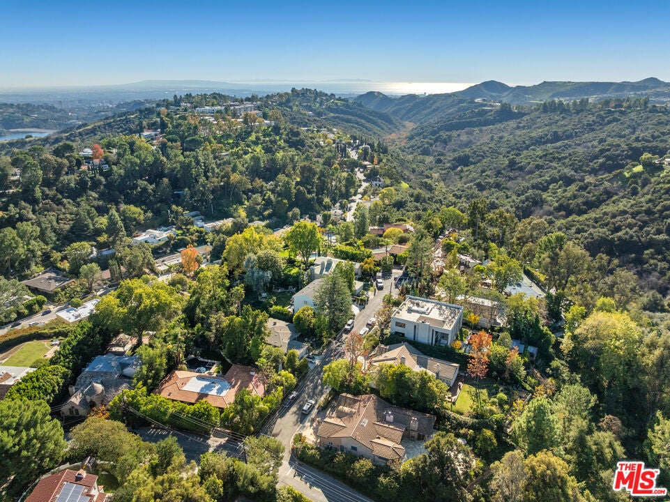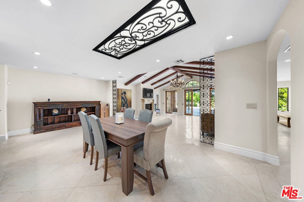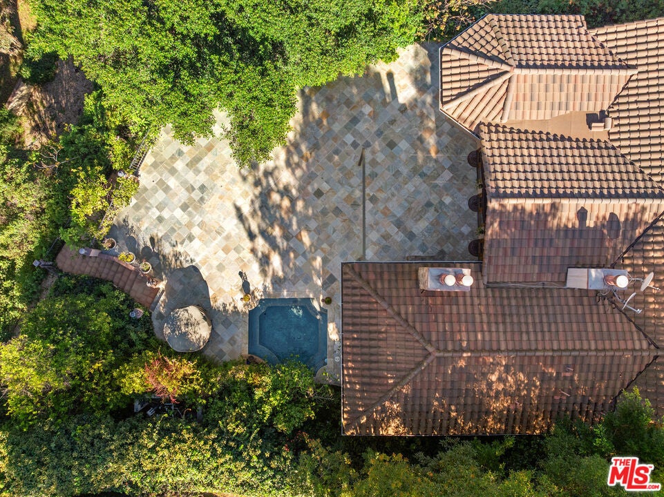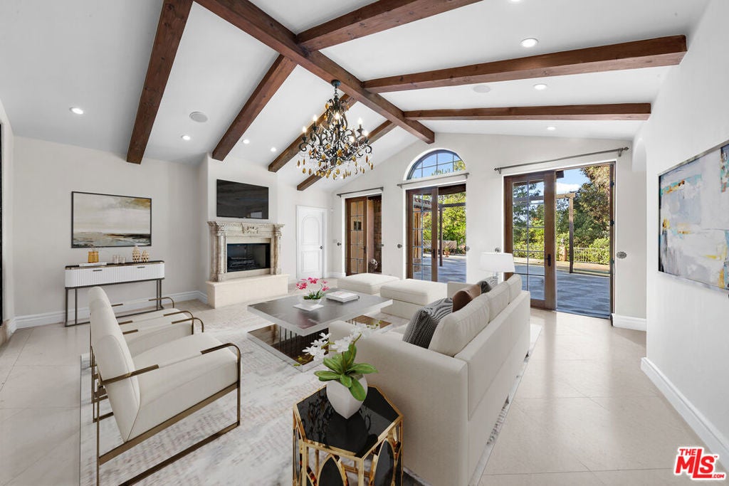 Perched at the top of Bel Air, this thoughtfully designed residence blends timeless Spanish-inspired architecture with welcoming indoor-outdoor living. Exposed wood beams, elegant chandeliers, and a grand stone fireplace anchor the spacious living room, while oversized French doors flood the space with natural light and open directly onto the expansive patio. Warm finishes, rich wood accents, detailed craftsmanship, and refined materials create an atmosphere that is both sophisticated and inviting throughout. The outdoor living areas offer a serene retreat, featuring a generous stone-tiled terrace, a charming outdoor fireplace, and multiple points of access from the main living spaces. A private spa with arching water features is set against lush landscaping, providing a tranquil backdrop for relaxation or entertaining. The primary suite includes hardwood flooring, a cozy corner fireplace with decorative tile surround, and direct access to the patio for effortless outdoor enjoyment. The adjoining walk-in closet offers extensive built-in cabinetry and shelving for well-organized storage. Exterior highlights include a classic clay tile roof, wrought-iron details, mature greenery offering privacy, and a beautifully crafted front entry framed in stone. An aerial perspective showcases the property's generous outdoor layout and inviting curb appeal. Situated in the desirable Roscomare Elementary School district and offering exceptionally easy access to the freeways, this home provides both convenience and sought-after location. Some rooms have been virtually staged.